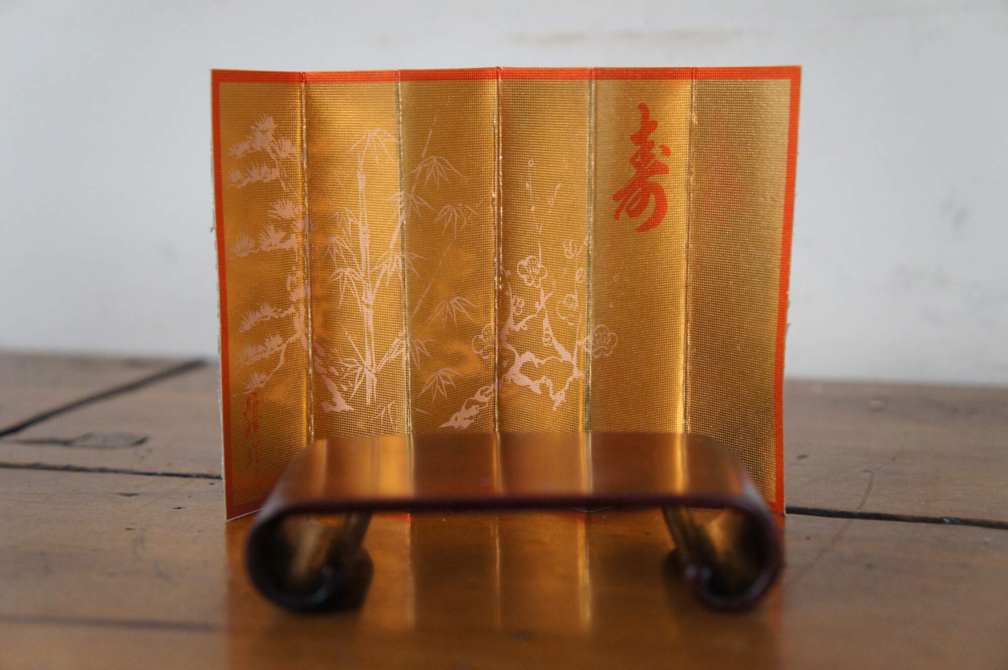 Pair of late 20th century painted ceramic bells in the shape of two animals from the Japanese zodiac – a white snake and a golden ox. Comes with one decorative stand, miniature folding screen, and label plaque. Produced by Seto Pottery Company, Ltd.