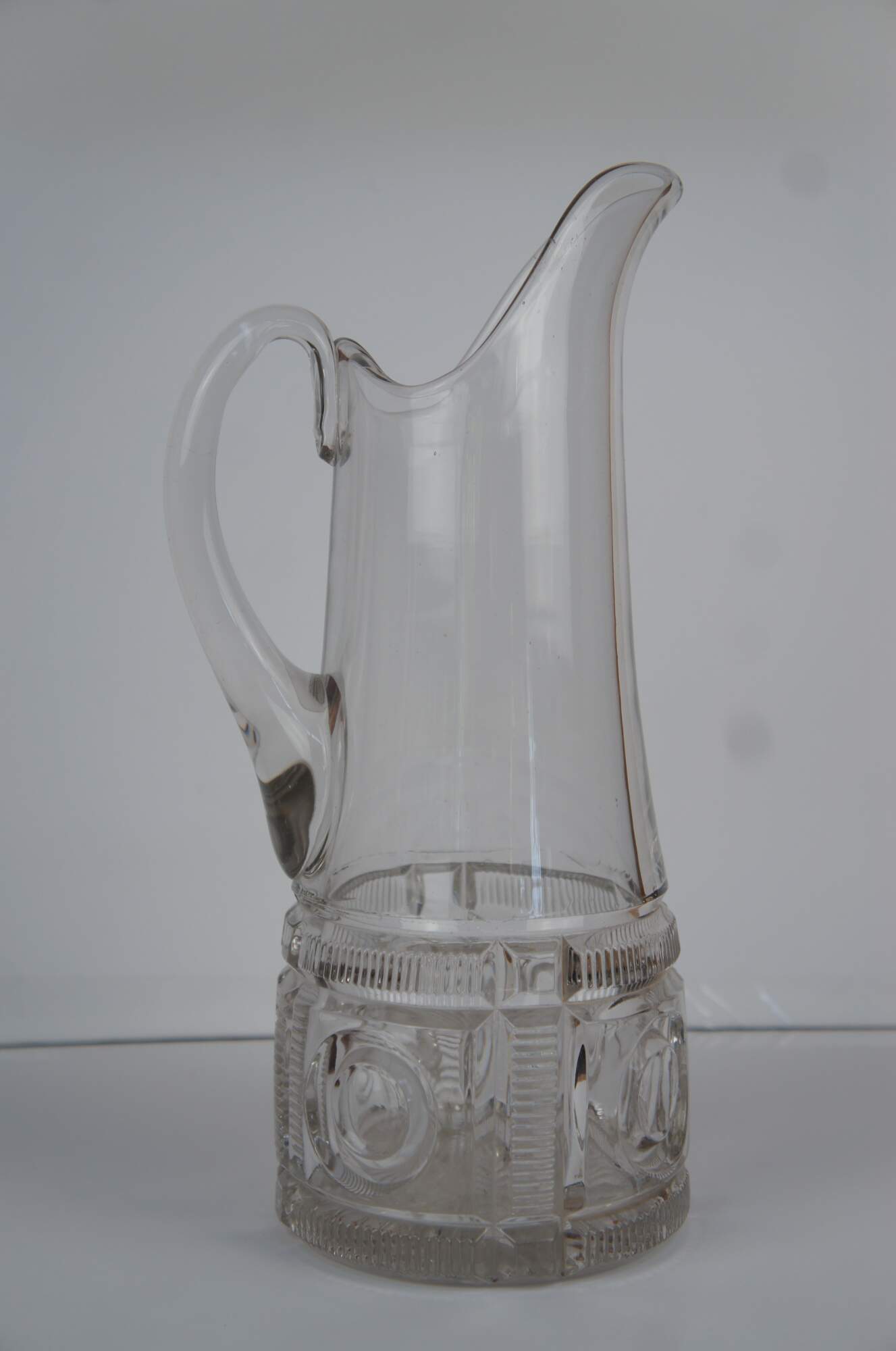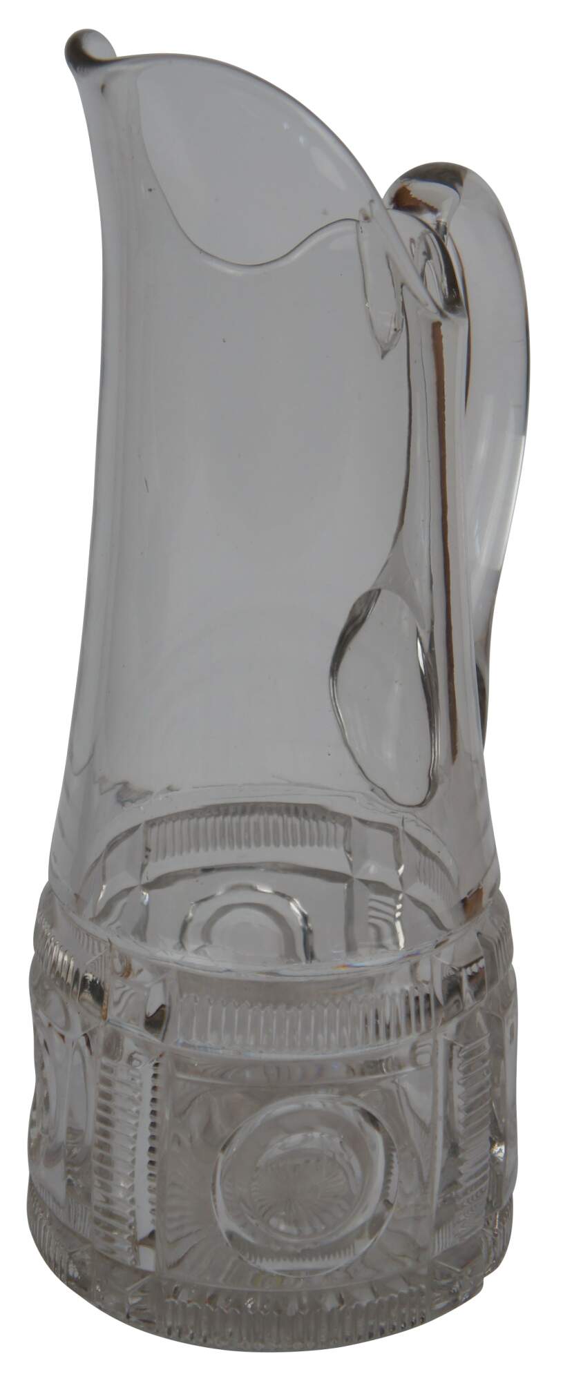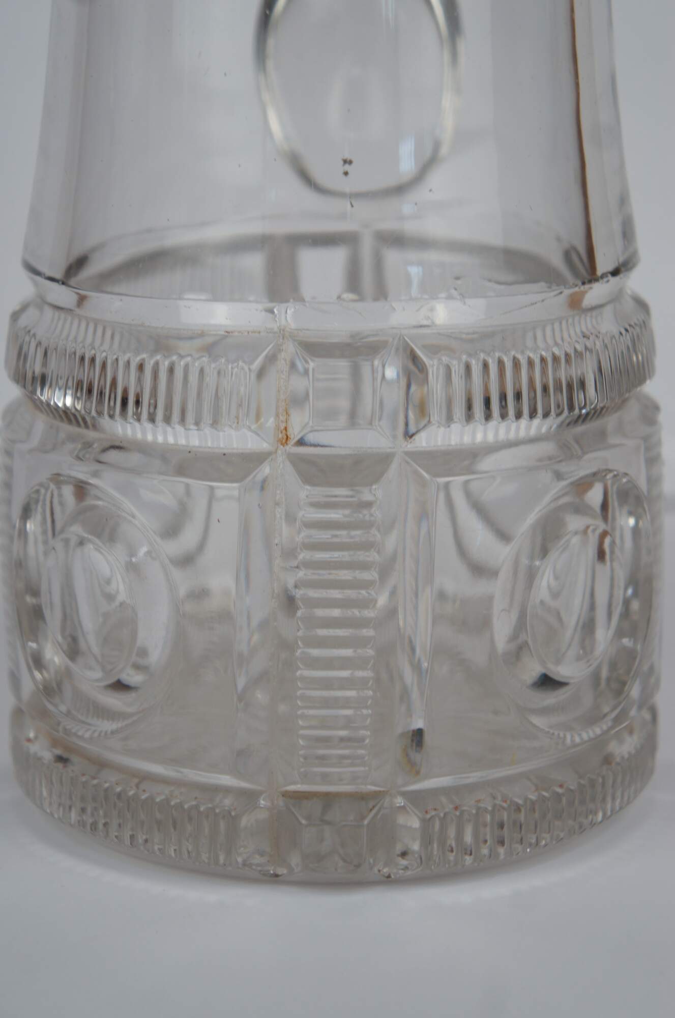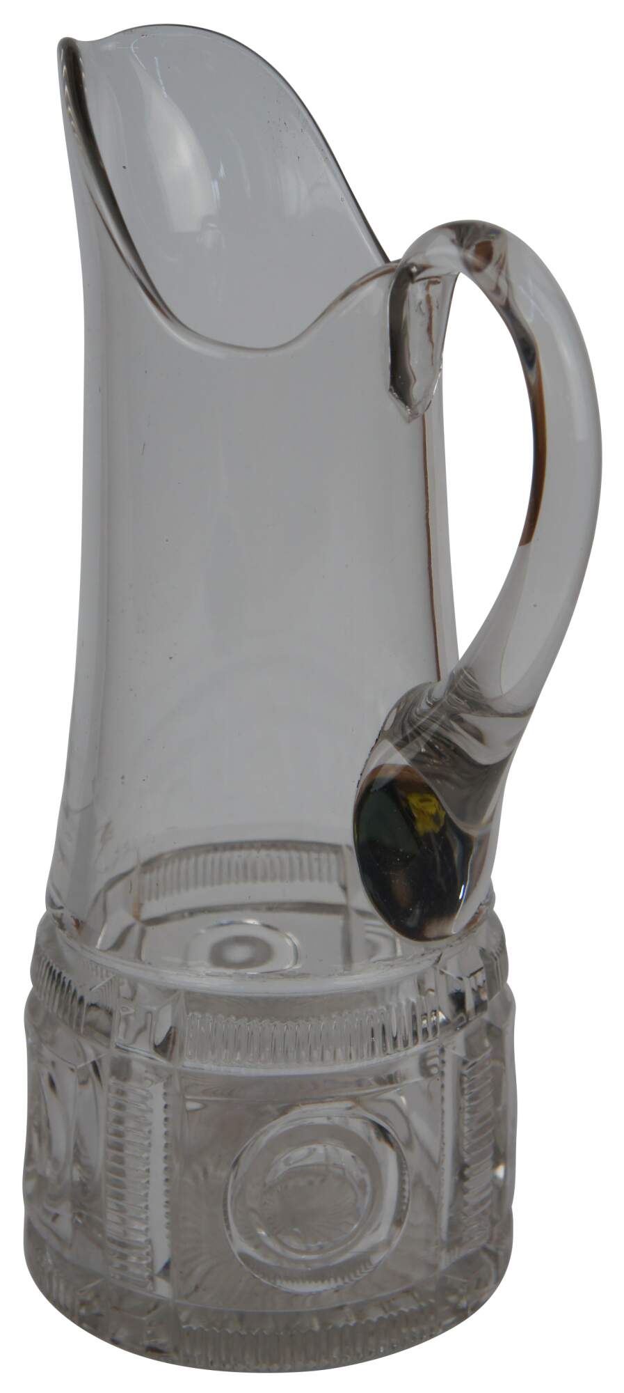 Antique pressed glass pitcher featuring smooth tapered upper and handle with geometric art deco base.