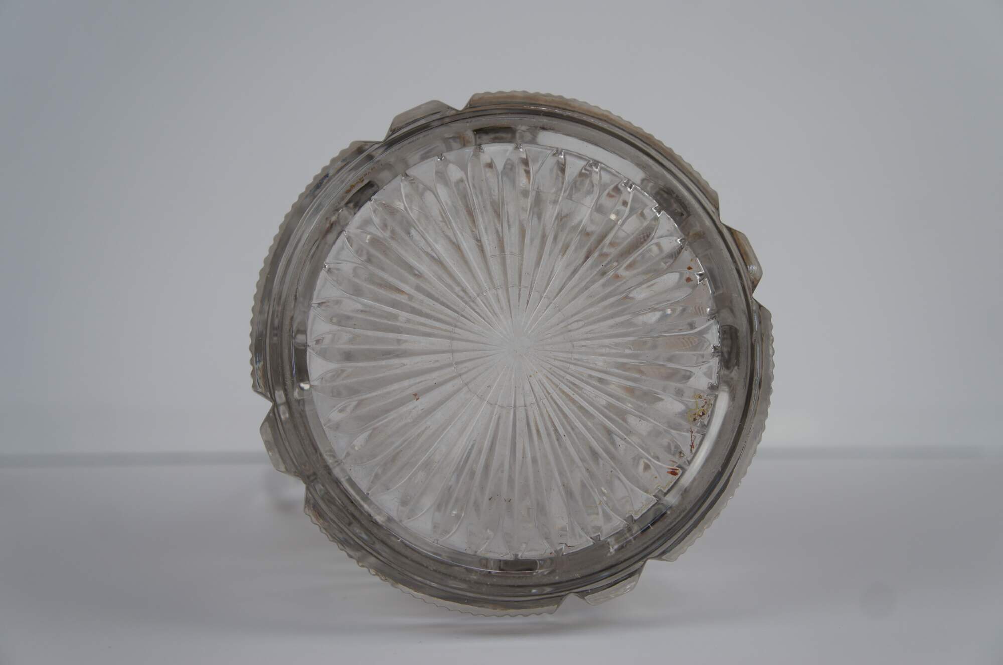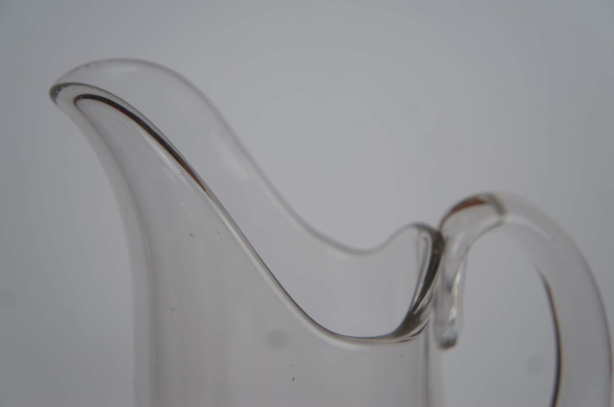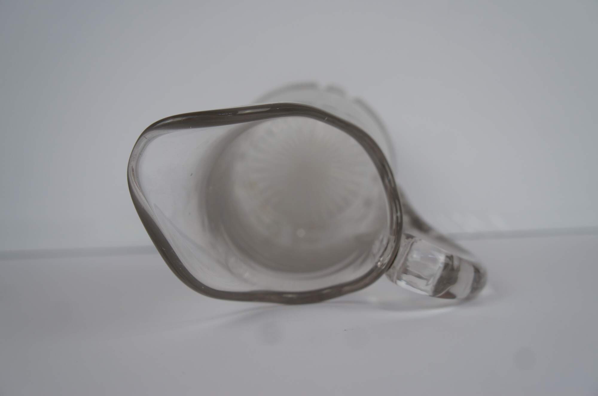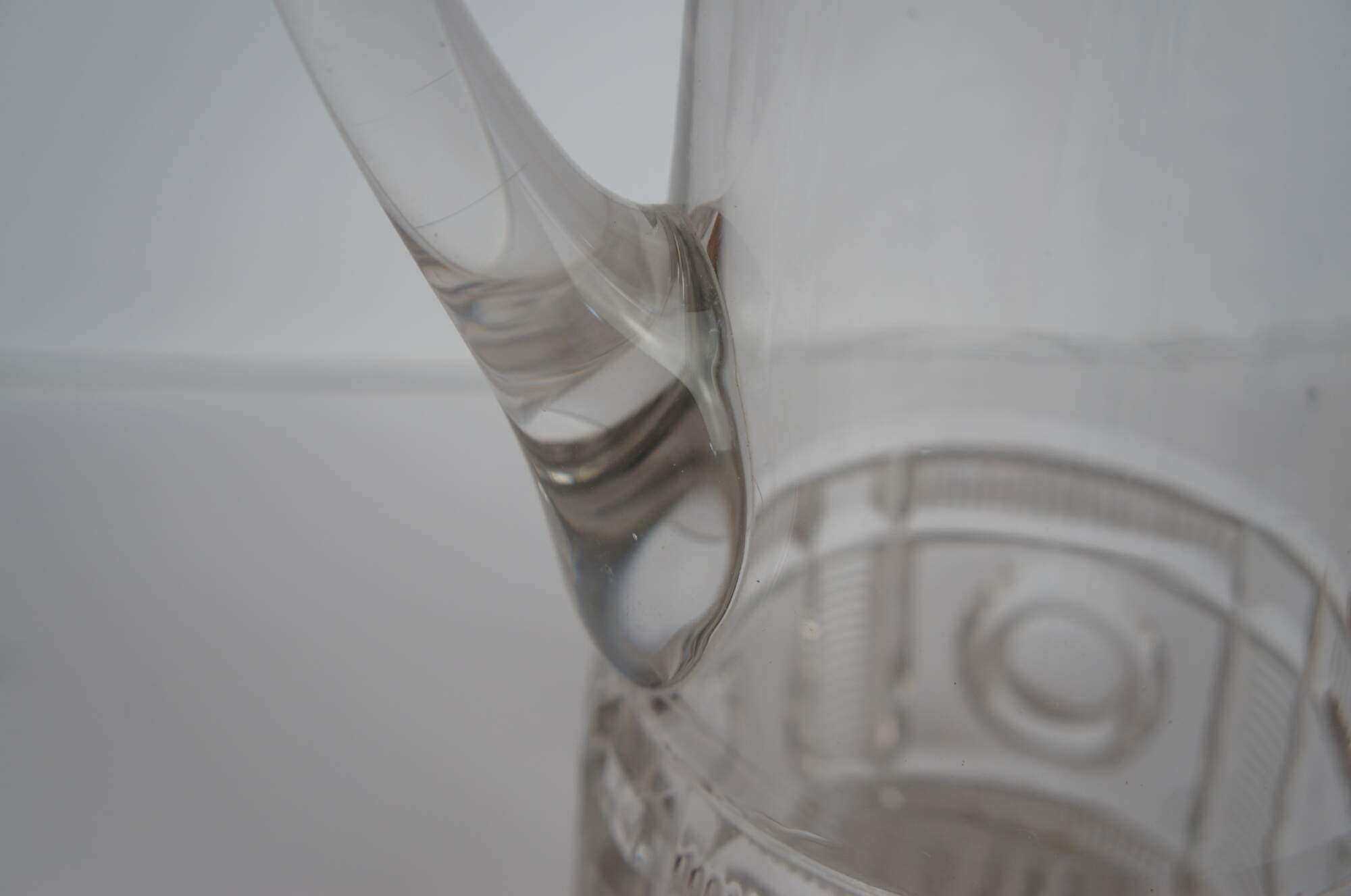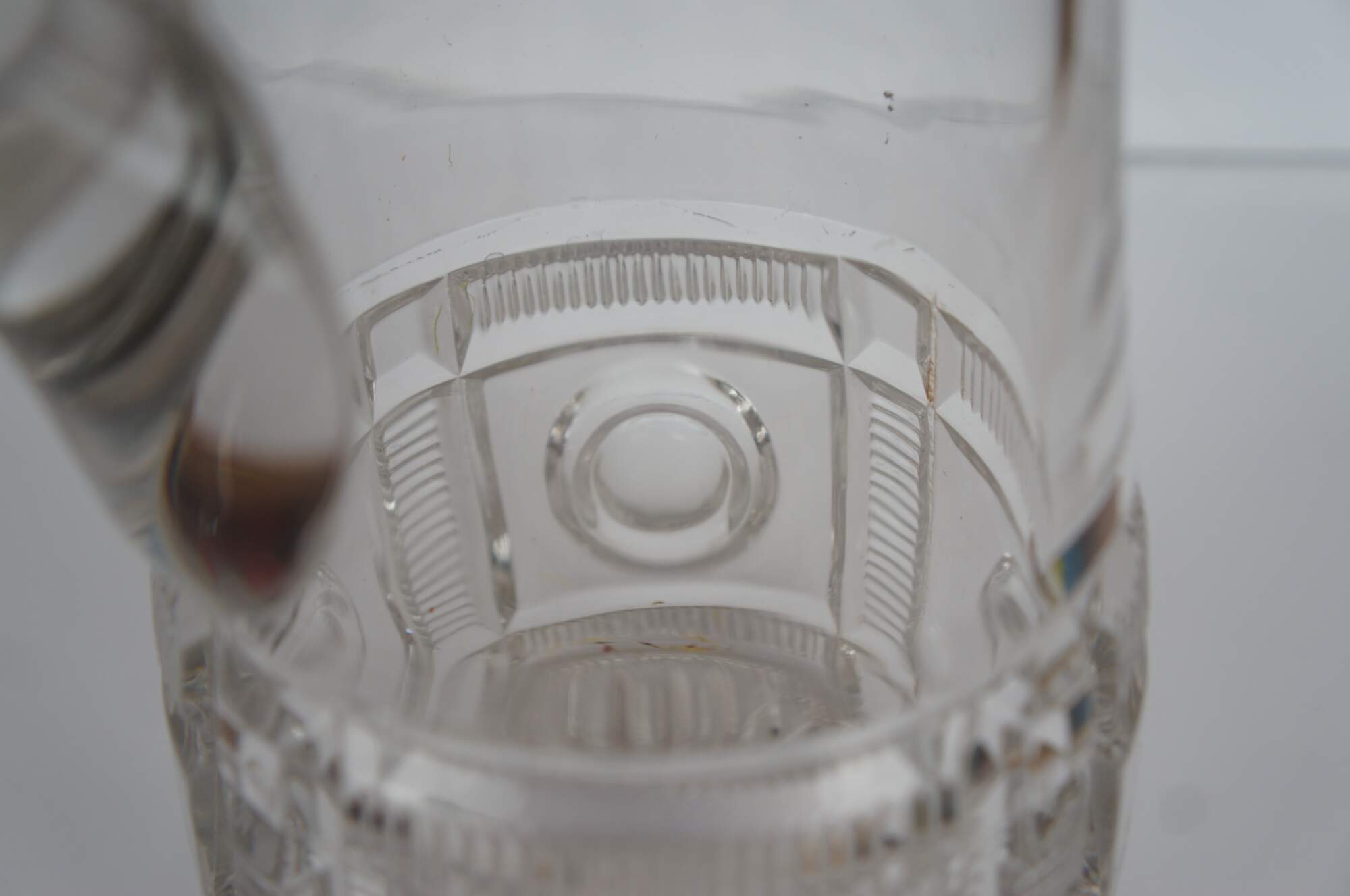 Antique pressed glass pitcher featuring smooth tapered upper and handle with geometric art deco base.