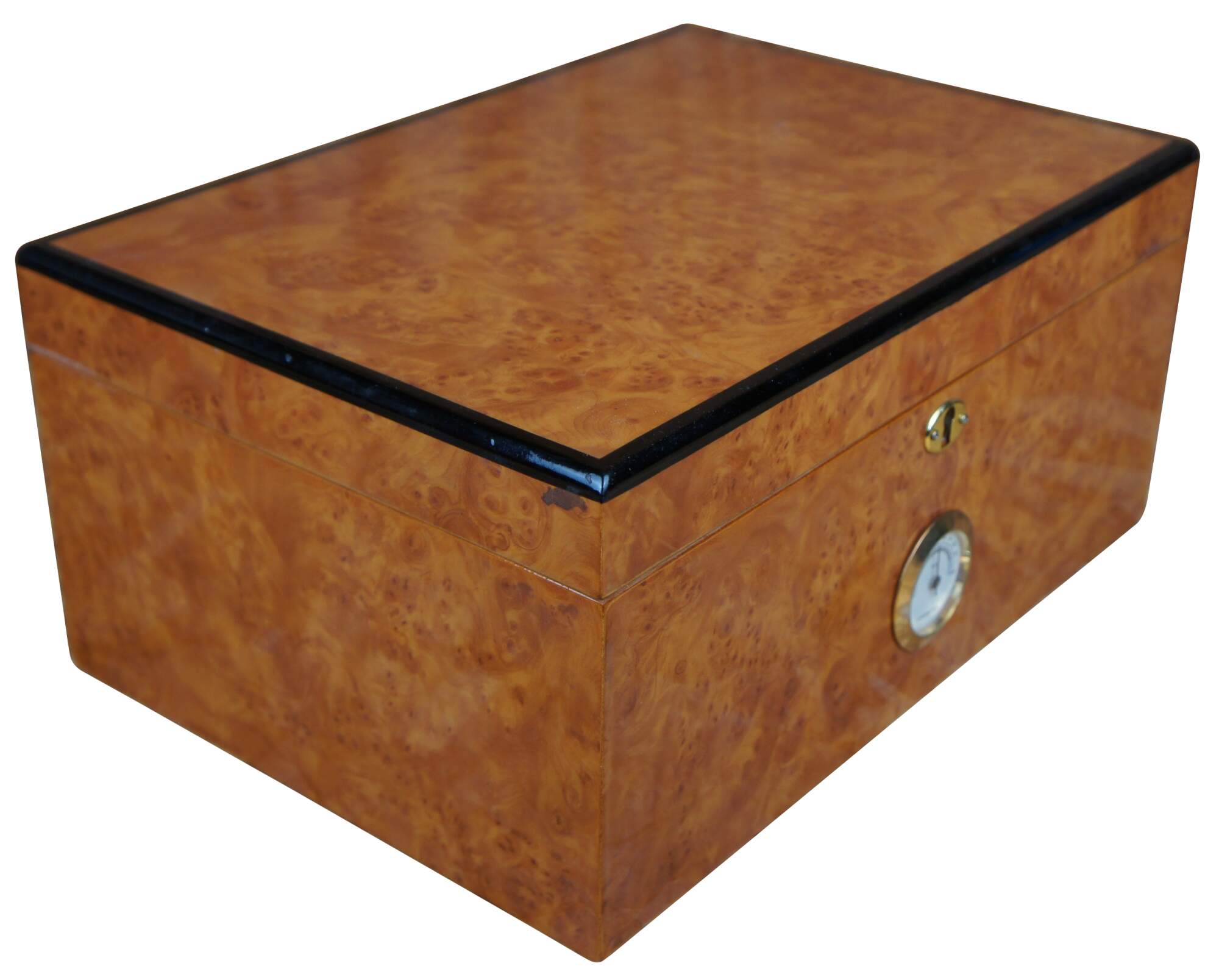 Vintage desktop birdseye maple cedar lined humidor with exterior hygrometer and extra cutters / guillotines.