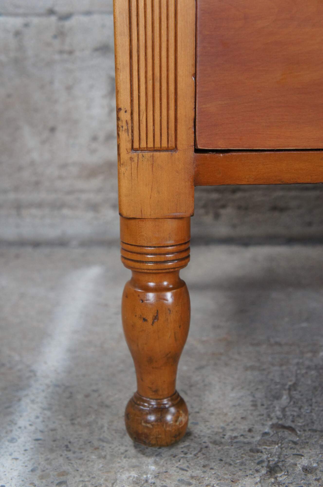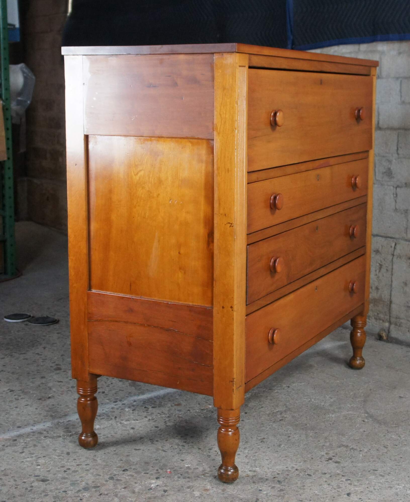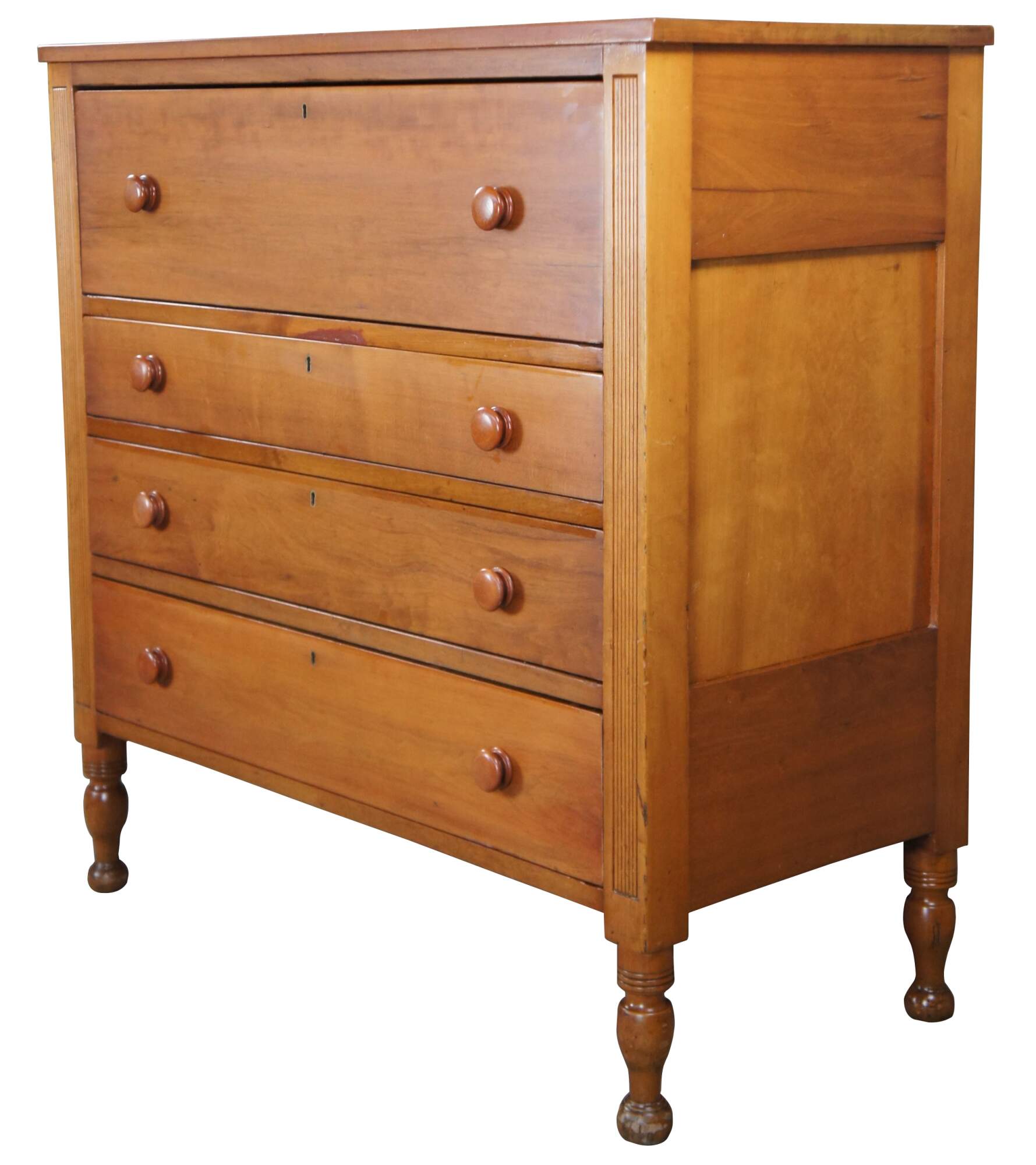 Impressive American tallboy dresser, circa 1840s (late Federal Era). A rectangular form made from solid cherry with four hand dovetailed drawers, fluted stiles and turned ribbed turnip feet. Includes lockable drawers and smooth lathed drawer pulls.