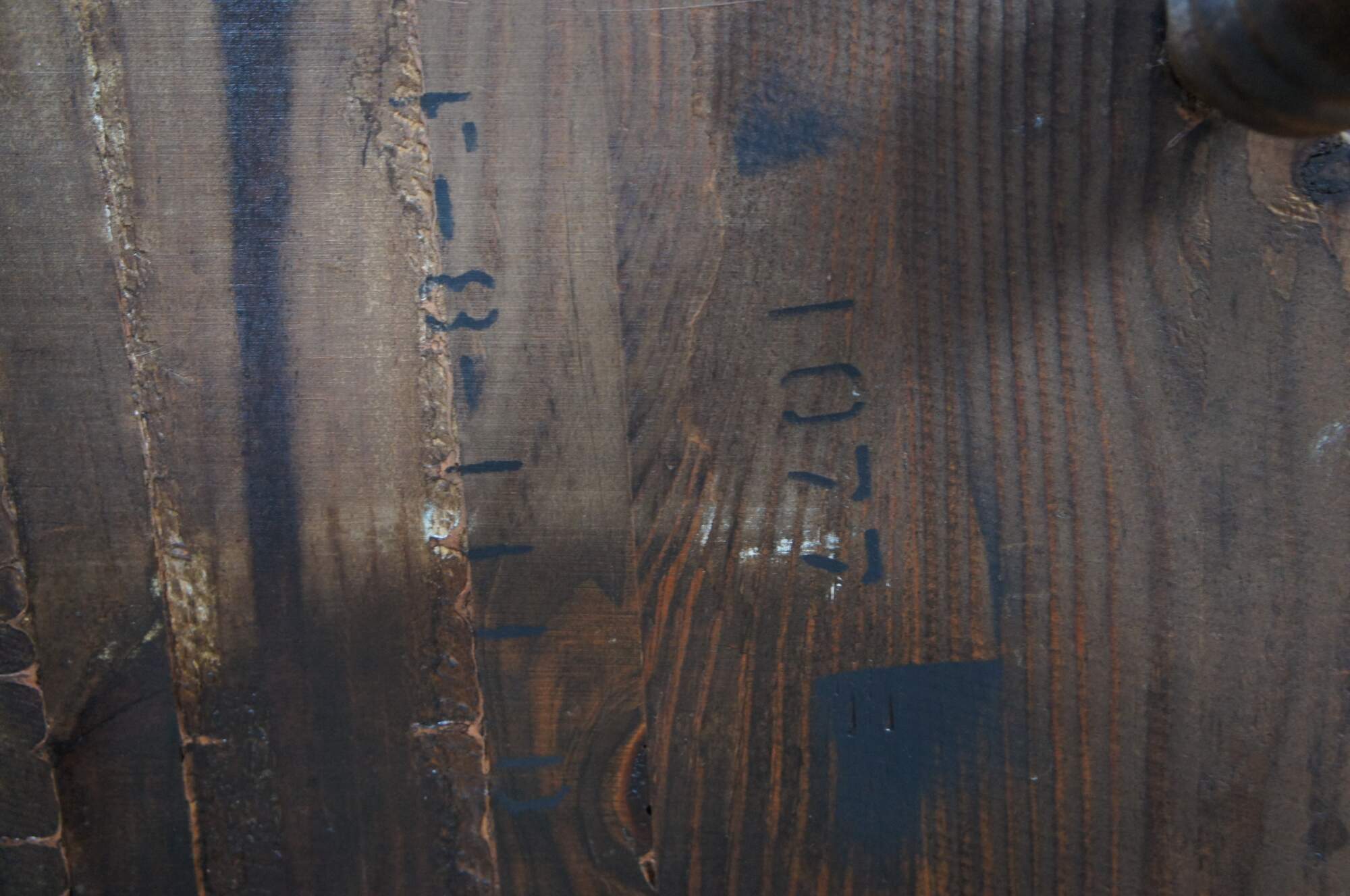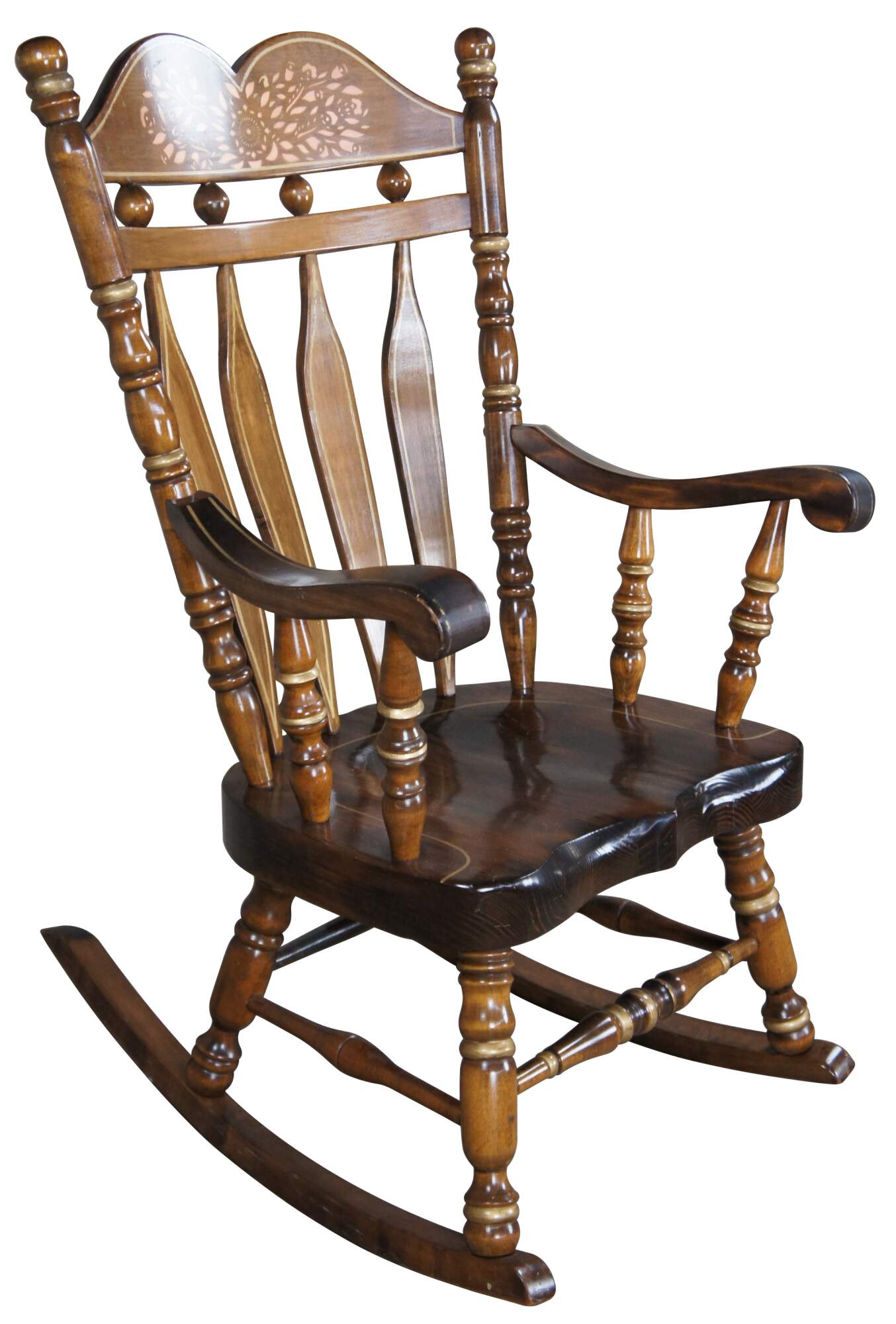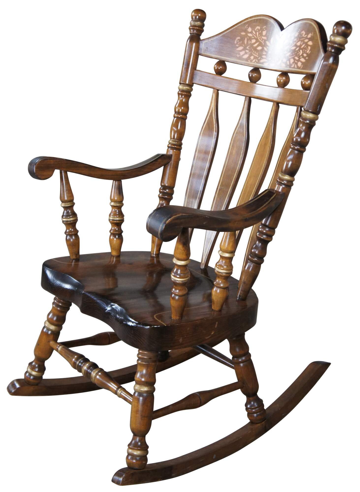 Virginia House Tavern Pine Rocking Chair, circa 1970s. A robust chair with thick saddle seat, stencilled back, gold trim and arrow splats.