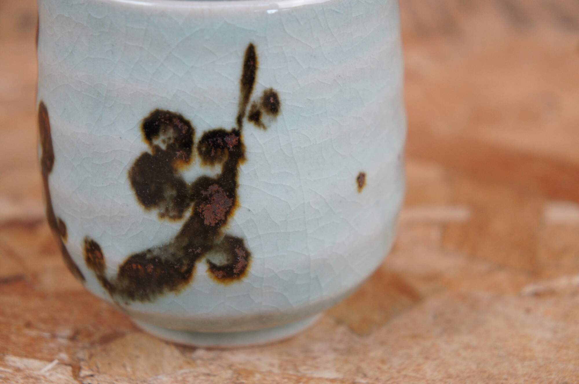 Light wood box holding tea or coffee cups and saucers and cups with no handles in Asian styles.