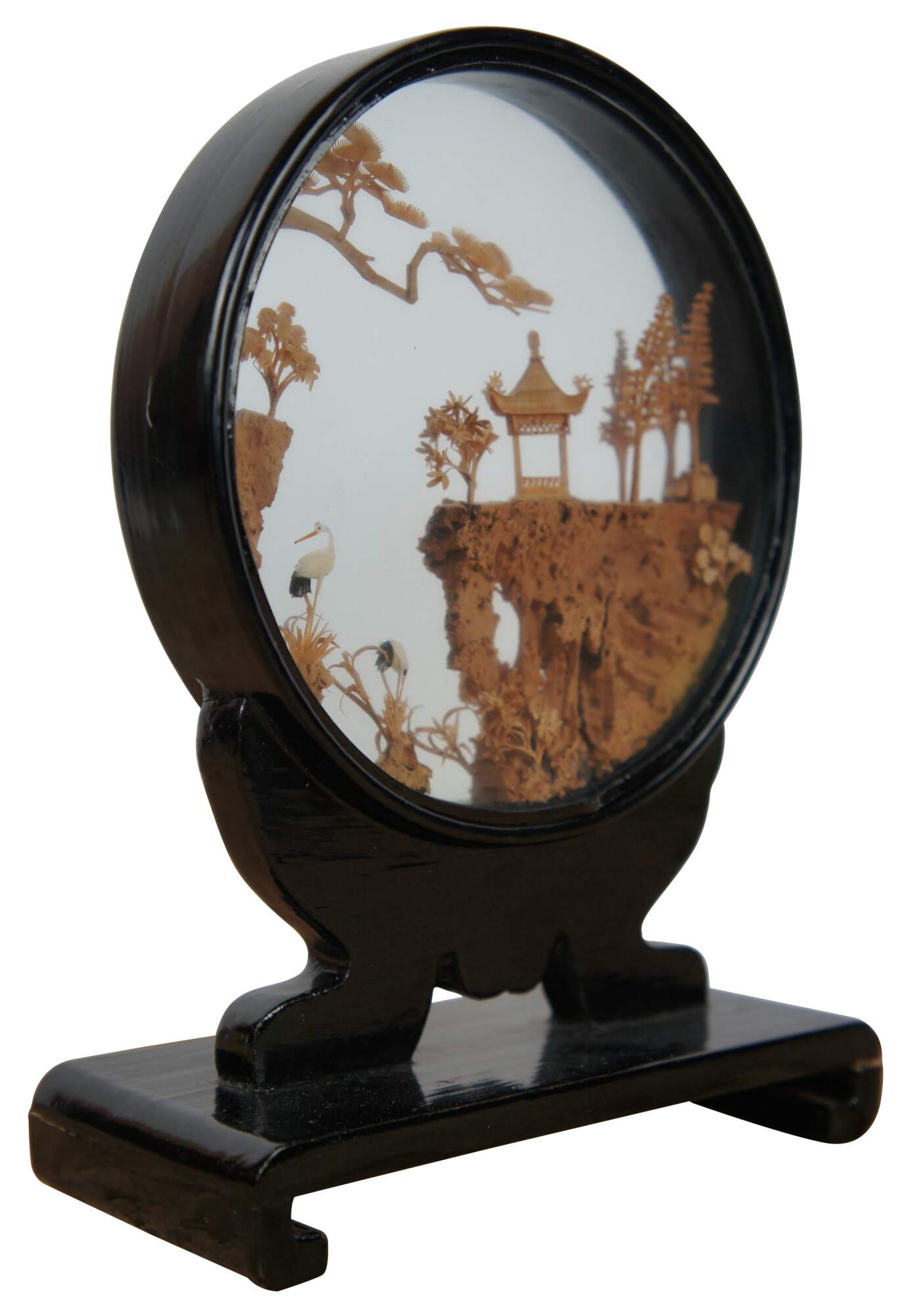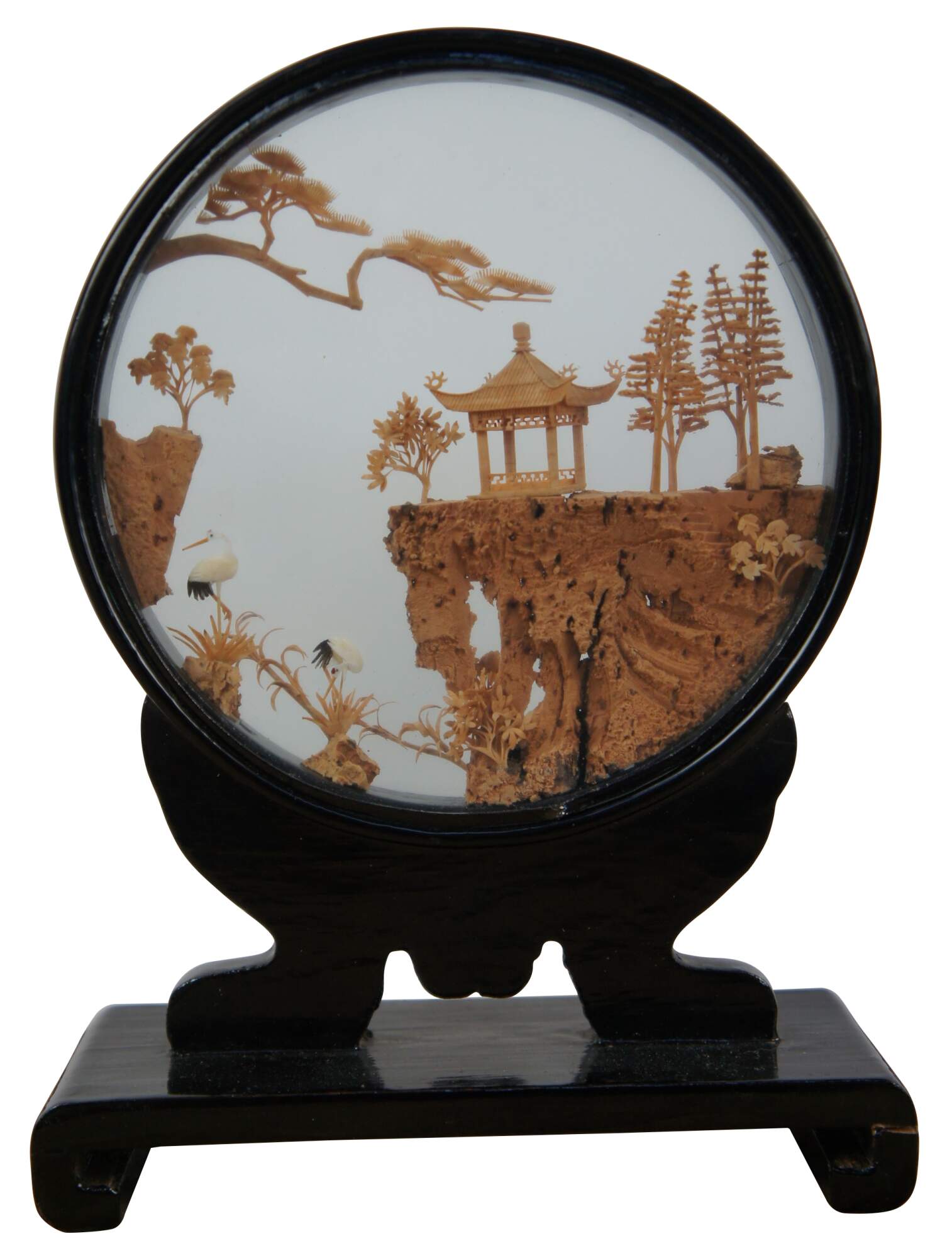 Two vintage Japanese carved cork diorama folk art shadow box displays depicting landscape scenes that feature a bridge, cranes and pagodas or Temples. Each lacquered box sits on a stand, one is circular and one hexagonal.