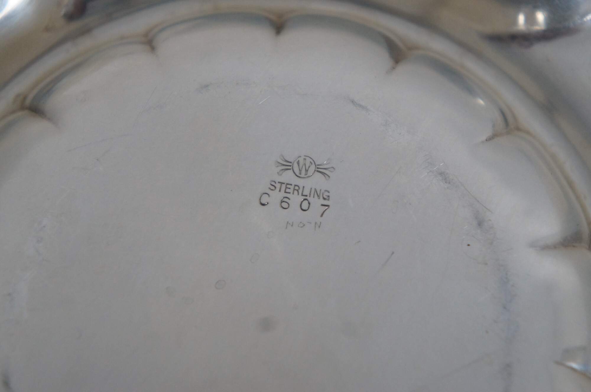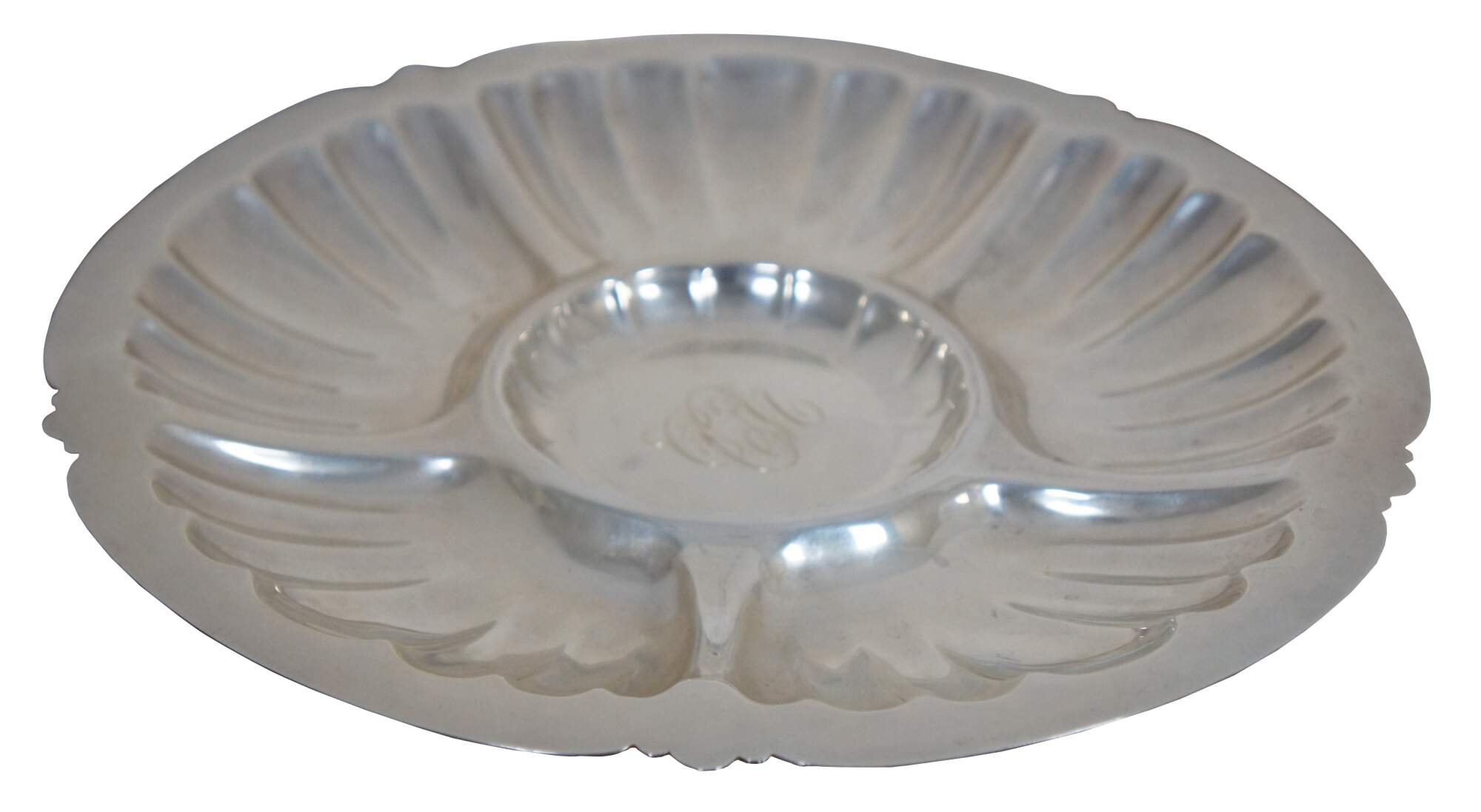 Vintage Frank M. Whiting number C607 six sectioned / divided shrimp, appetiser, cocktail serving plate or tray with round scallop form and shell design, engraved in the center with the initials CMC. “North Attleboro, MA - Origin as Holbrook Whiting & Albee in the 1870s. The firm was changed to F.M. Whiting & Co (1878), F.M. Whiting (1891), F.M. Whiting Co (1895) and Frank M. Whiting & Co (1896). From 1940 became a division of Ellmore Silver Co and went out of business 1960 c.
