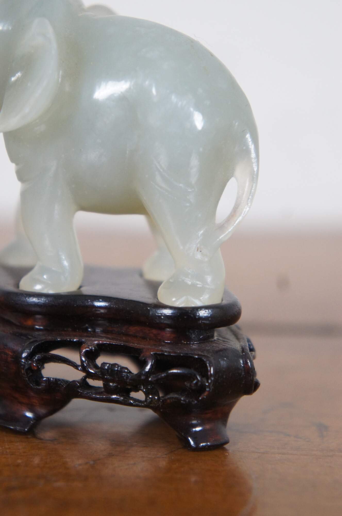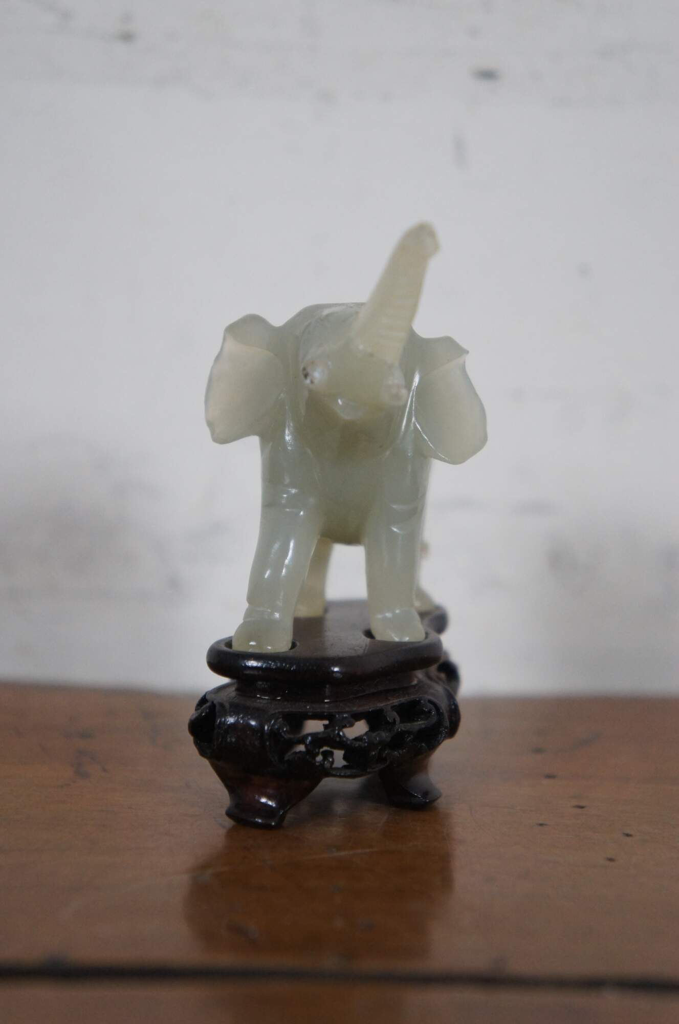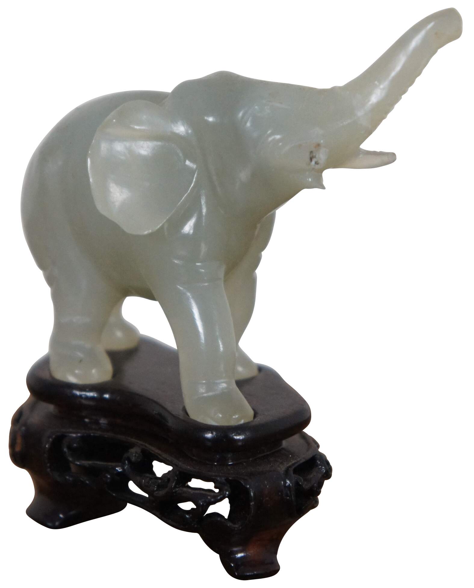 Petite vintage Chinese pale green jade carved elephant figurine with raised trunk and wood stand.