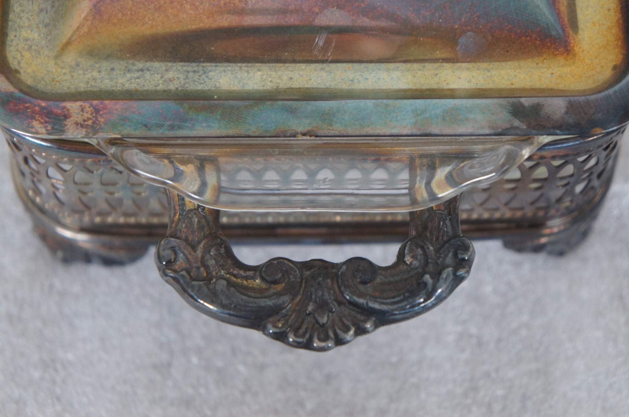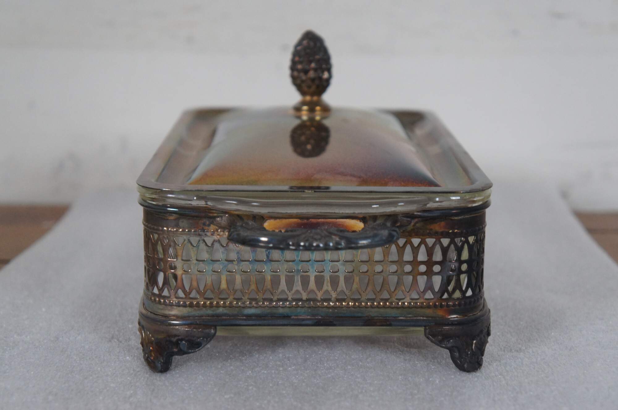 Vintage mid century Sheffield Silver Company rectangular lidded and footed silver plate vegetable serving dish with 1 Qt Fire-King glass insert. Features an open bottom, pierced sides, scalloped handles and pine cone finial. “Brooklyn NY Incorporated in 1908. Trademark registered in 1919. Became a division of Reed & Barton Silversmiths in 1974.”