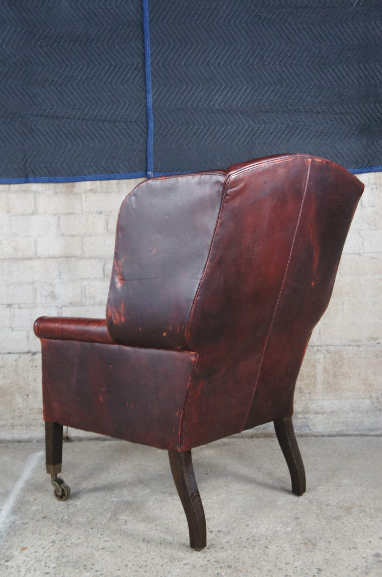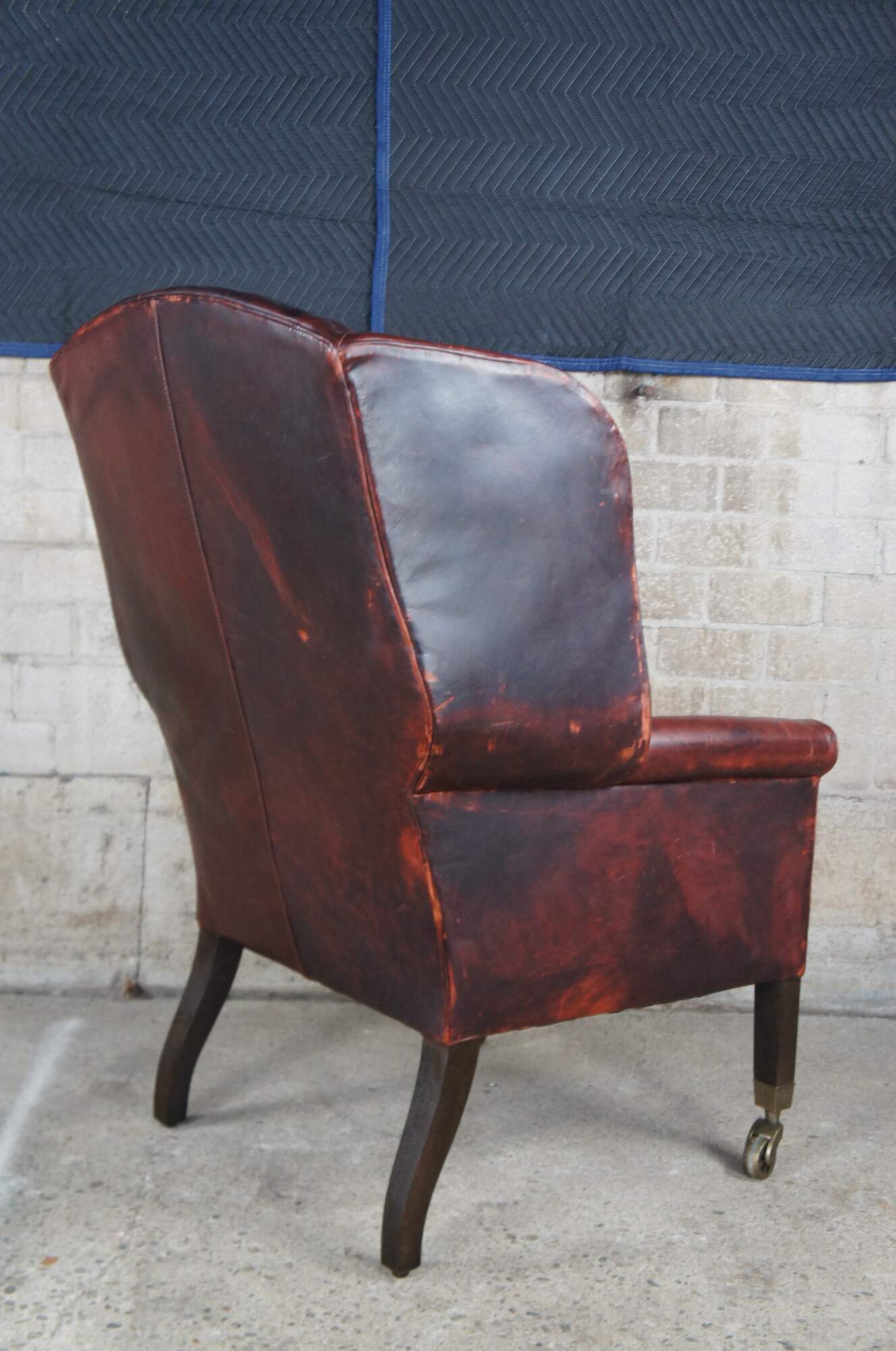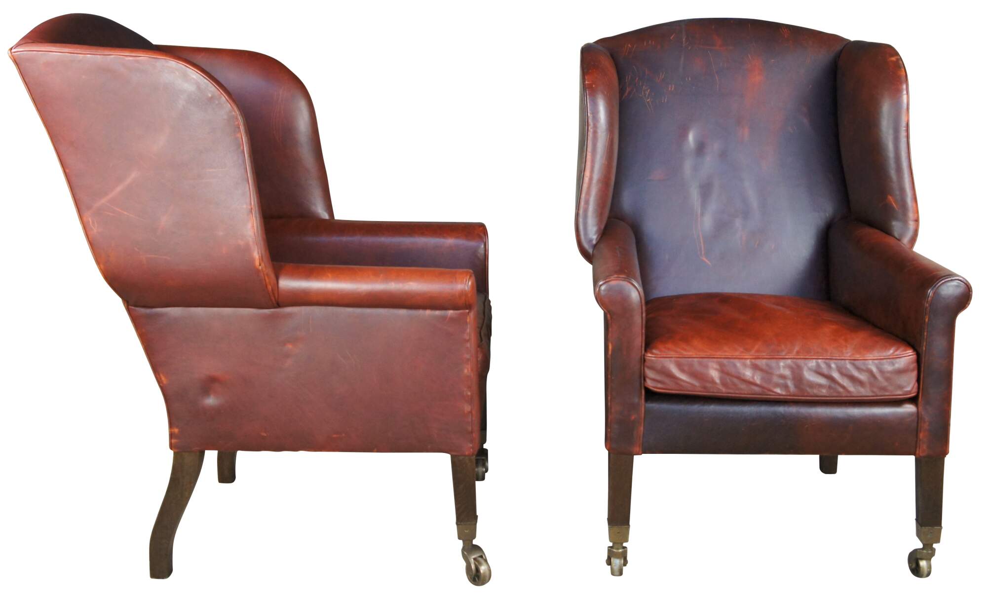 An English 1800s inspired brown leather fireside chair from circa. Features an arched top and deep, sheltering wings down to the swiveling, spoked brass casters, engraved with S Dobbins & Co Patent, Bristol. With low, padded scroll arms and a plump seat cushion, this chair is as debonair as it is inviting.