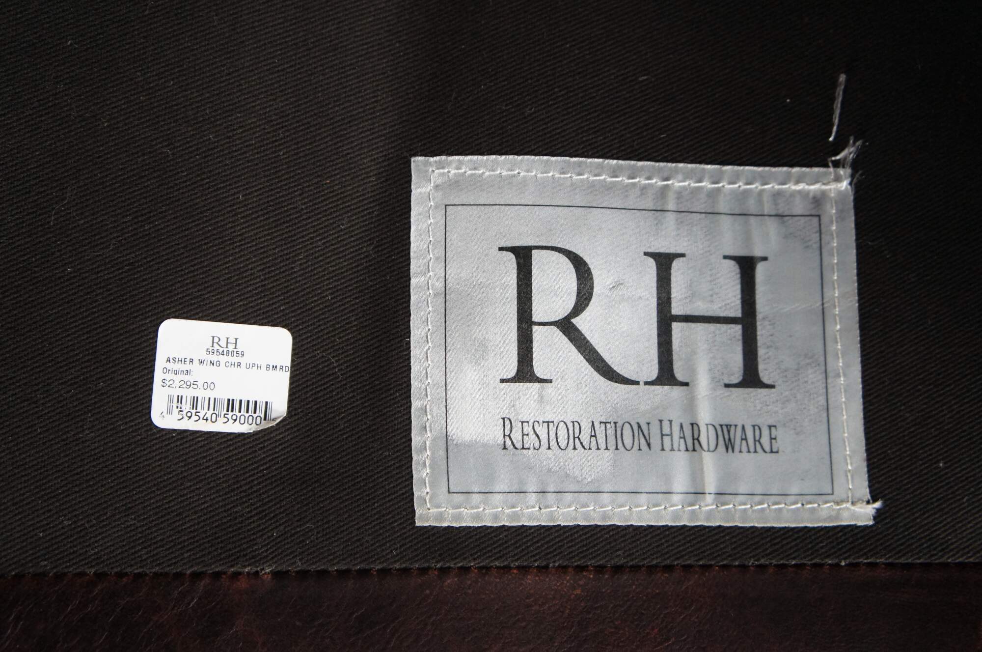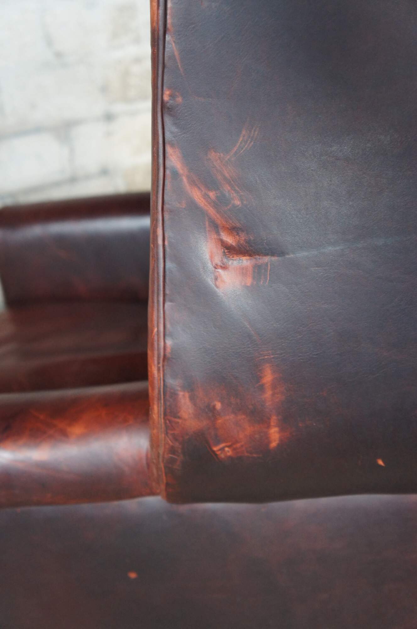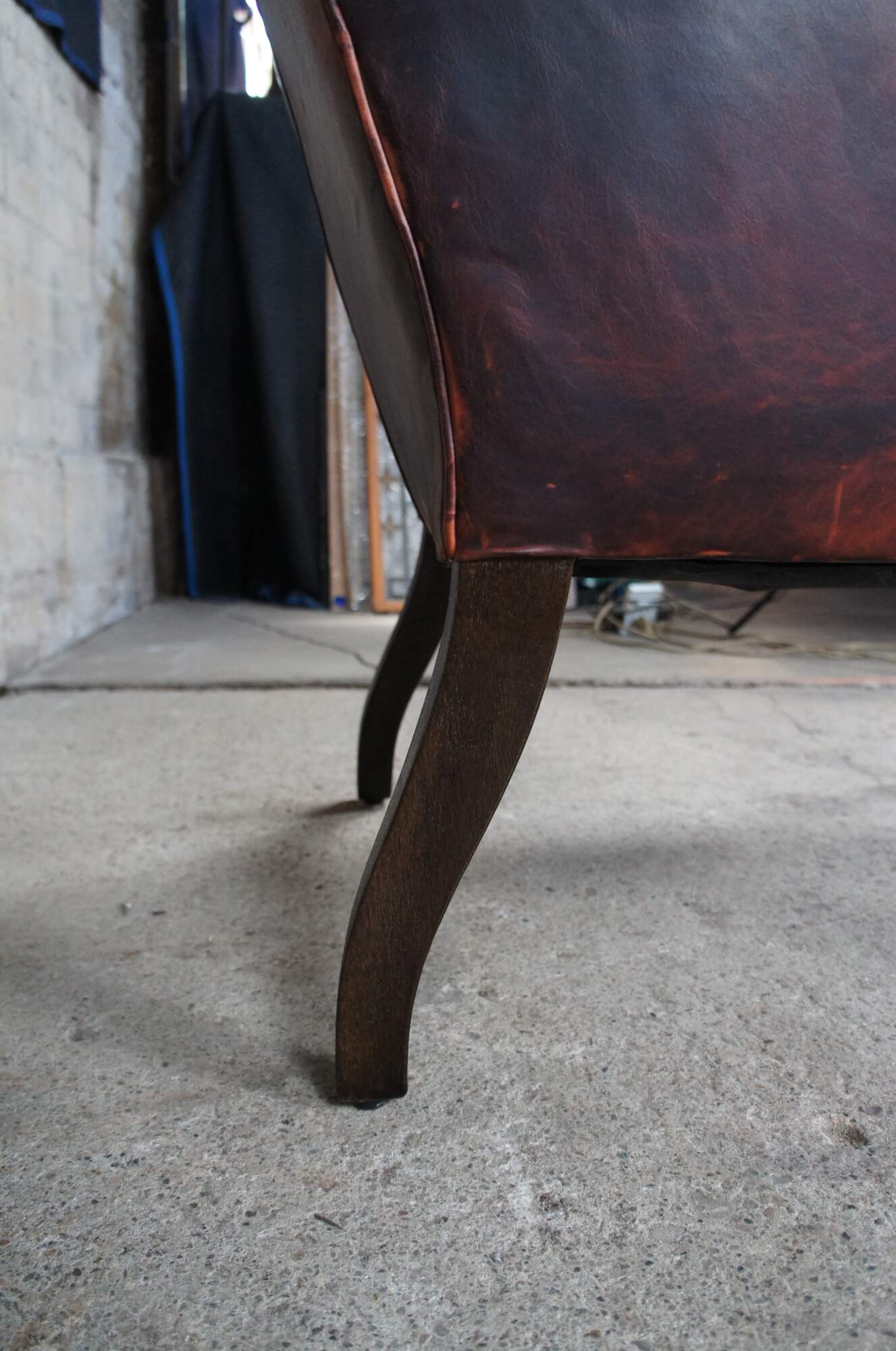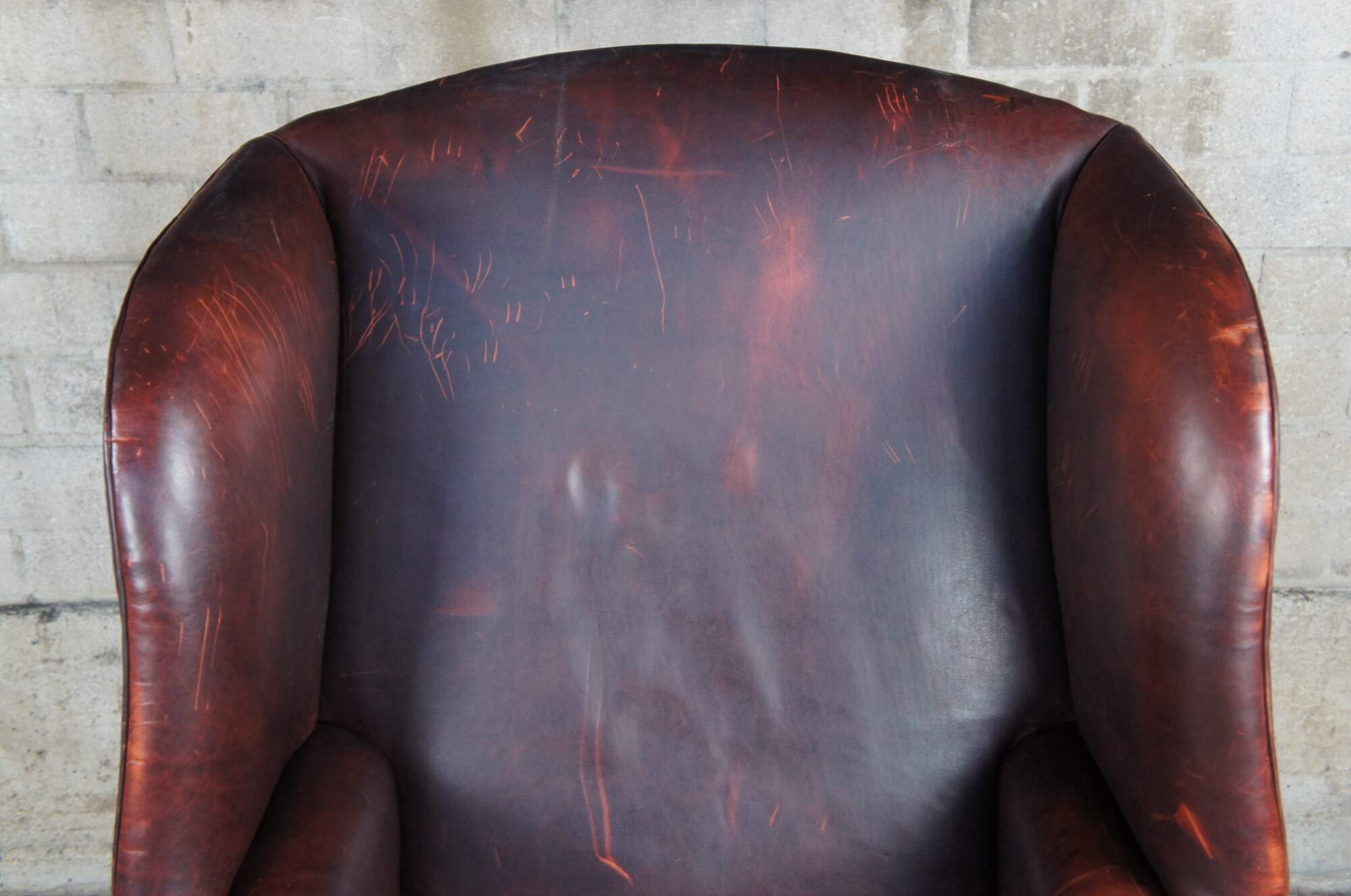 An English 1800s inspired brown leather fireside chair from circa. Features an arched top and deep, sheltering wings down to the swiveling, spoked brass casters, engraved with S Dobbins & Co Patent, Bristol. With low, padded scroll arms and a plump seat cushion, this chair is as debonair as it is inviting.