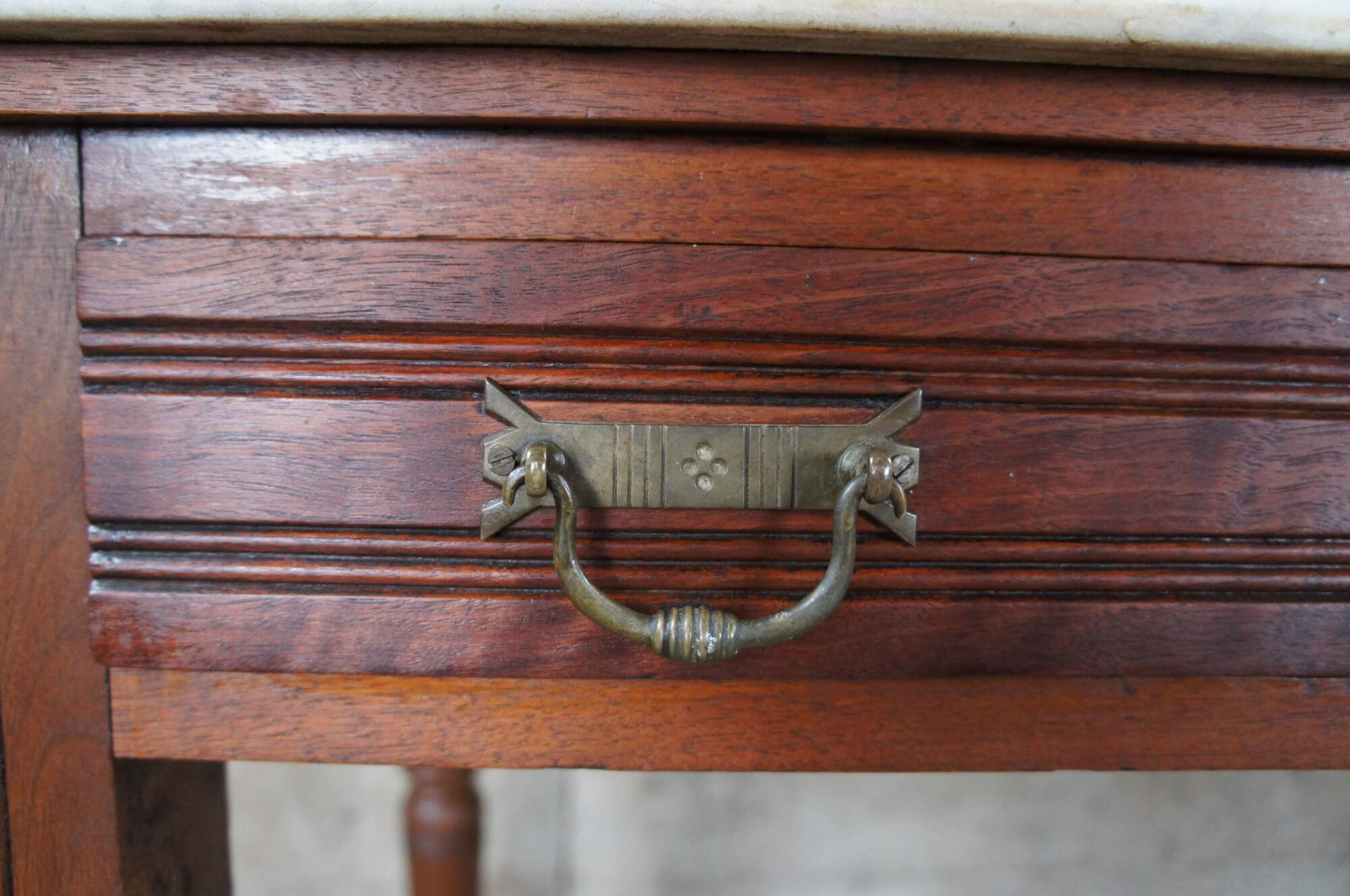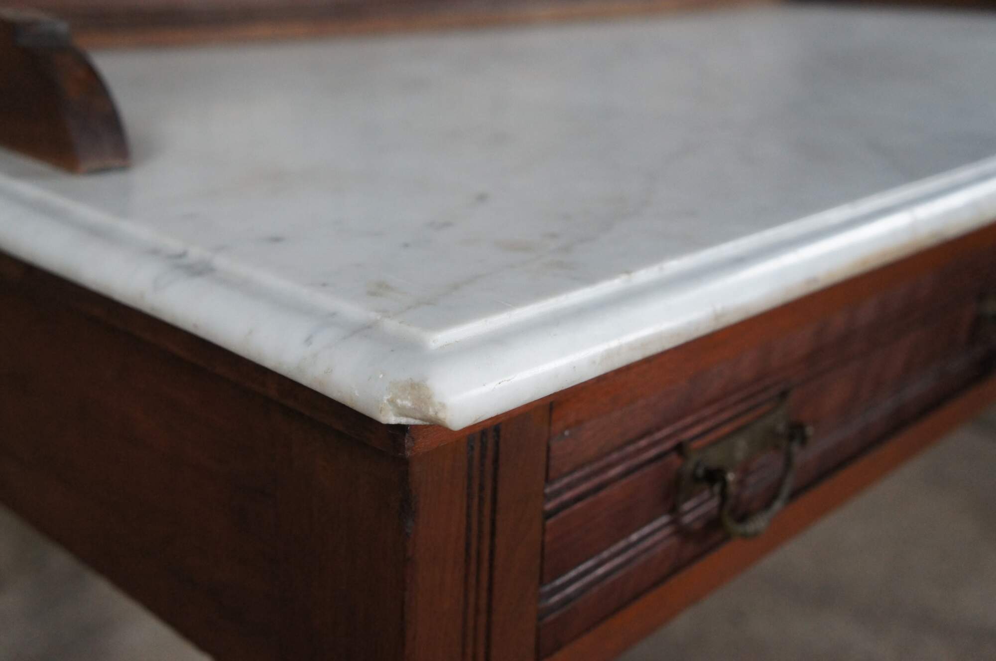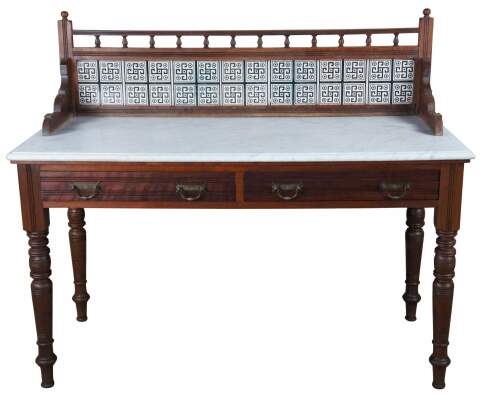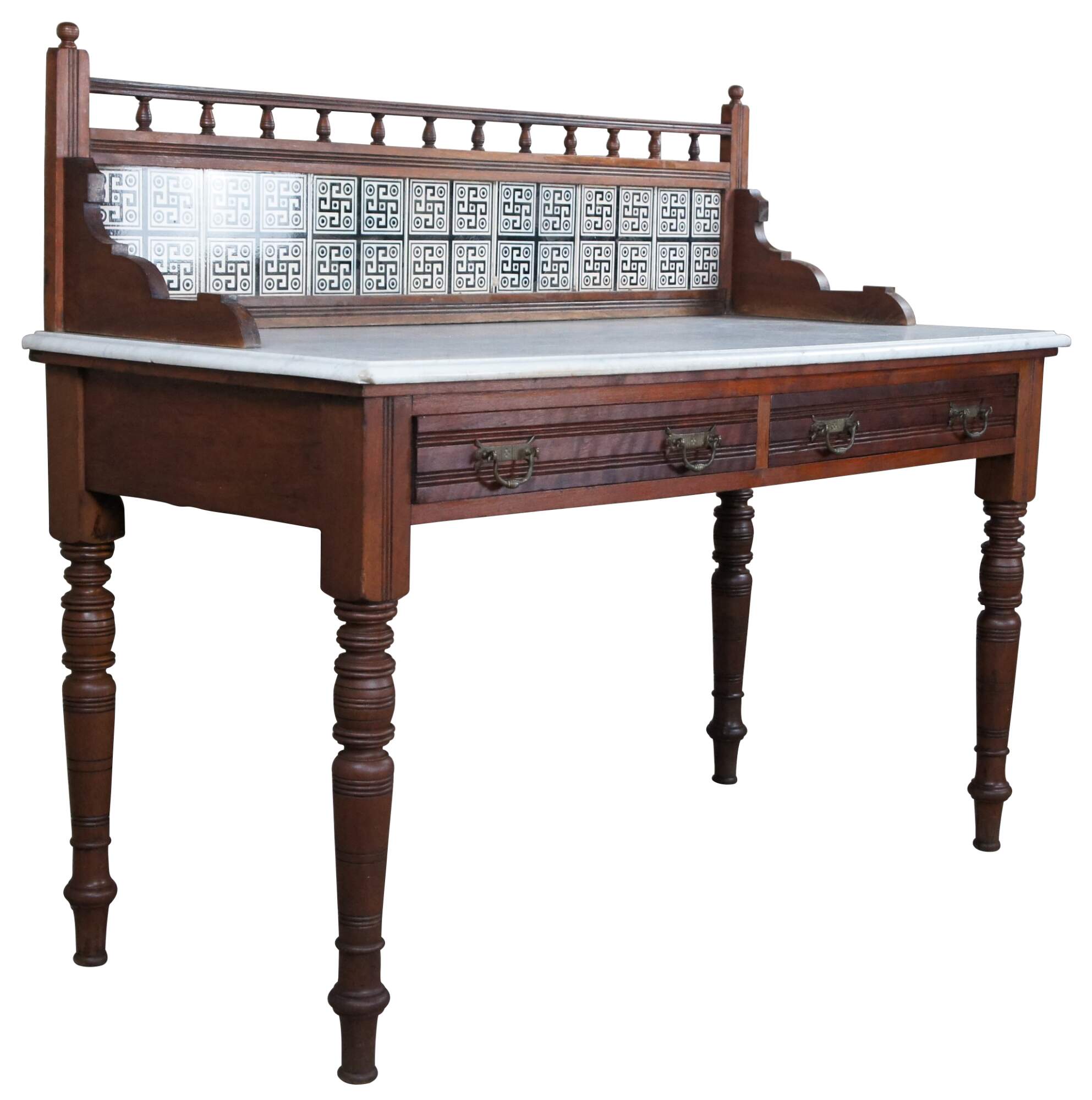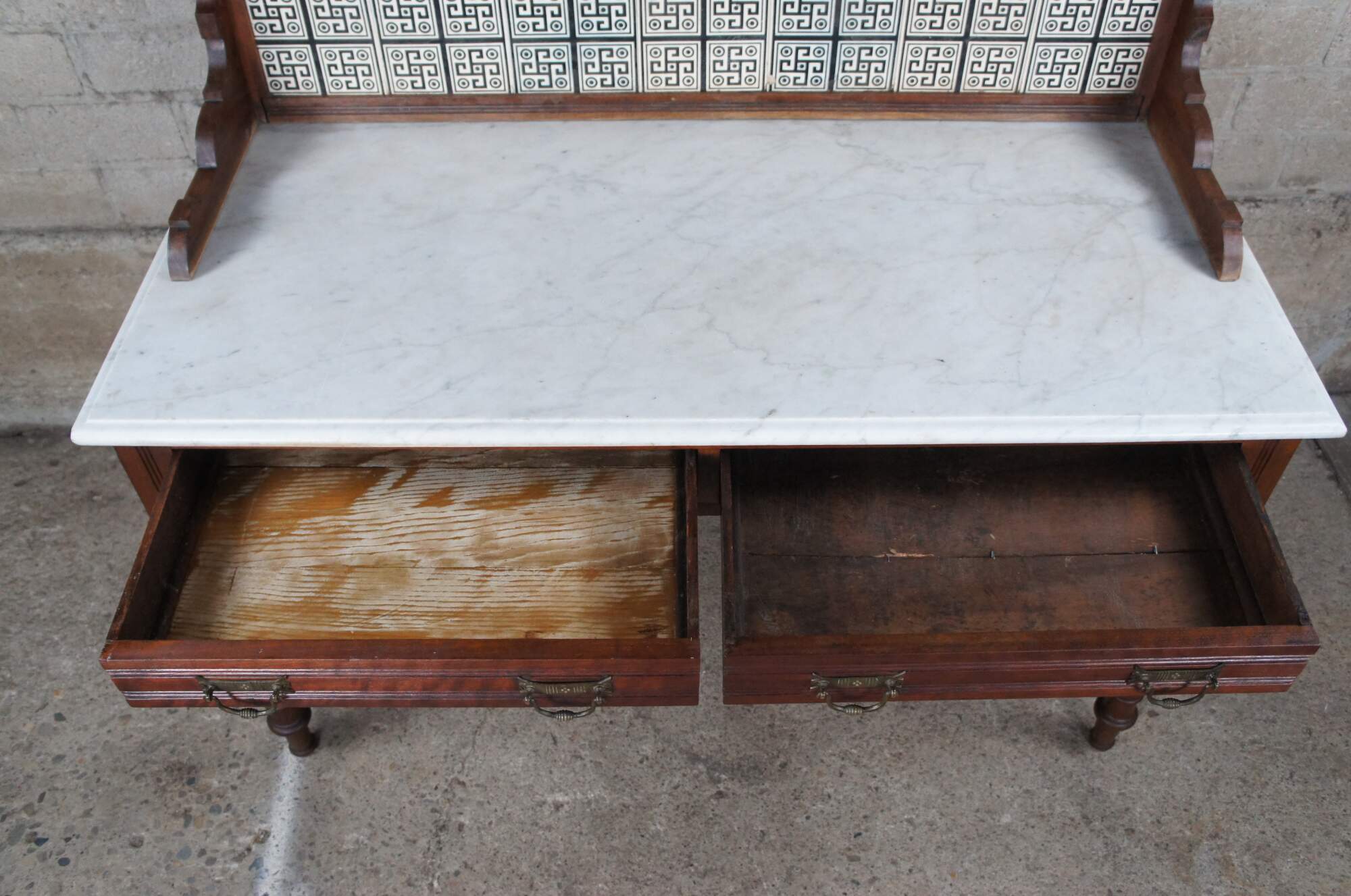 Antique Victorian Eastlake Washstand, circa last quarter 19th century. Made from walnut with a white marble top featuring a tiled backsplash and bobbin turned gallery. The two large drawers are hand dovetailed with brass hardware. Supported by turned and taperred legs leading to arrow feet. Great for use as a server, barback or desk. Backsplash is removable to allow for more workspace,