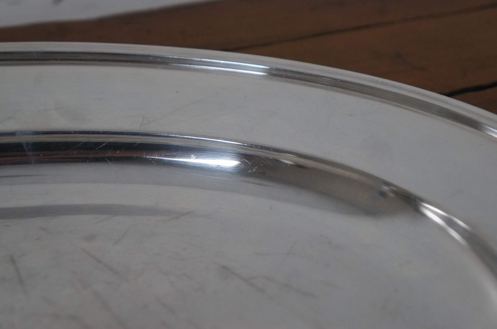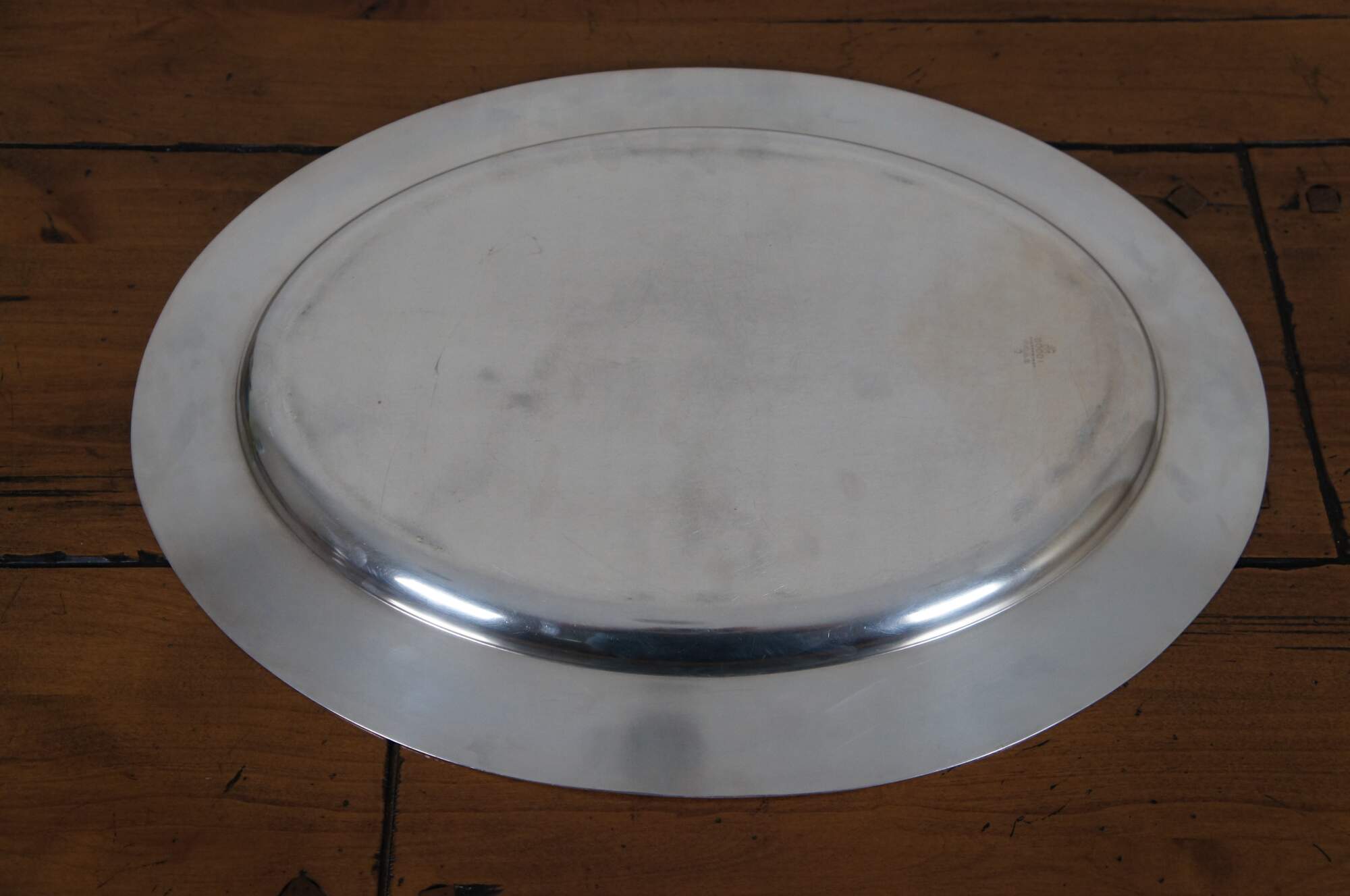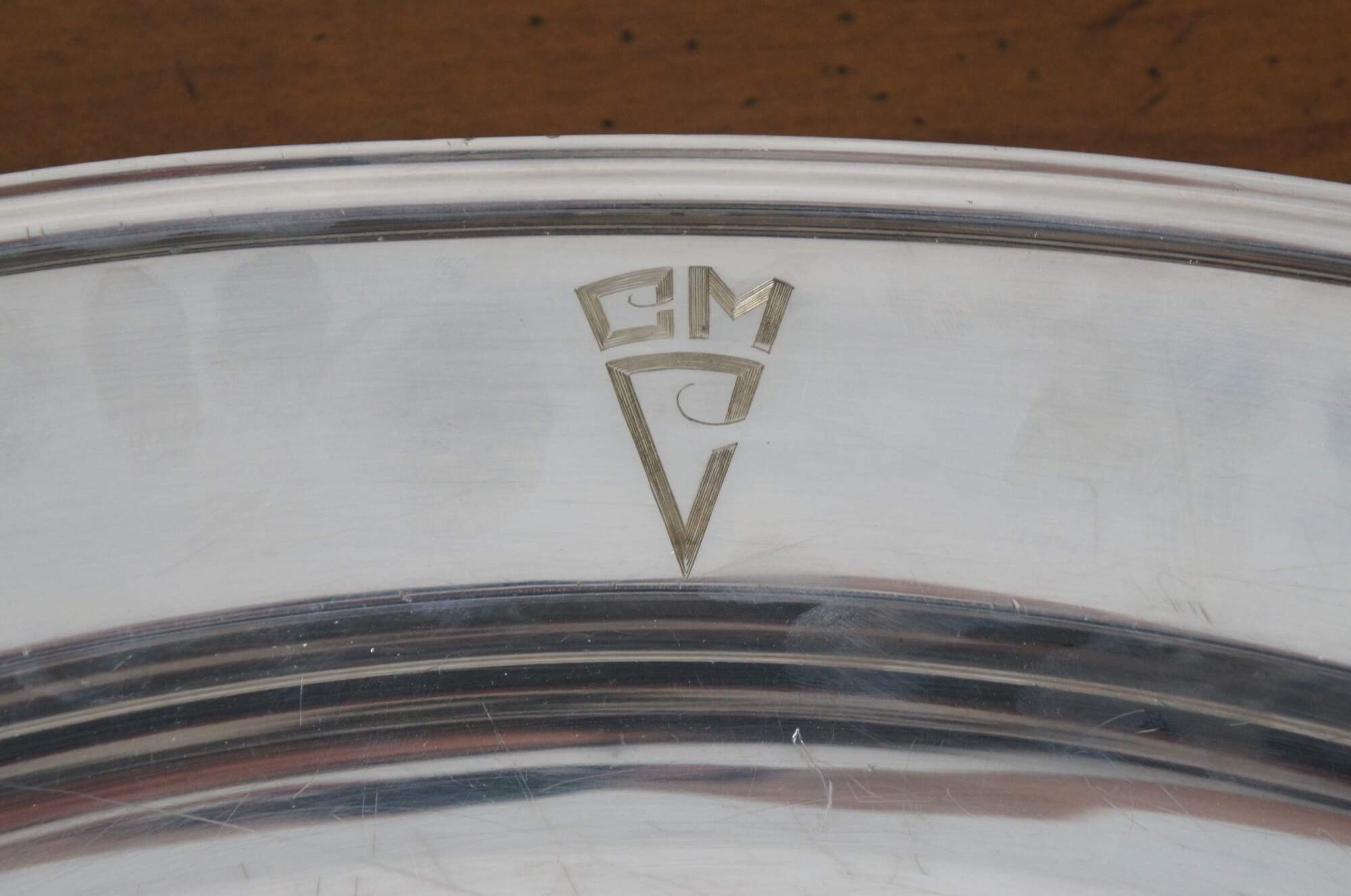 Antique 1934 Reed & Barton number 10002-20 oval silver plate serving platter; edge engraved with the initials CMC. “The Reed & Barton story began in 1824, when Isaac Babbitt created a new metal alloy - ""Britannia metal"" - in his Taunton, Massachusetts pewter shop.