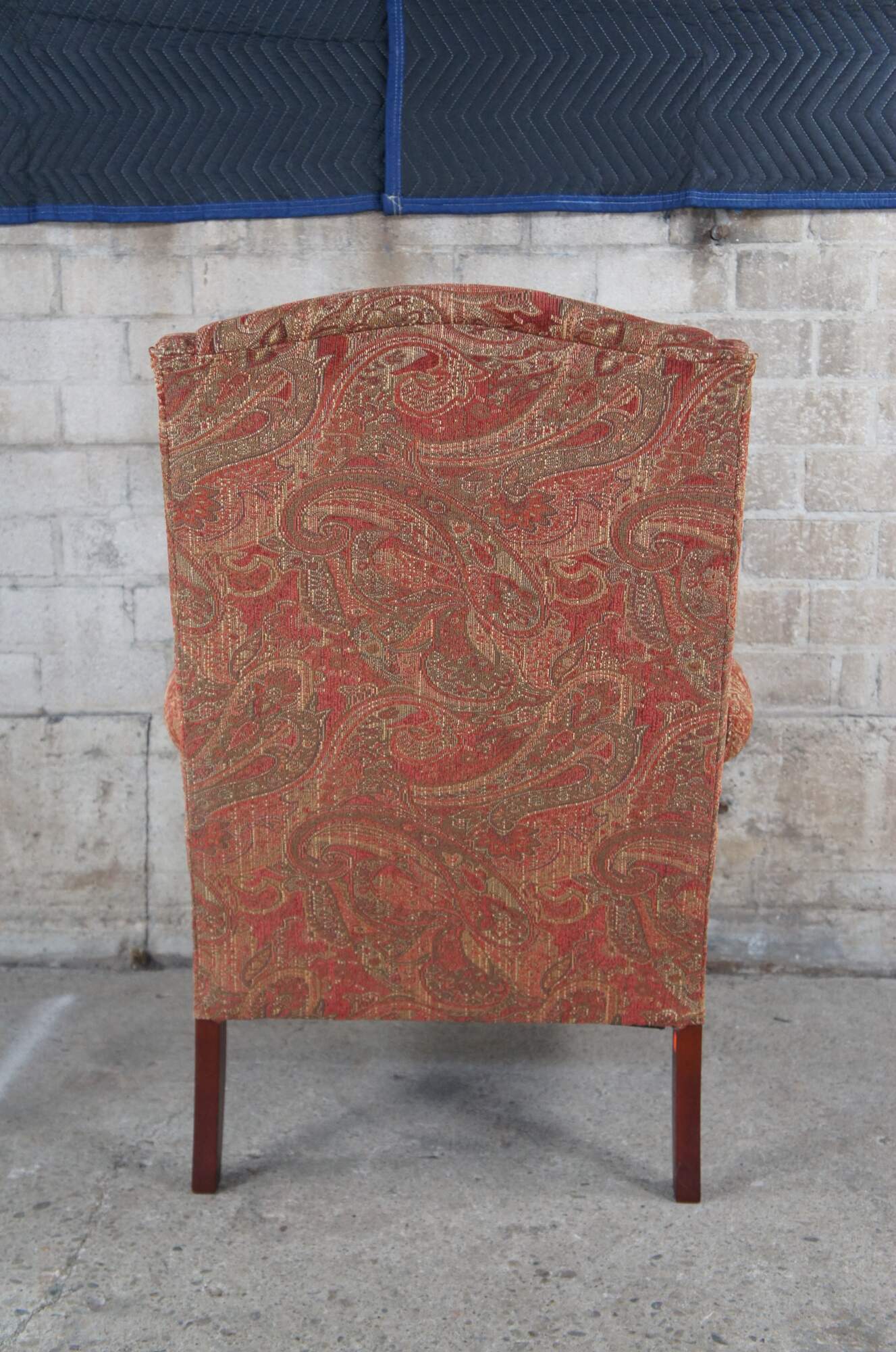 Pair of Best Home Furnishing Wing Chairs. Upholstered in a red and gold fabric with spice finished legs.