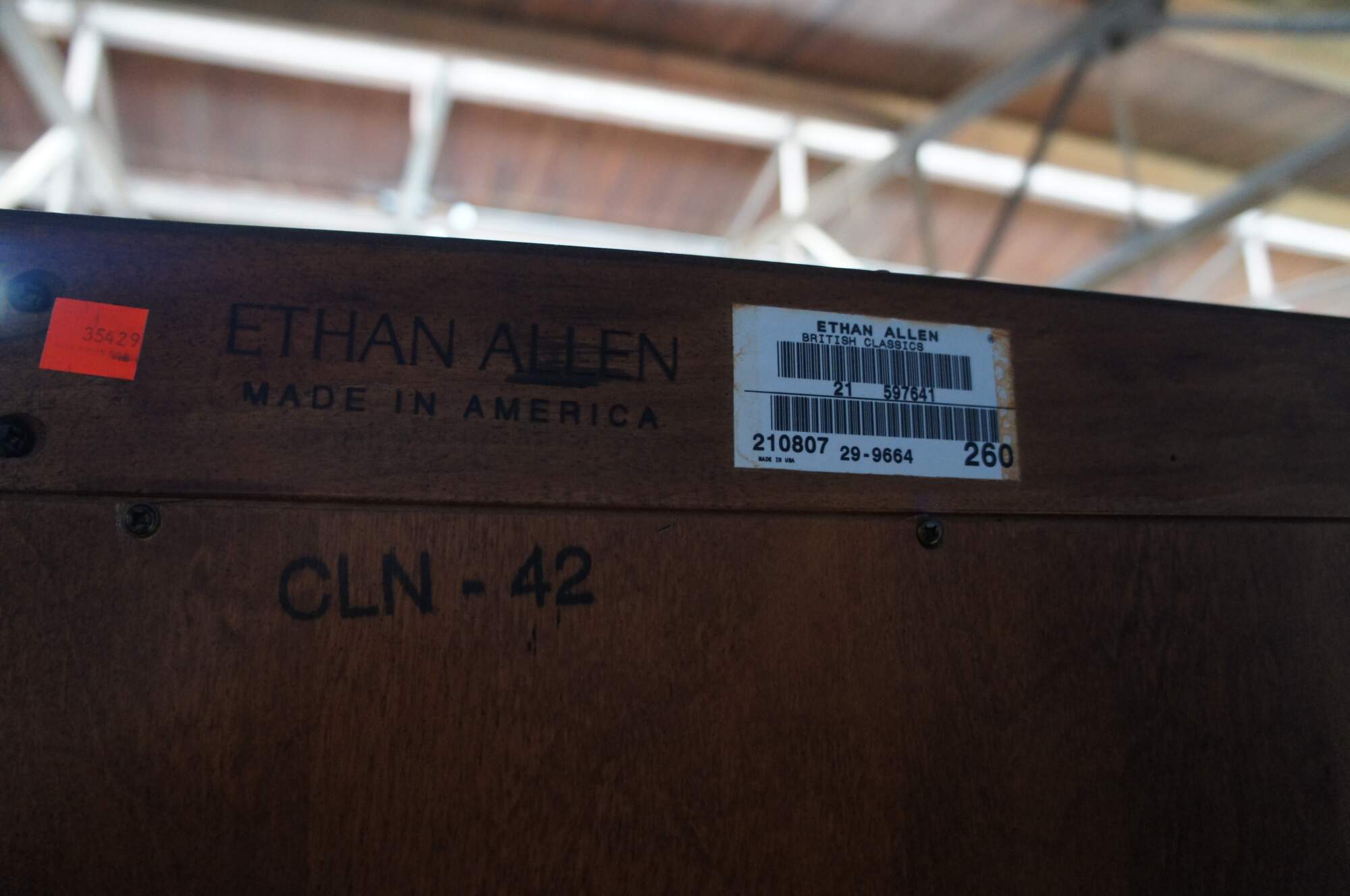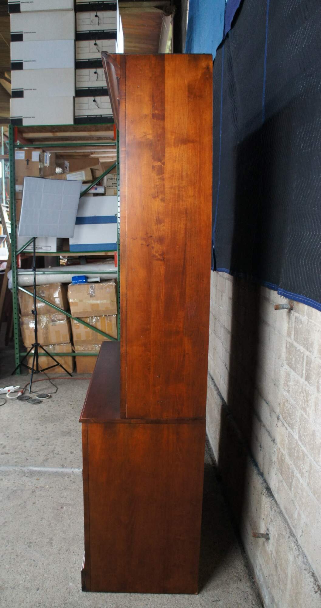 Ethan Allen British Classics Bookcase, 29-9663 & 29-9664. Handcrafted in American workshops. Made from maple in Victorian Revival styling. Features a hutch with three shelves over lower cabinet with two dovetailed drawers and lower storage. Complimented by circular medallions, fluted pilasters & stiles and metal hardware.