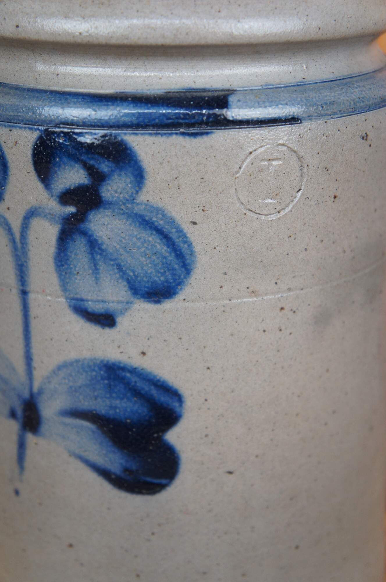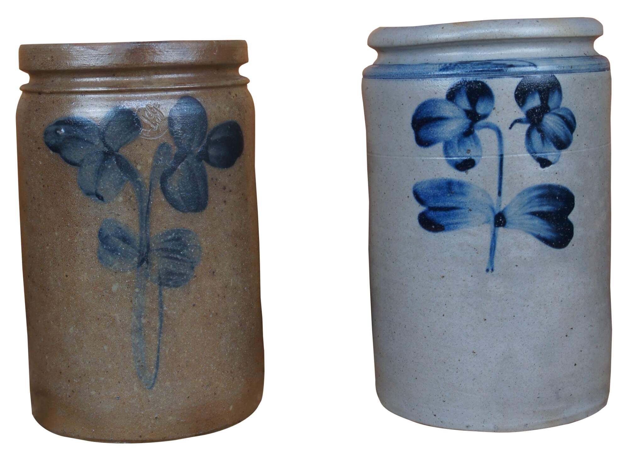 These two antique 19th century stoneware crocks are decorated with the signature double clover in cobalt blue. Made by Peter Herrmann.