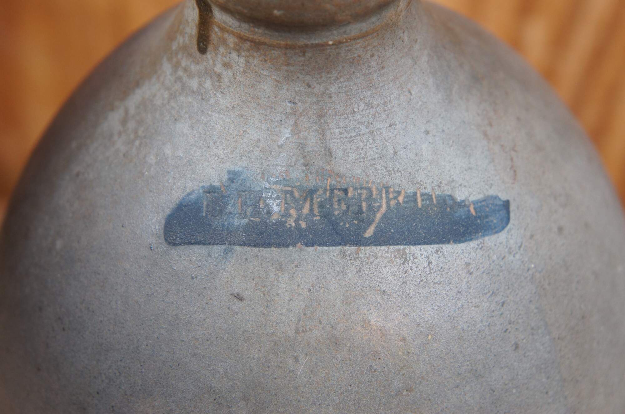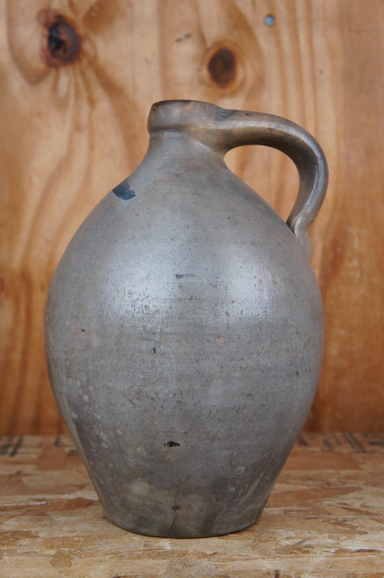 Two primitive 19th century antique salt glaze earthenware or stoneware crocks / jugs featuring a two gallon Charlestown Massachusettes jug and a one gallon other.