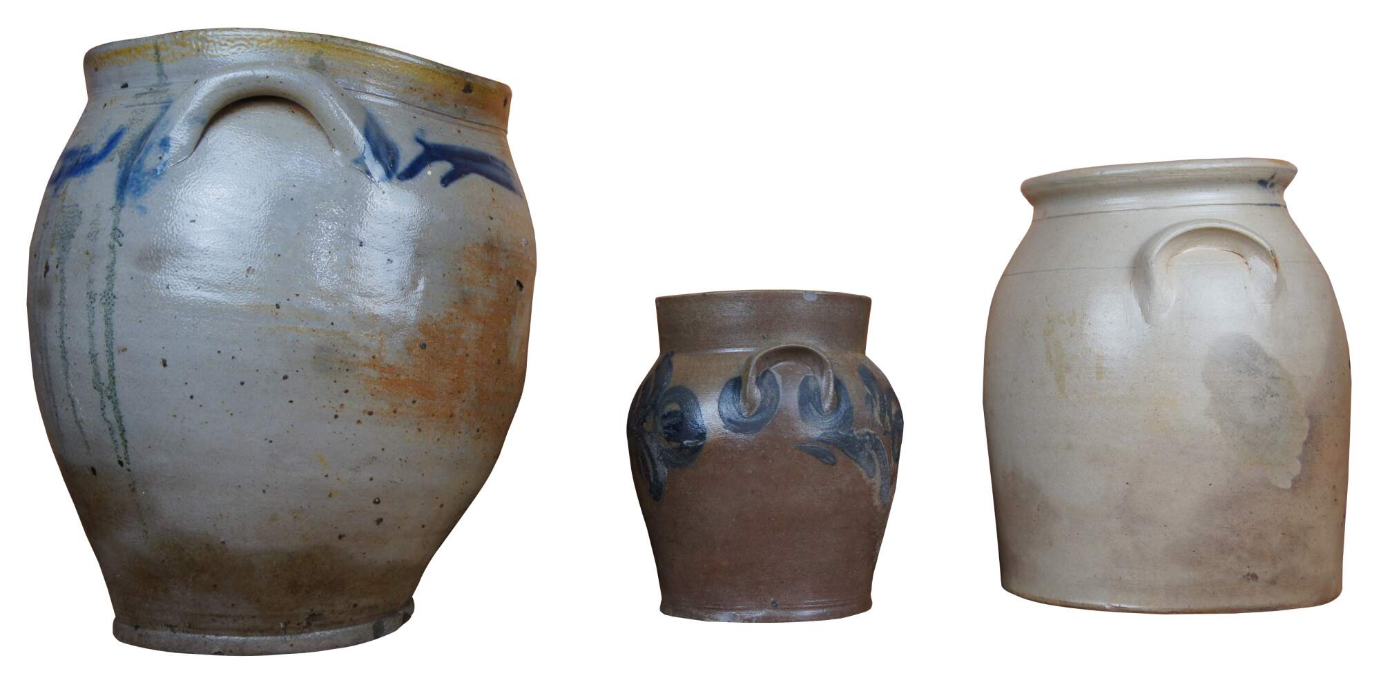 Three antique 19th century salt glaze stoneware urns or crocks with cobalt decoration, one marked W Hart Ogdensburgh NY 2 Gallon. The other two are unmarked appear to be a 1/2 or one gallon and three gallon.