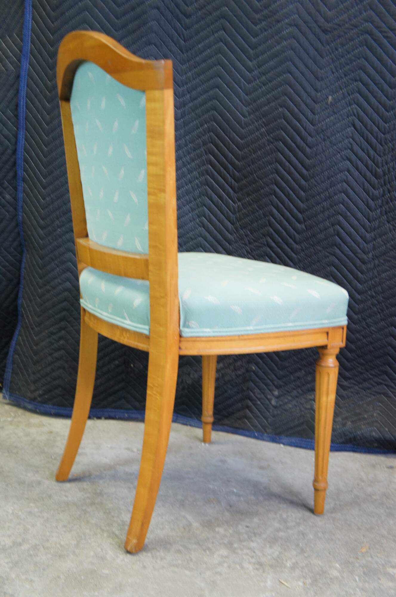 A quaint vanity or accent chair Robert W. Irwin Furniture Company. Crafted from satinwood in Louis XVI styling. Upholstered in teal with a white leaf design fabric. Supported by turned, tapered and fluted legs leading to arrow feet with saber legs along the rear. Circa 1928-1940