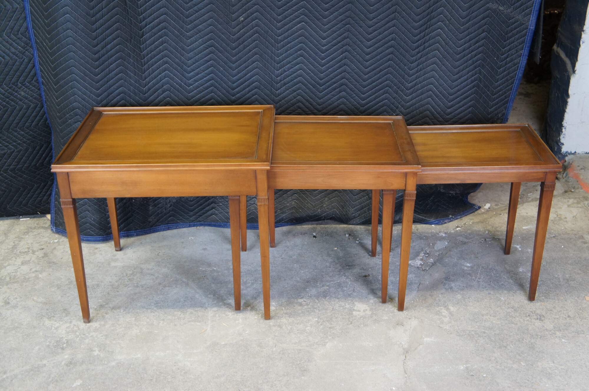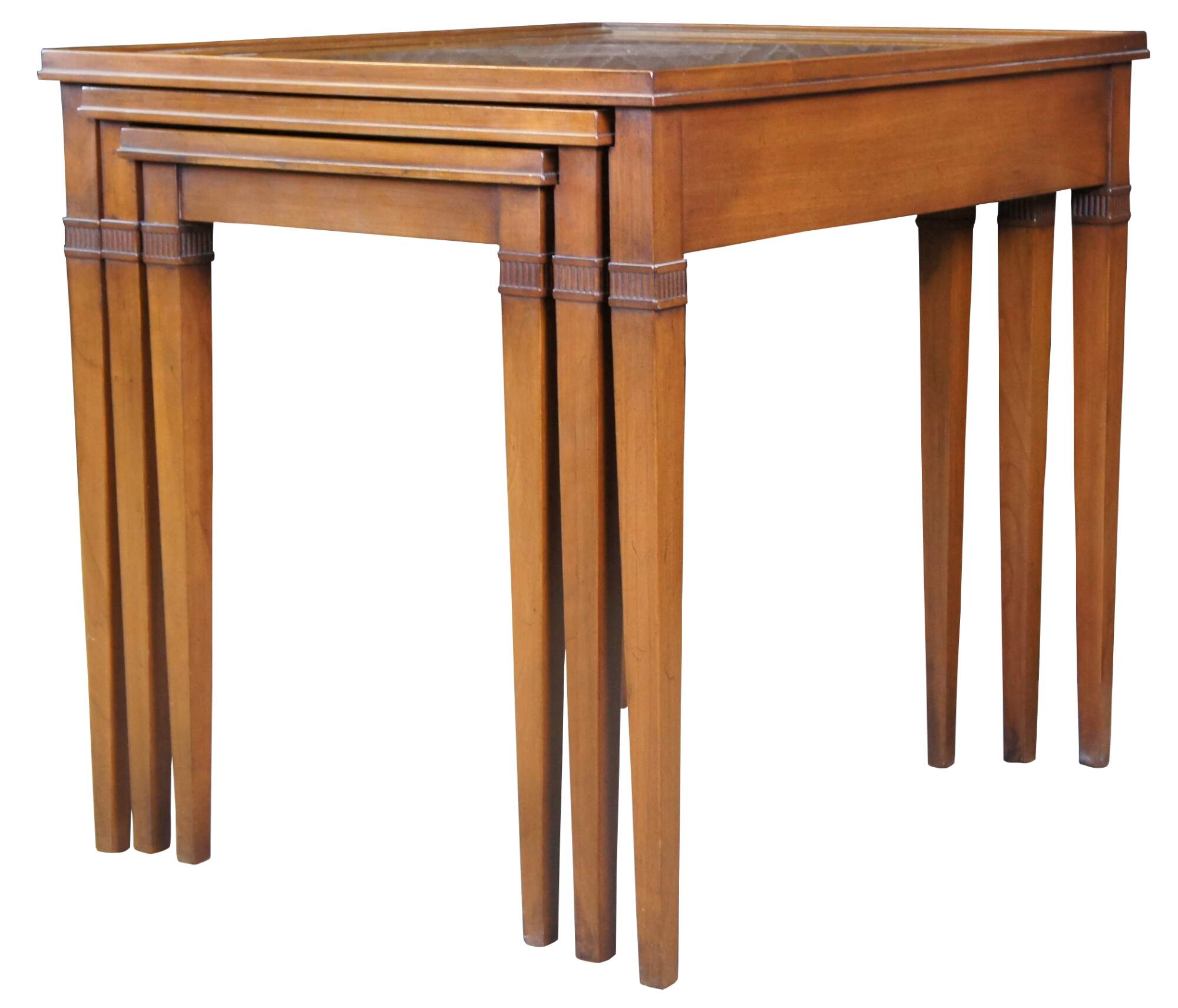 A unique set of three Italian Provincial mid century deep nesting tables Features an inset top over square tapered legs.