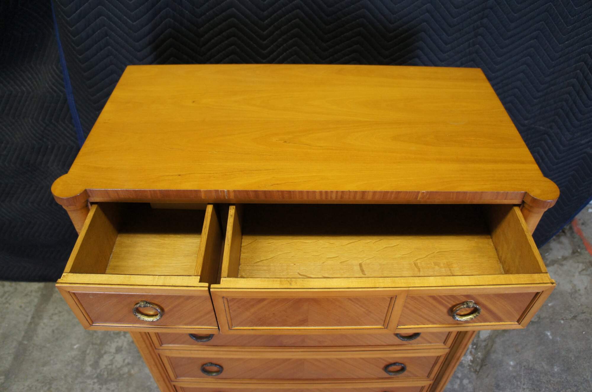 Good overall condition, wear and distressing commensurate with age and use, small area of uneven veneer along front apron, light fading.