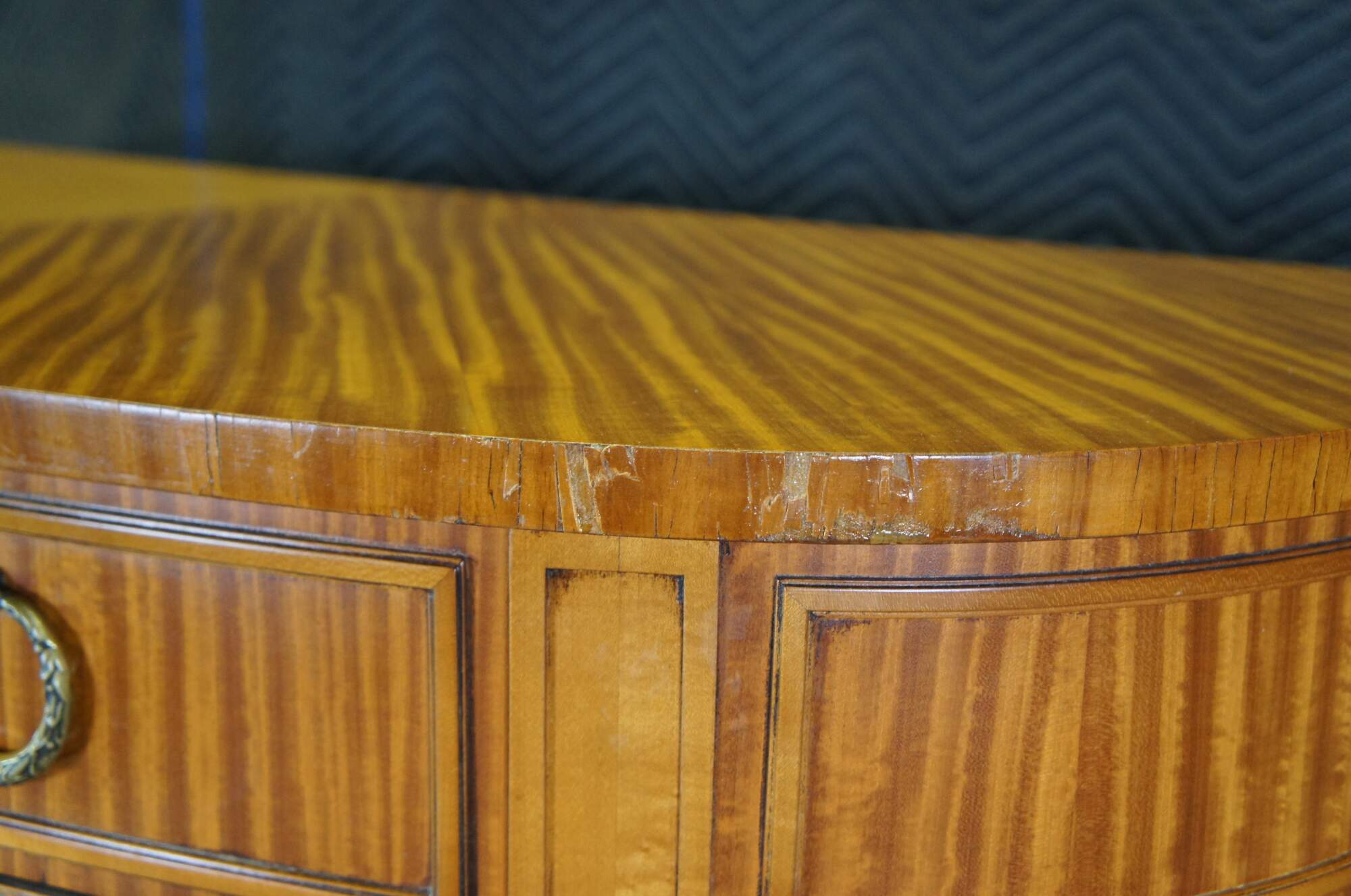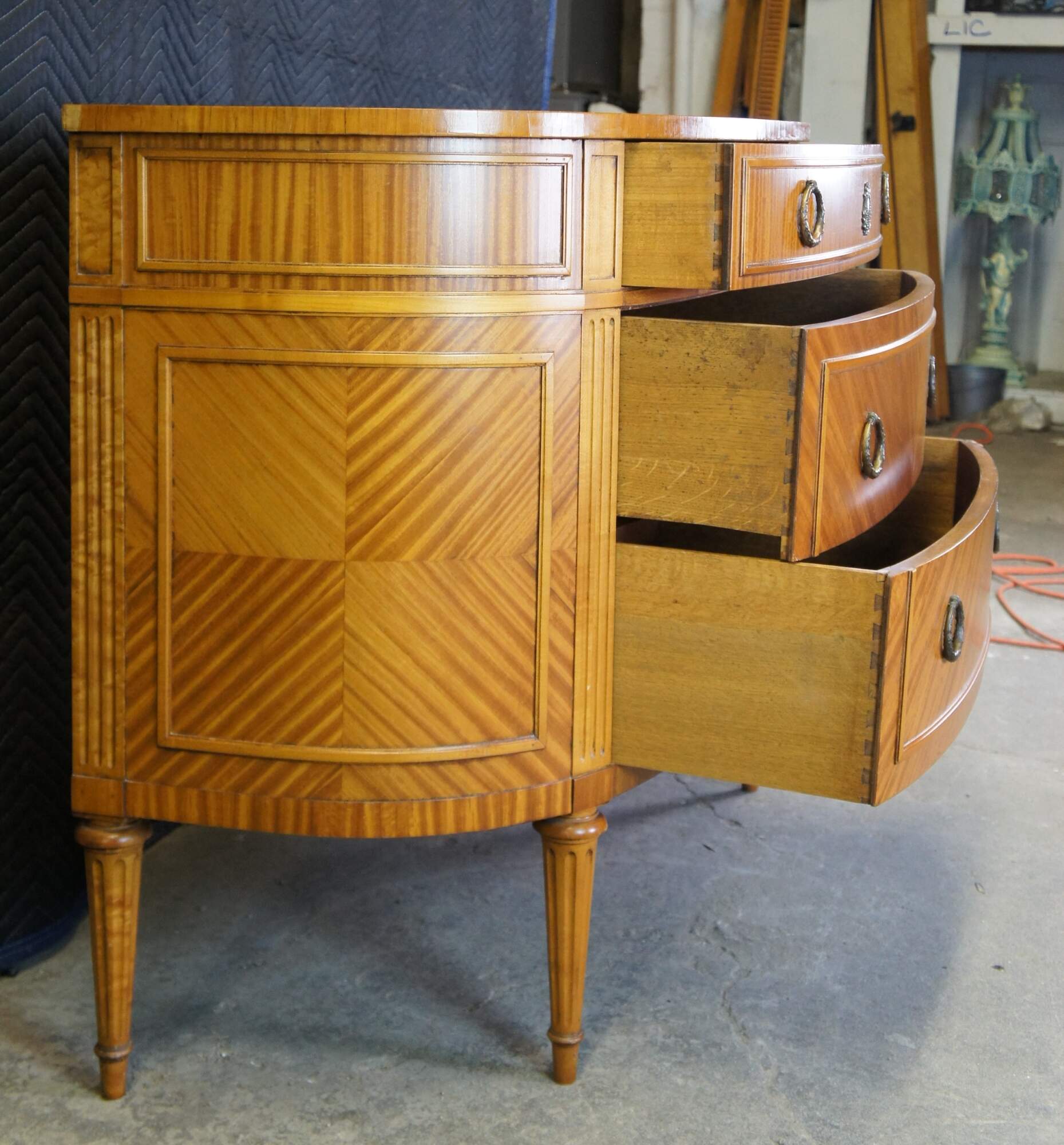An exquisite entry console, buffet, server dresser or chest of drawers by Robert W. Irwin Furniture Company. Circa 1928-1940. Crafted from satinwood featuring a half round demilune or bow front form with three drawers, fluted accents, neoclassical hardware and matchbook veneer.