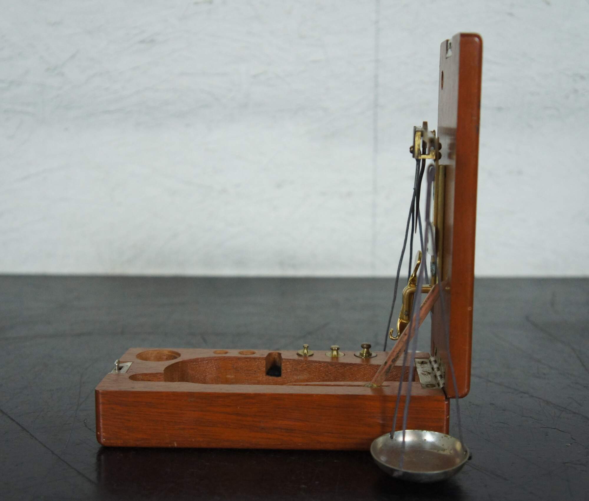 Vintage small Fisher Scientific Company apothecary balance in wooden case. Includes 2, 5, and 10 gram weights. circa mid 20th century