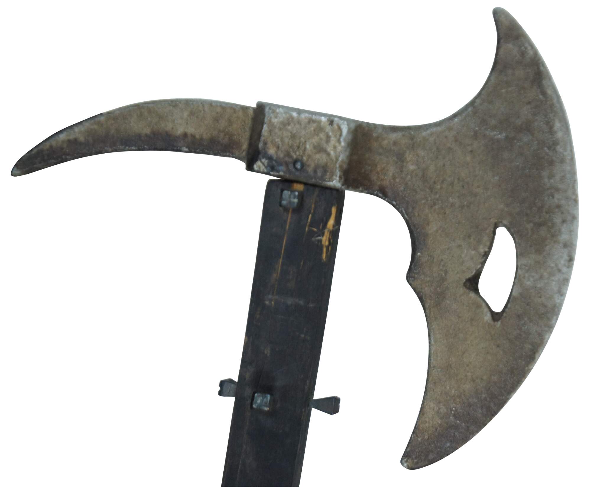 Vintage reproduction medieval style battle axe with a long black wood handle studded decoratively with nails and accented with chain.