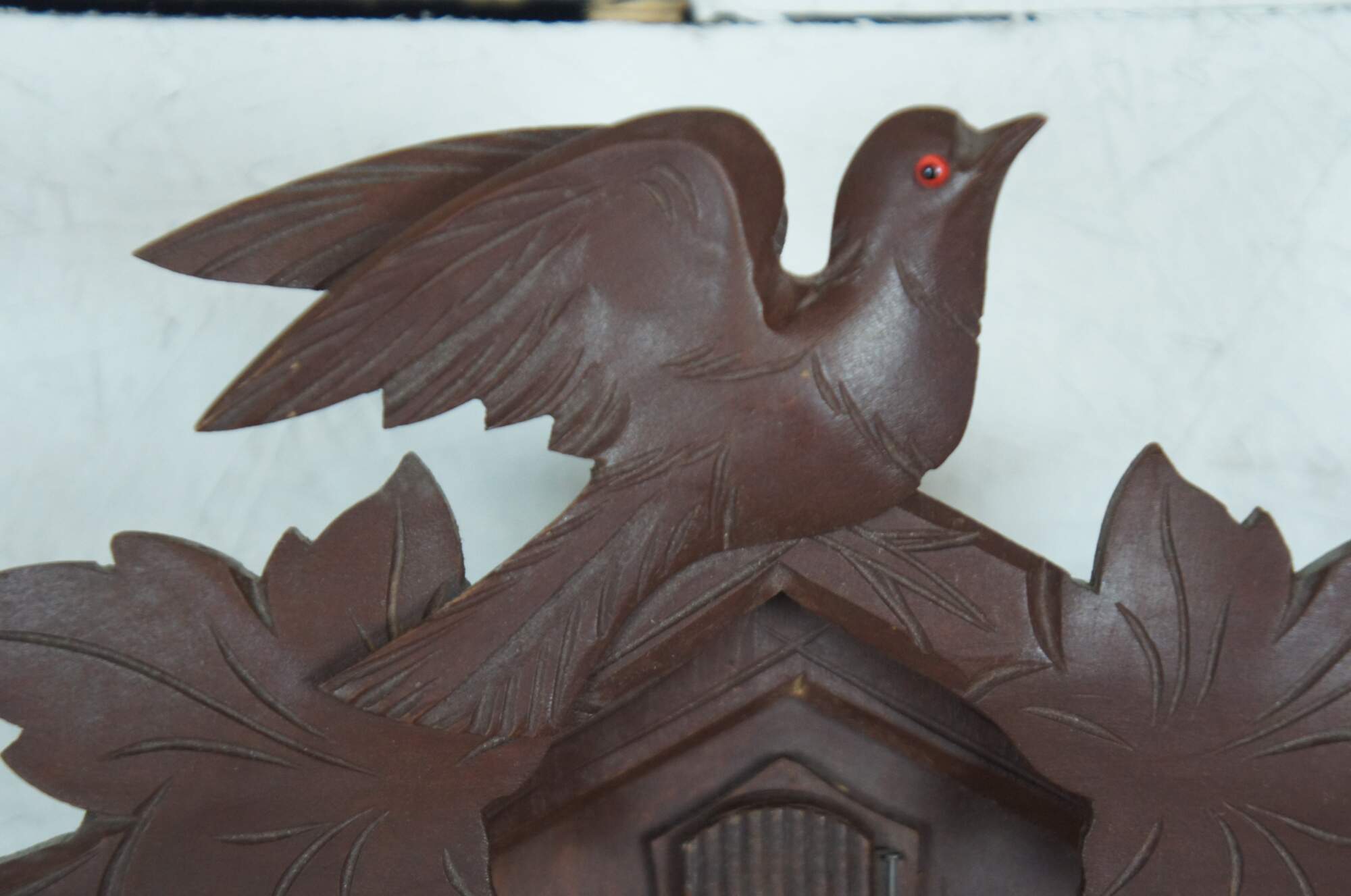 Antique circa 1930’s German Black Forest cuckoo clock decorated with carved branches, leaves and bird with orange glass eye; includes two pine cone weights. G. M. Angem works, marked on back German 605 F.