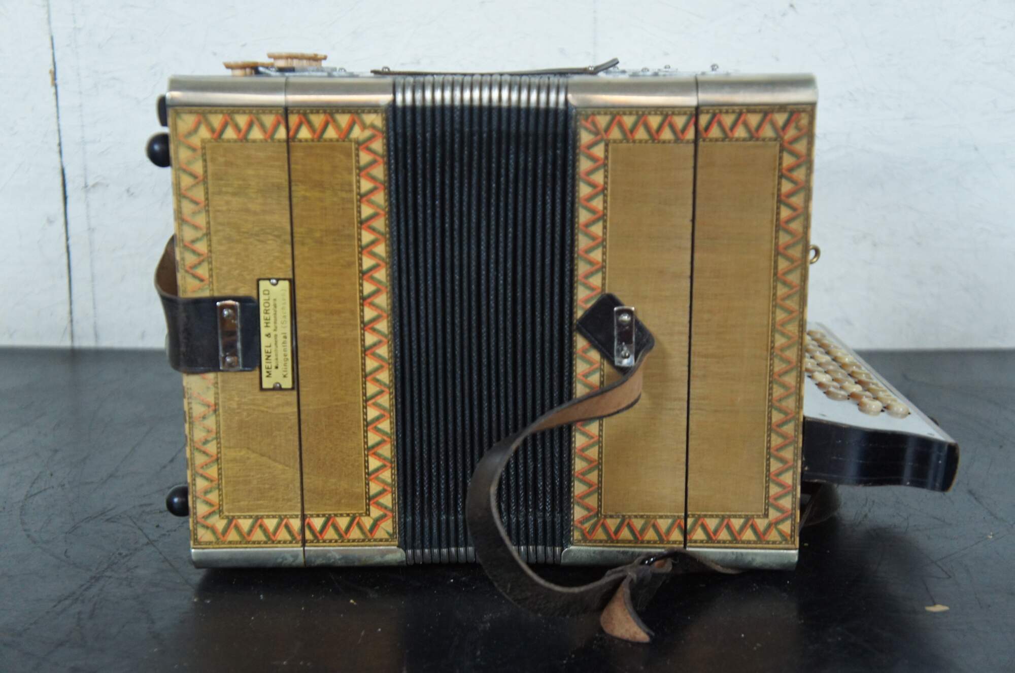 Antique inlaid parquetry design and painted accordion or squeezebox with mother of pearl buttons, leather strap, and a wooden case lined with green baize / felt, made by Meinel & Herold Musikinstrumente-Harmonikafabrik Klingenthal (Sachsen).