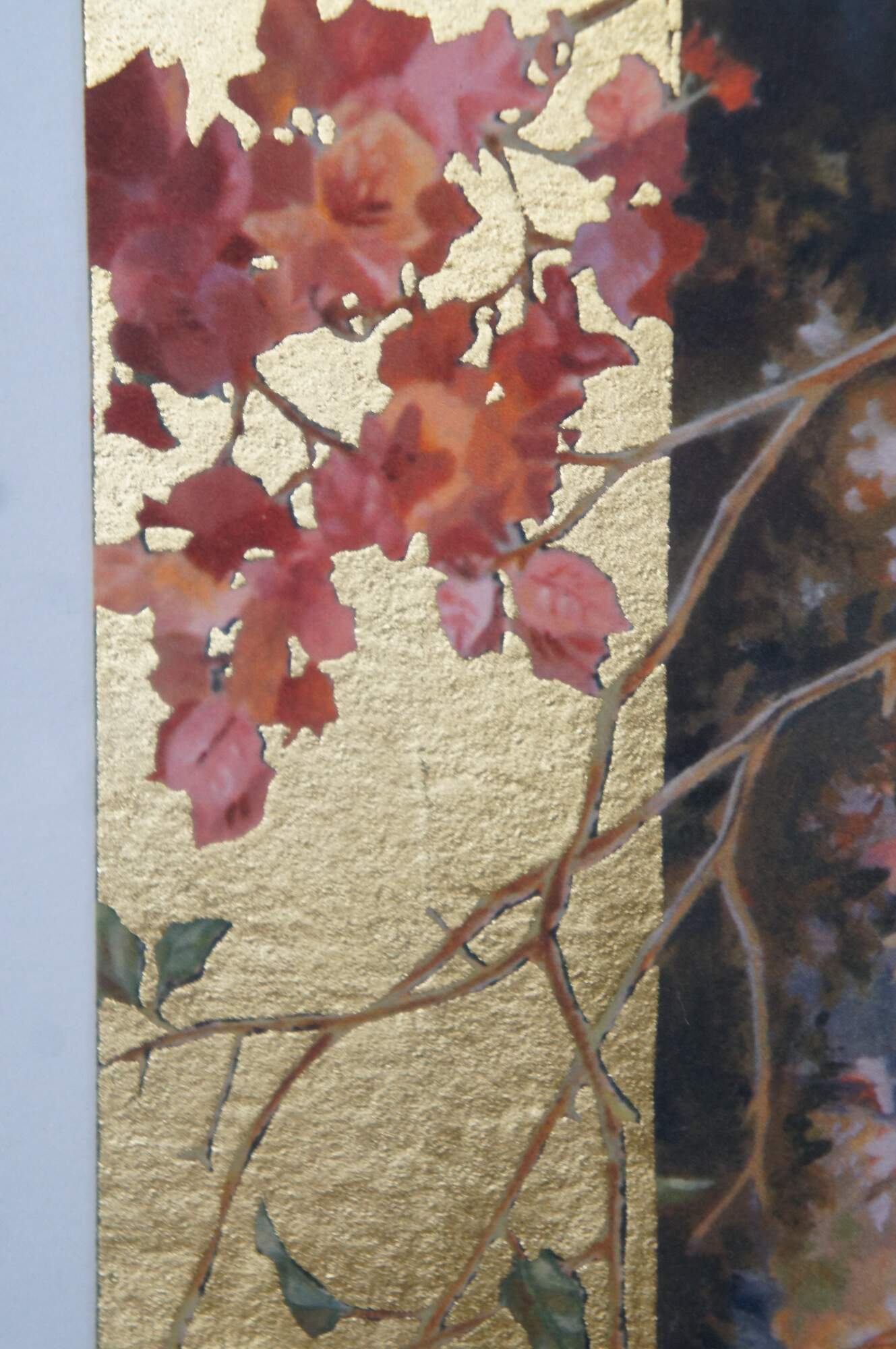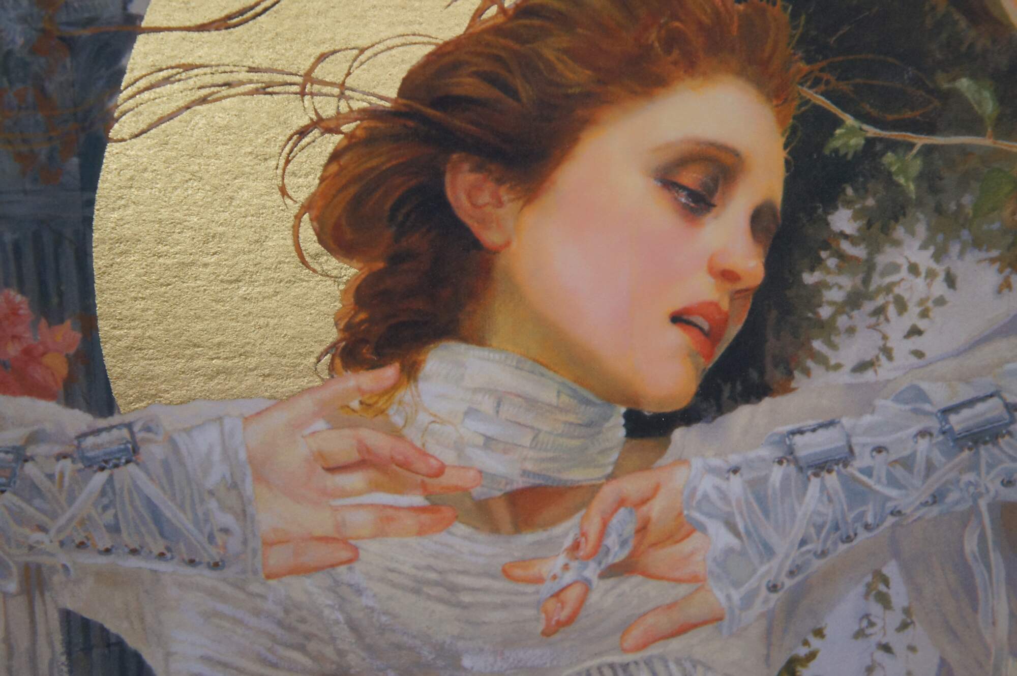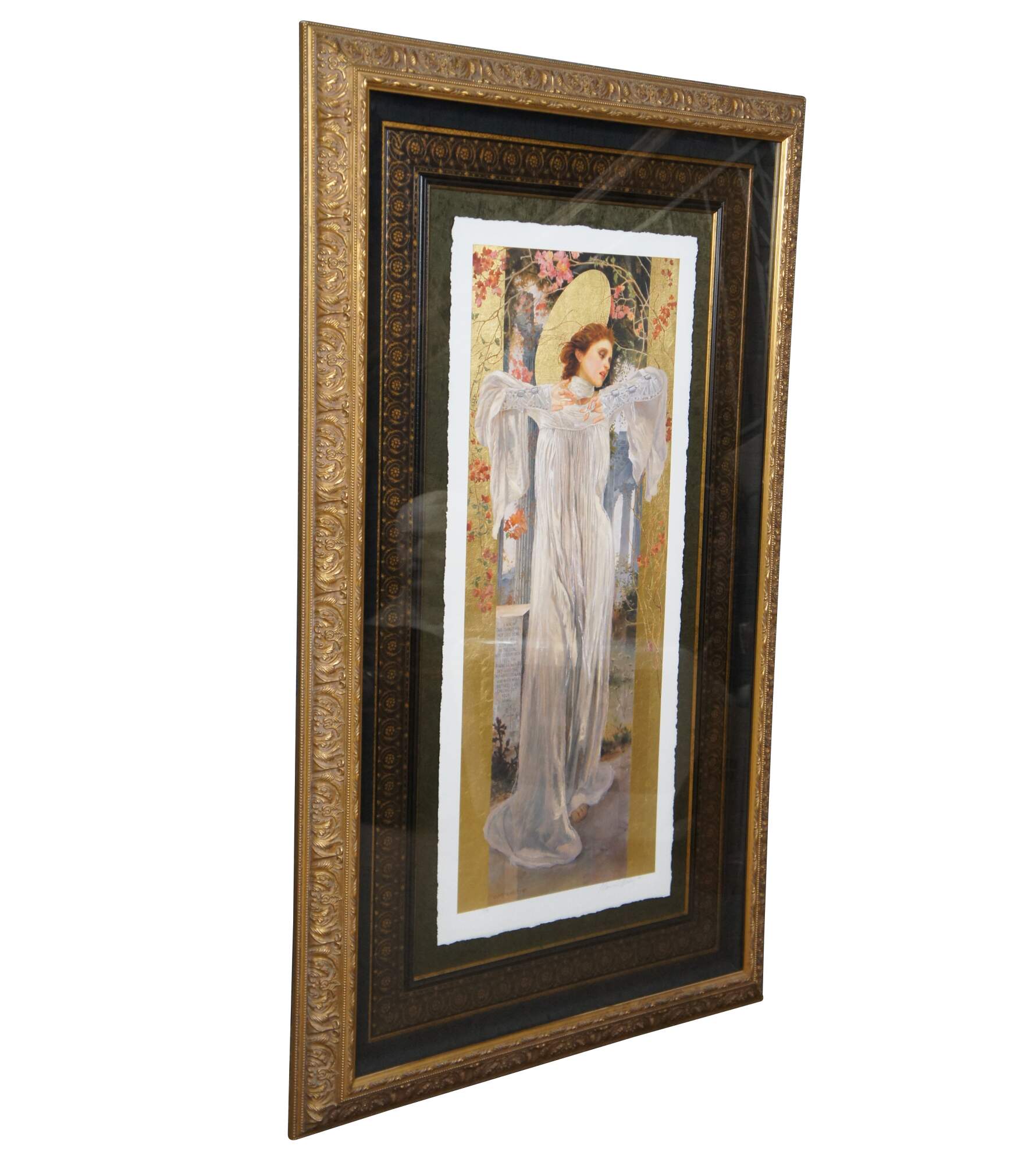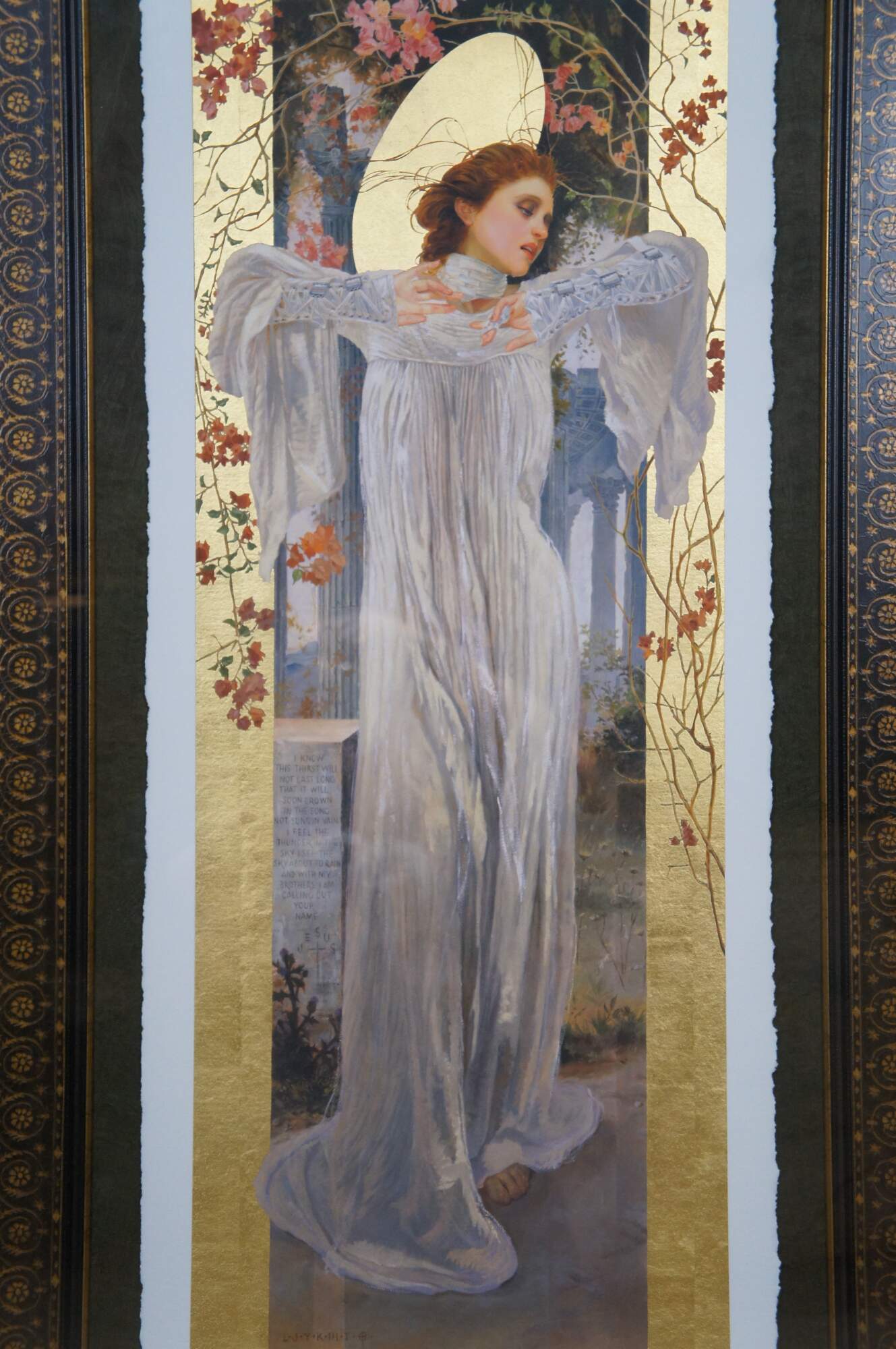 Elaborately framed gilded / gold leaf giclee print of “Eternal Separation” by Manuel Nunez in 2000, pencil signed and numbered 15/75. The art shows a female figure in a long white gown with a golden halo behind her head, standing in a colonnade, under an arch of flowering branches, framed on either side with panels of gold leaf.
