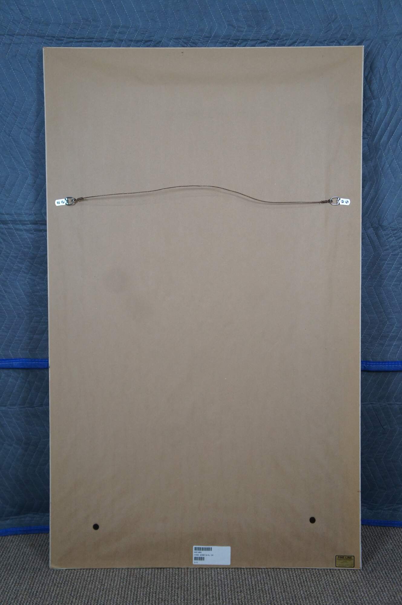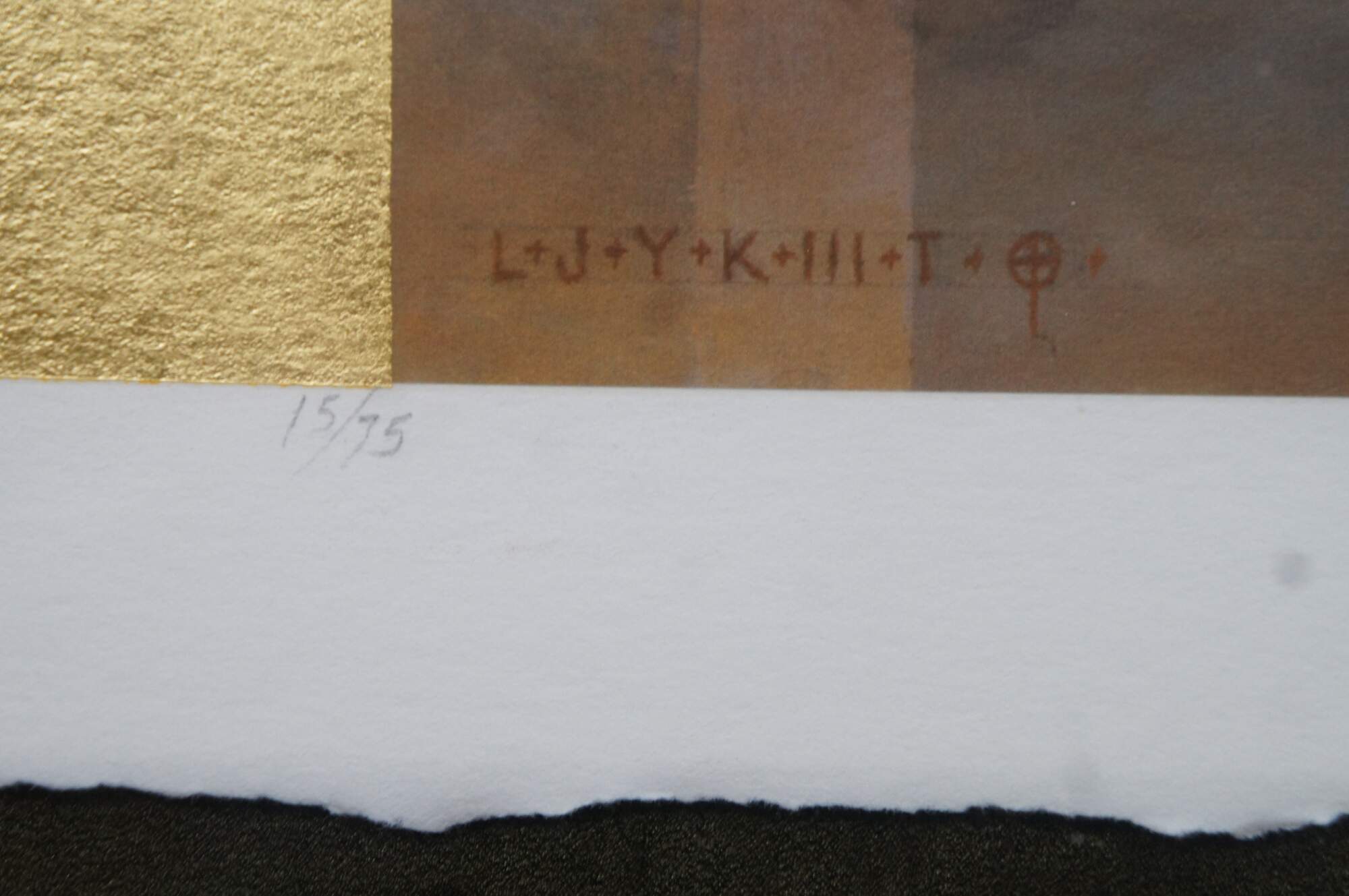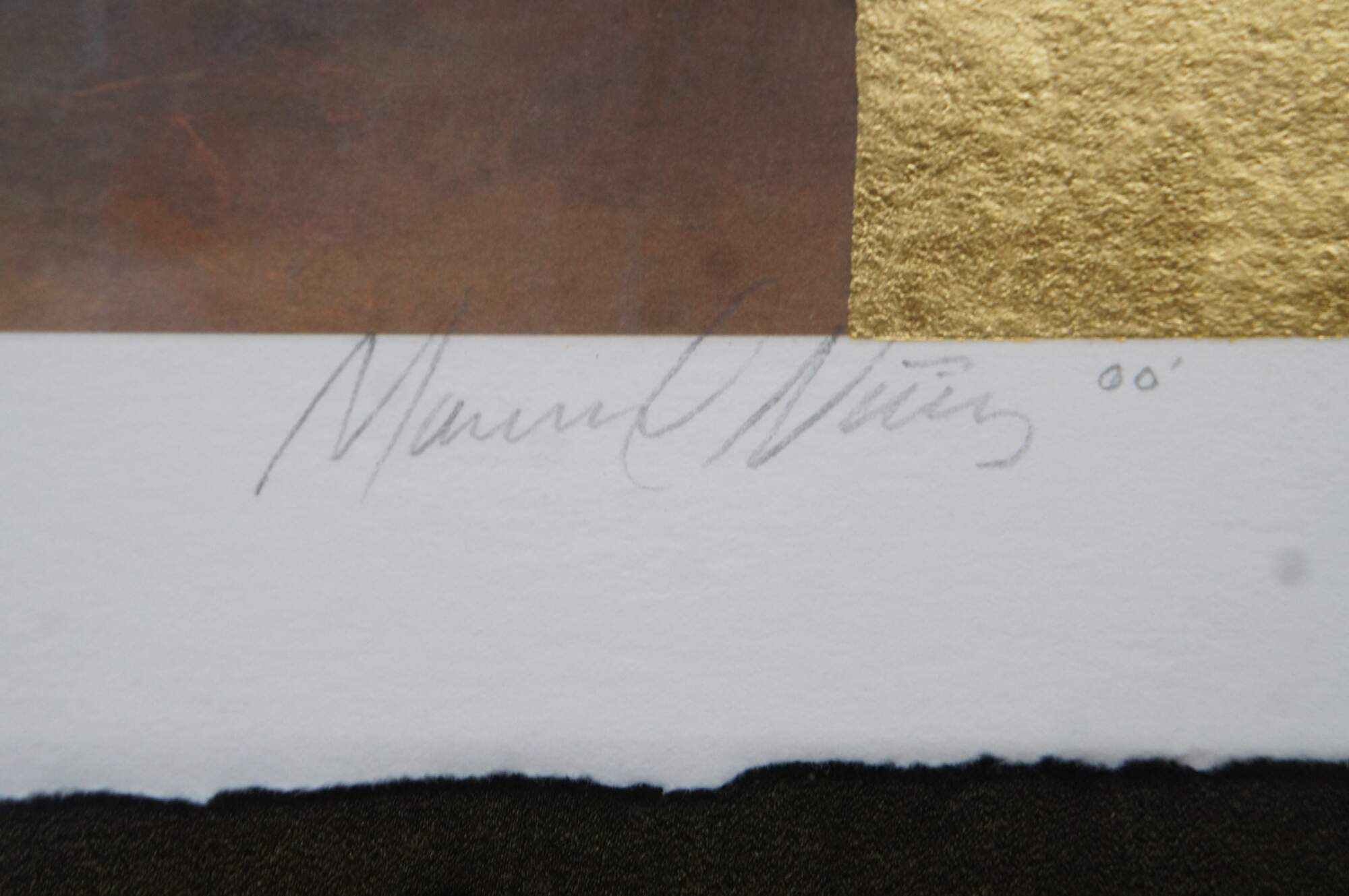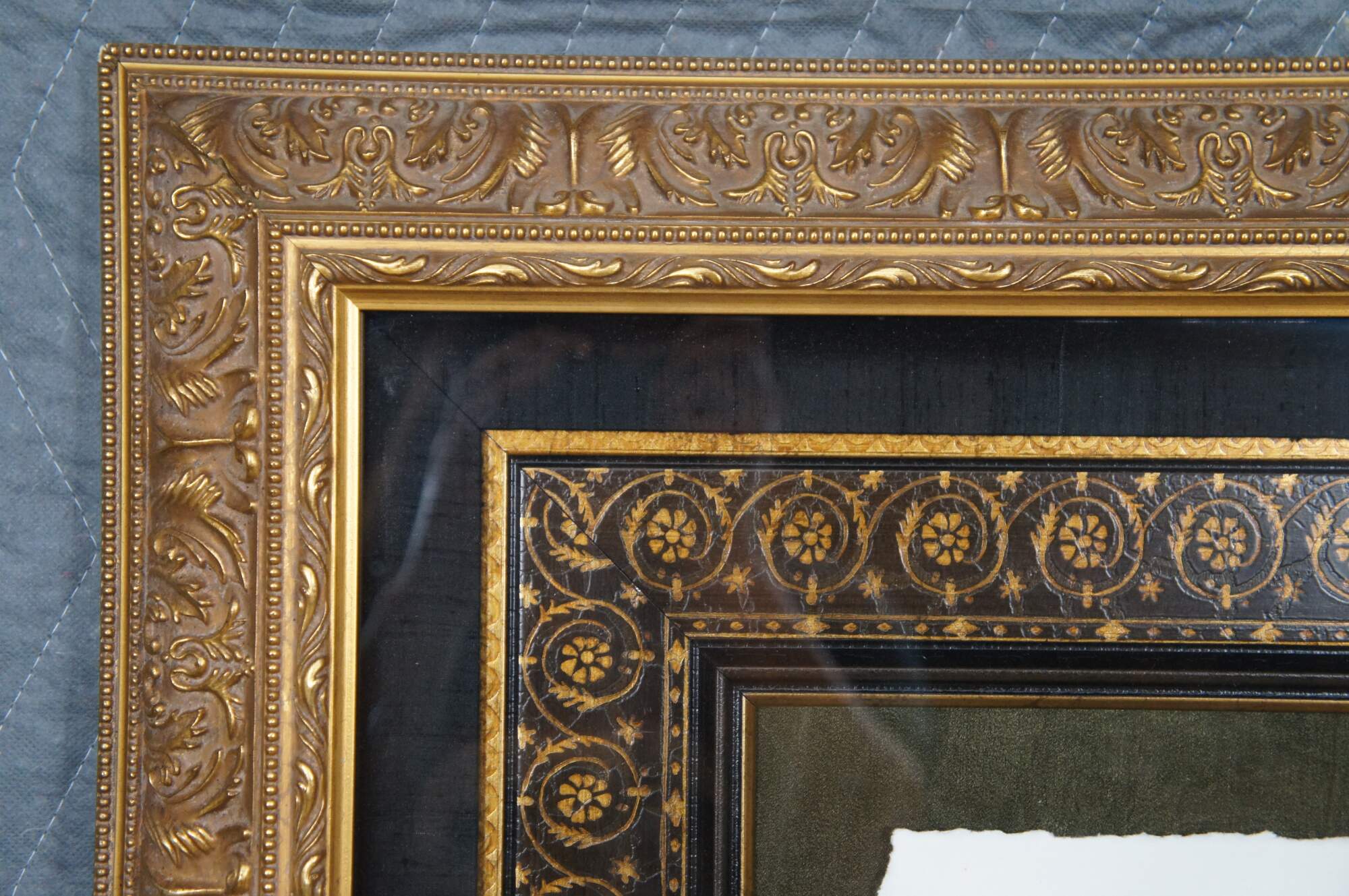 Elaborately framed gilded / gold leaf giclee print of “Eternal Separation” by Manuel Nunez in 2000, pencil signed and numbered 15/75. The art shows a female figure in a long white gown with a golden halo behind her head, standing in a colonnade, under an arch of flowering branches, framed on either side with panels of gold leaf.