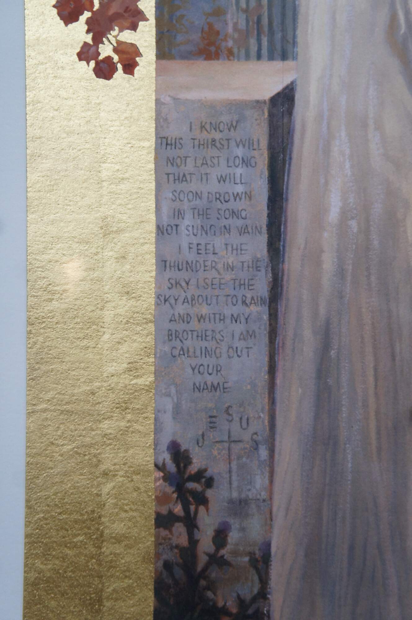 “Manuel Nunez Spanish Artist: b. 1956. ""My images are of strong women,"" Nunez says. ""Beautiful, but not exploited. Women who are sensual and virtuous; wrestling with the underlying conflict of what life is versus what it should be."" Nunez describes the symbolism in his work in the words of a biblical scholar. Not firebrand, but a gentle imparting of the tenets of his belief. Almost every stroke is alive with the artist's own faith and the objects which serve to keep that spirit always in his sight. Manuel Nunez was born in 1956, into a family versed in the arts and Latino culture. His father, Manuel Nunez Sr., was a well known singer and song writer who recorded nine Spanish-language albums in the 1950's. ""I listen to his music all of the time, but it's only now that I really appreciate his music and what he was doing with it."" It could be said that in this atmosphere, the spirituality which shaped his creativity was upon the artist from his first breath. As he grew, it was then only a short leap of logic to jump from an exploration of his creative spirit to his human spirituality. It was a larger leap to then explore his way back from his religious roots to his art. Yet in that very transcendence is the brilliance in which the art of Nuñez resides. The use of his trademark - a hand-applied 23-karat gold leaf - is indicative of the spiritual roots of the artist and its interpolation into his work. ""The gold itself is a dichotomy,"" he explains. ""Gold can, at the same time, symbolize decadence or indulgence and the righteous purity shown in Russian icon art."" In Nunez work, these disparate elements reign in conjunction with each other, as does the feminine mystique which combines virtue and sensuality - love and lust coexisting within the compositional expression as they cohabit the body and soul in life. Manuel Nuñez has taught at both the Otis Parsons Institute in Los Angeles, and The Art Center College of Design in Pasadena, California, which he also attended.”