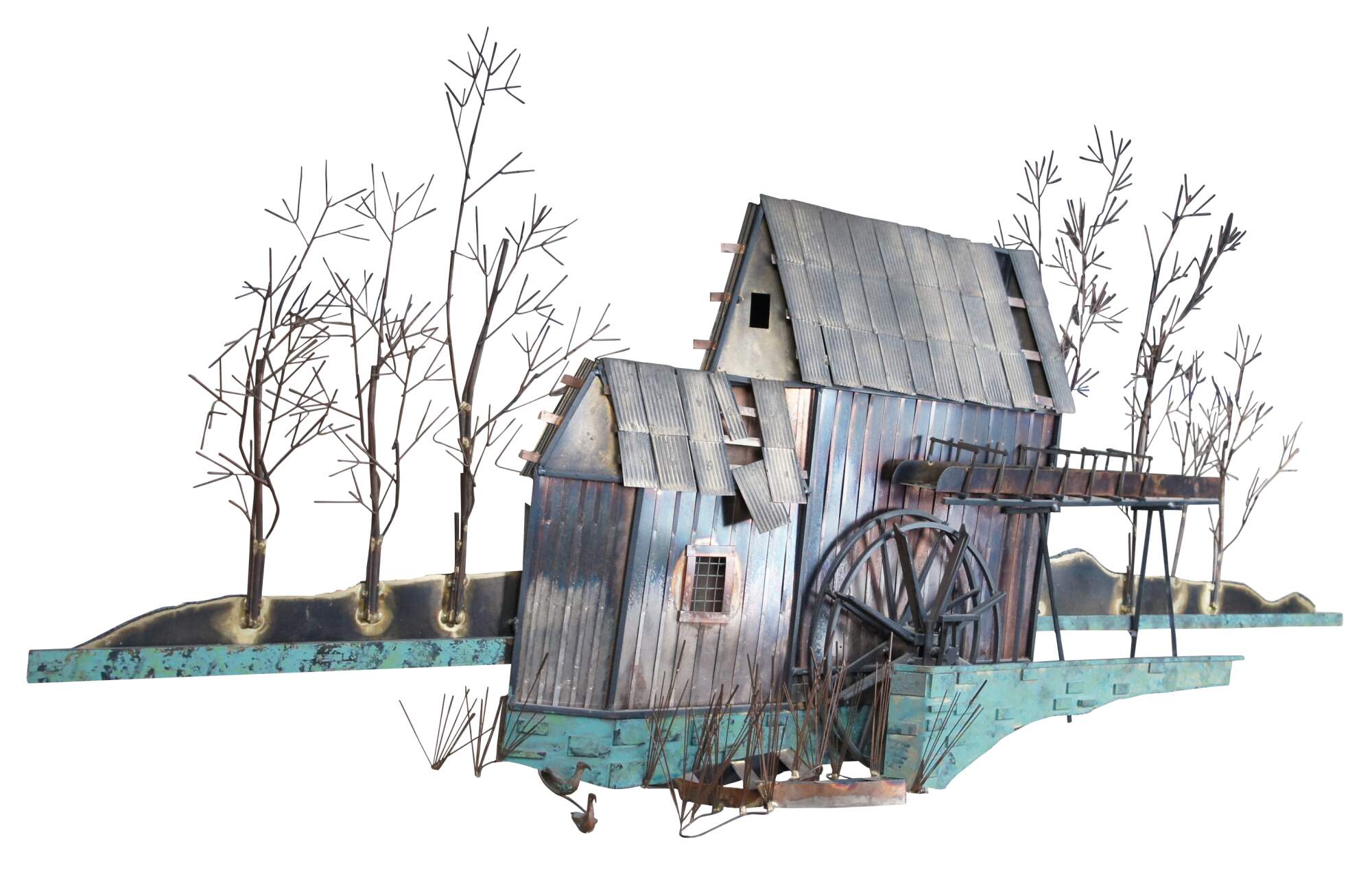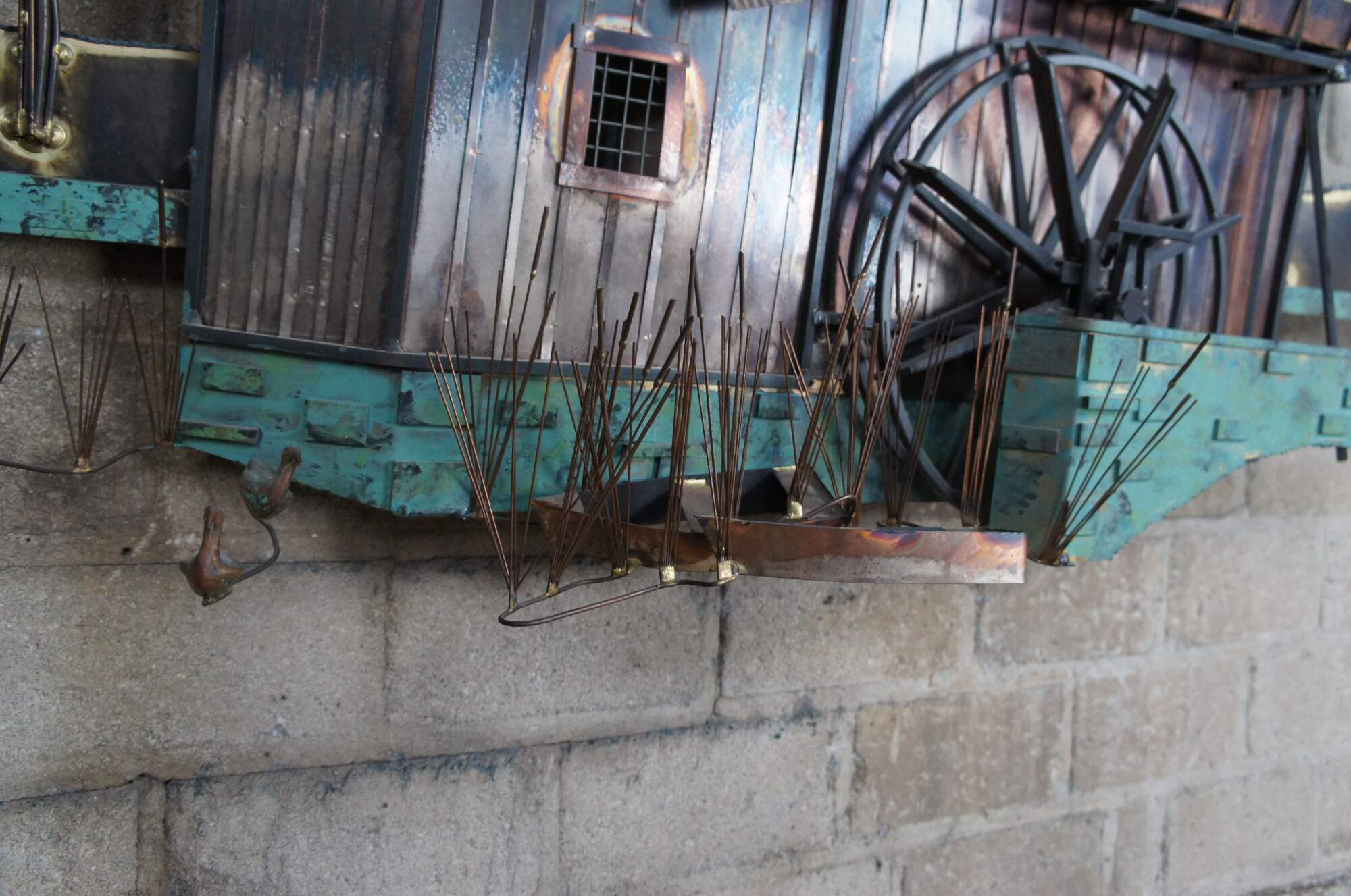 1970s mid century Curtis Jere brutalist style wall art sculpture. Made of copper, brass and steel featuring a primitive country or farmhouse landscape scene along a river complete with mill house, barn and water wheel.