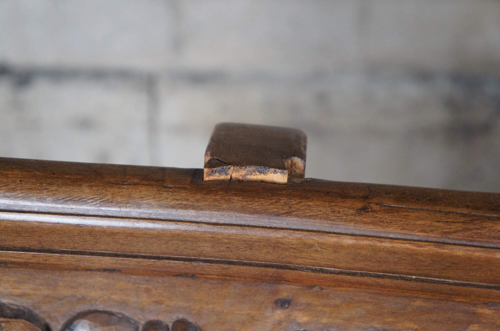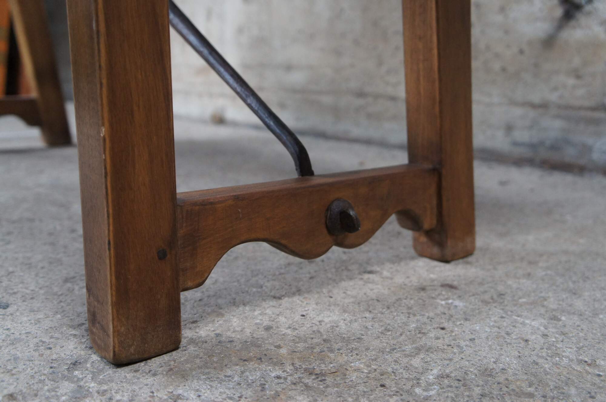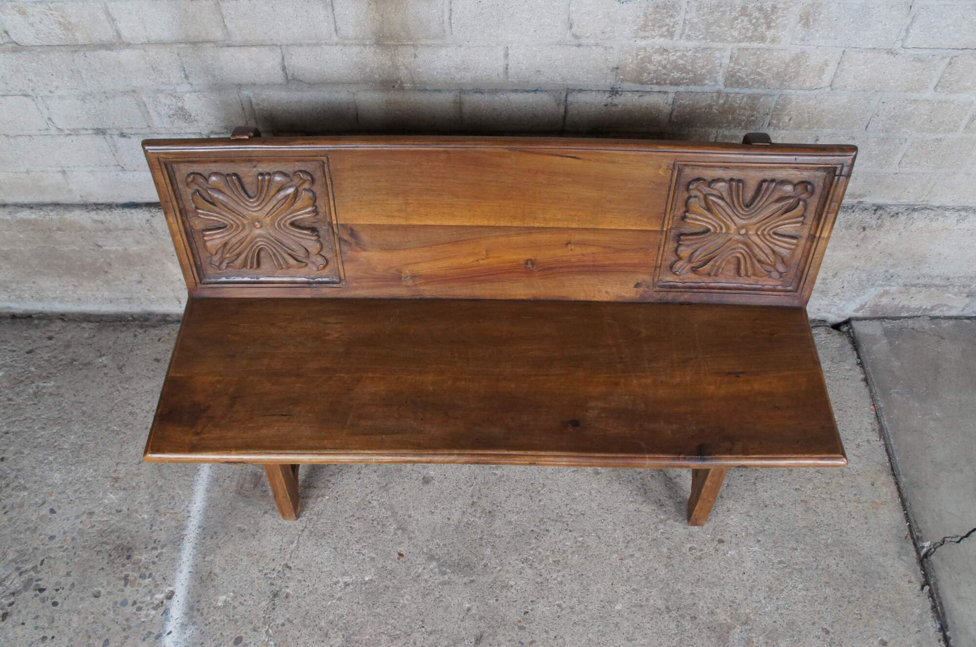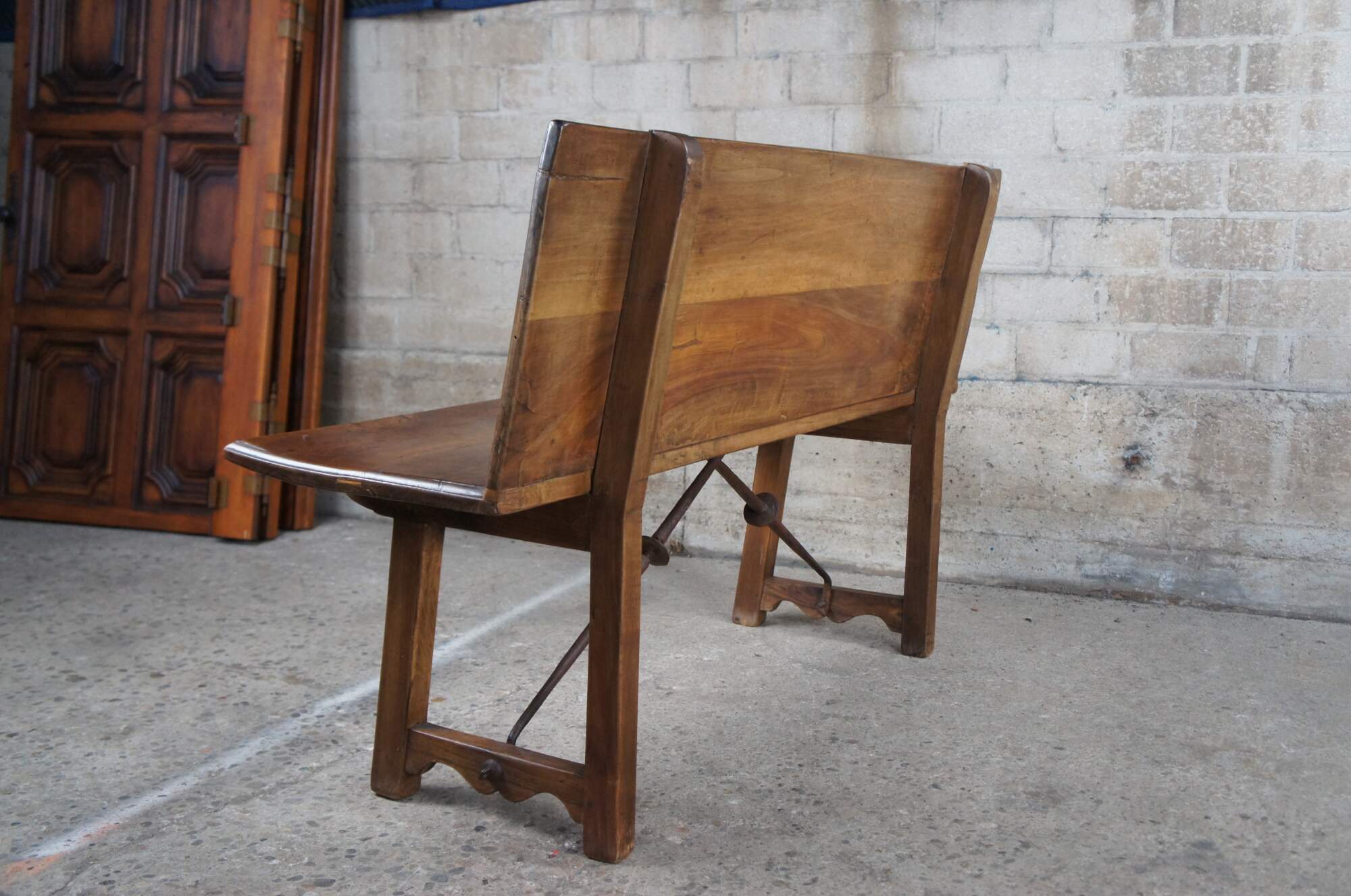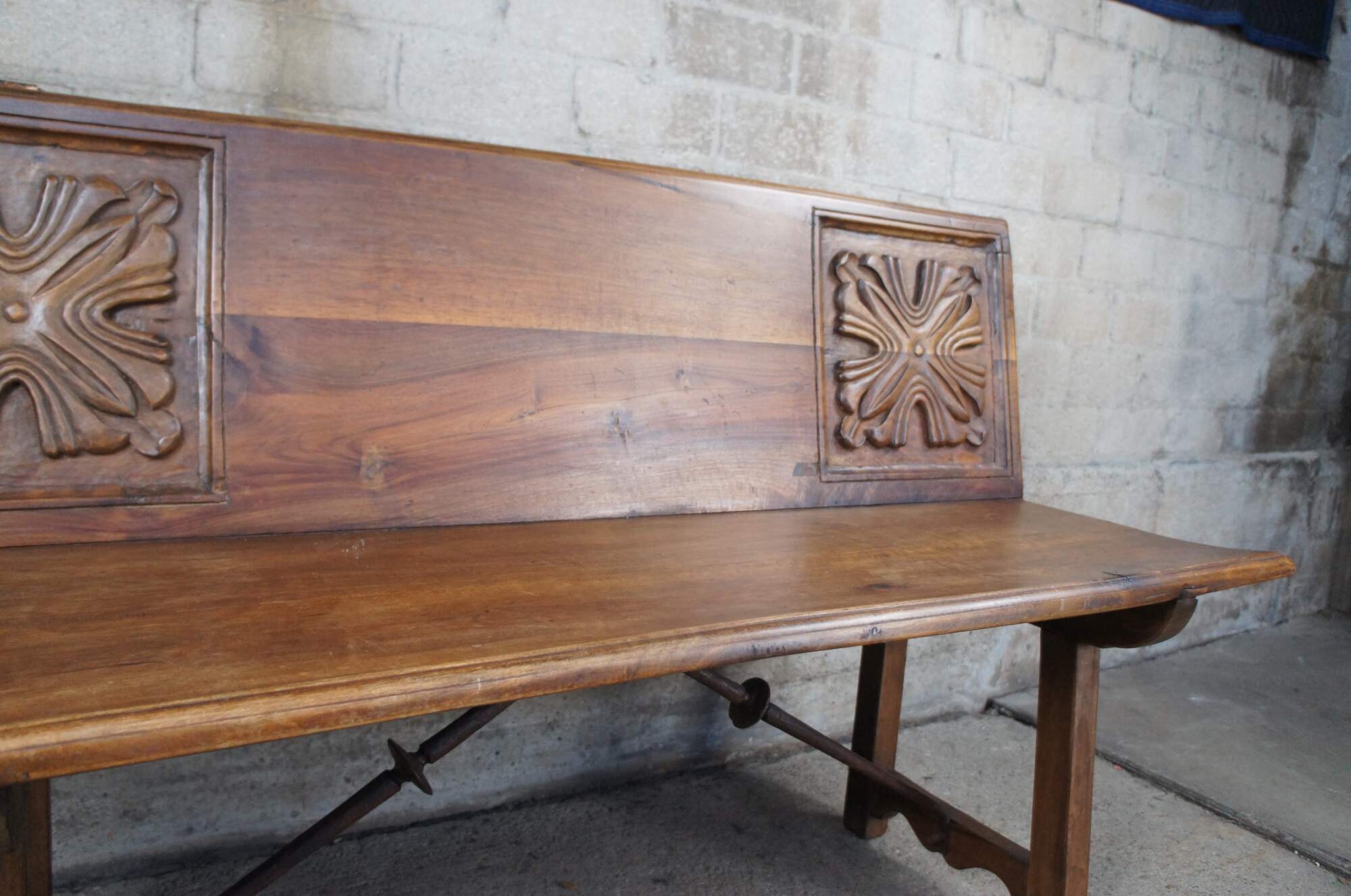 Antique Spanish Renaissance entryway bench, banquette or "Escano" in Spanish. Circa 19th Century. Made from walnut with beautifully carved medallions along the back and iron braces between the legs.