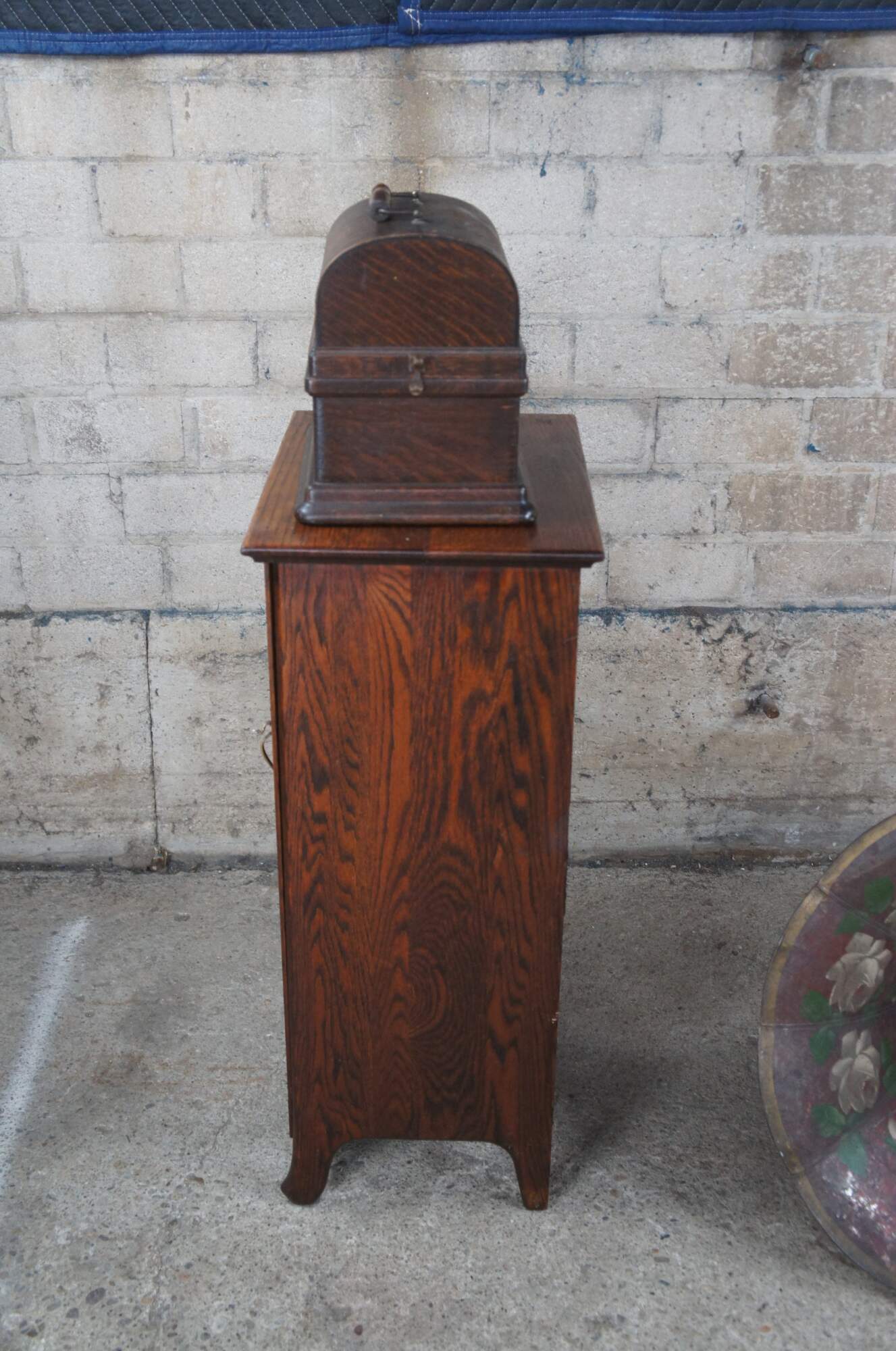 An exception Early Thomas Edison Model A Cylinder Phonograph with original horn, tube cabinet & 93 records. Phonograph box and cabinet are made from oak in Late Victorian manner with a few quartersawn boards. Horn is red with hand painted motifs. Cylinders come with original boxes for storage. Serial no 30819