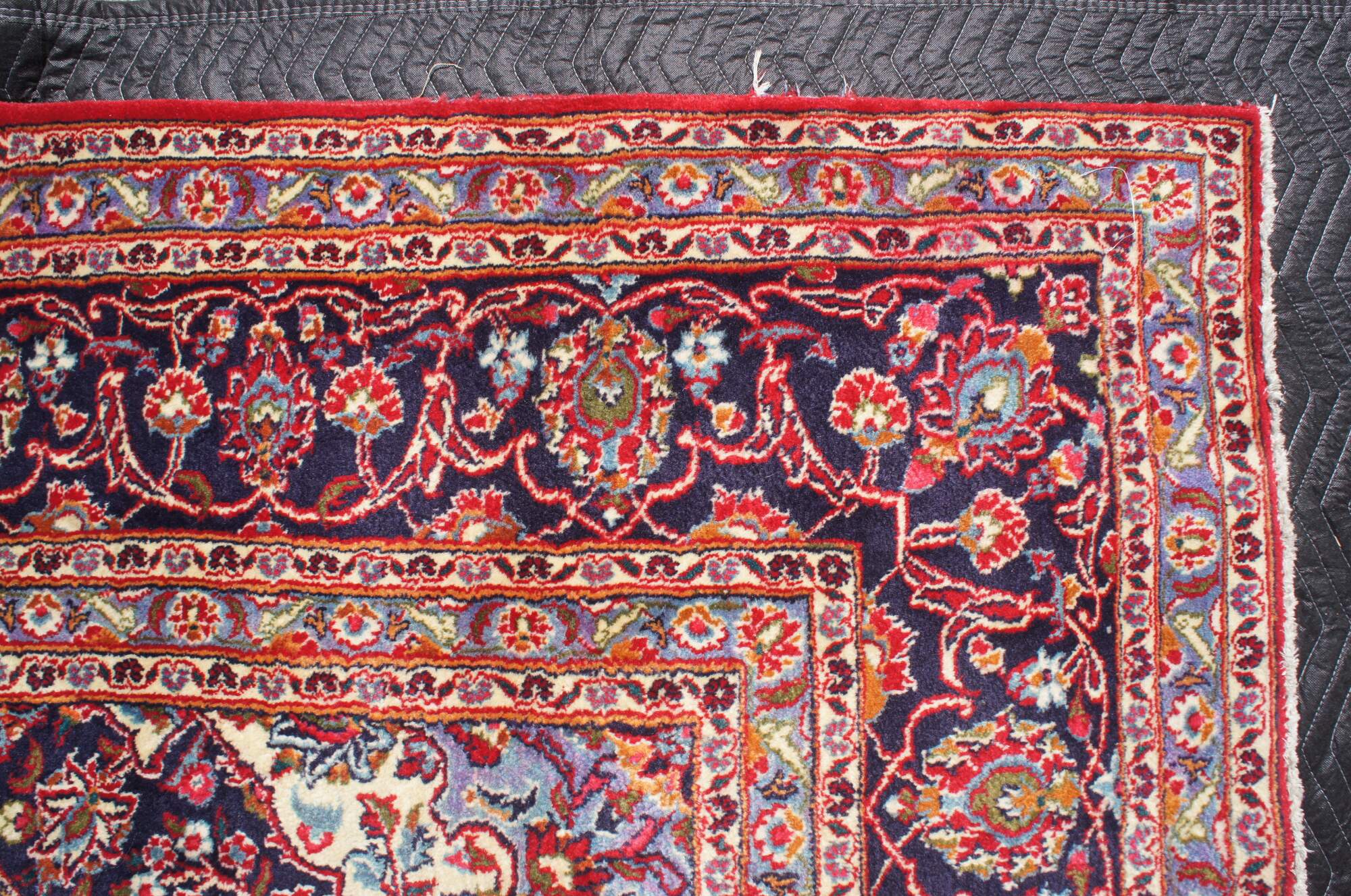 A vibrant mid 20th century hand knotted wool area rug. Made from 100% wool with a field of red and blue with interlaced floral deisgn. 121-144 knots per square inch