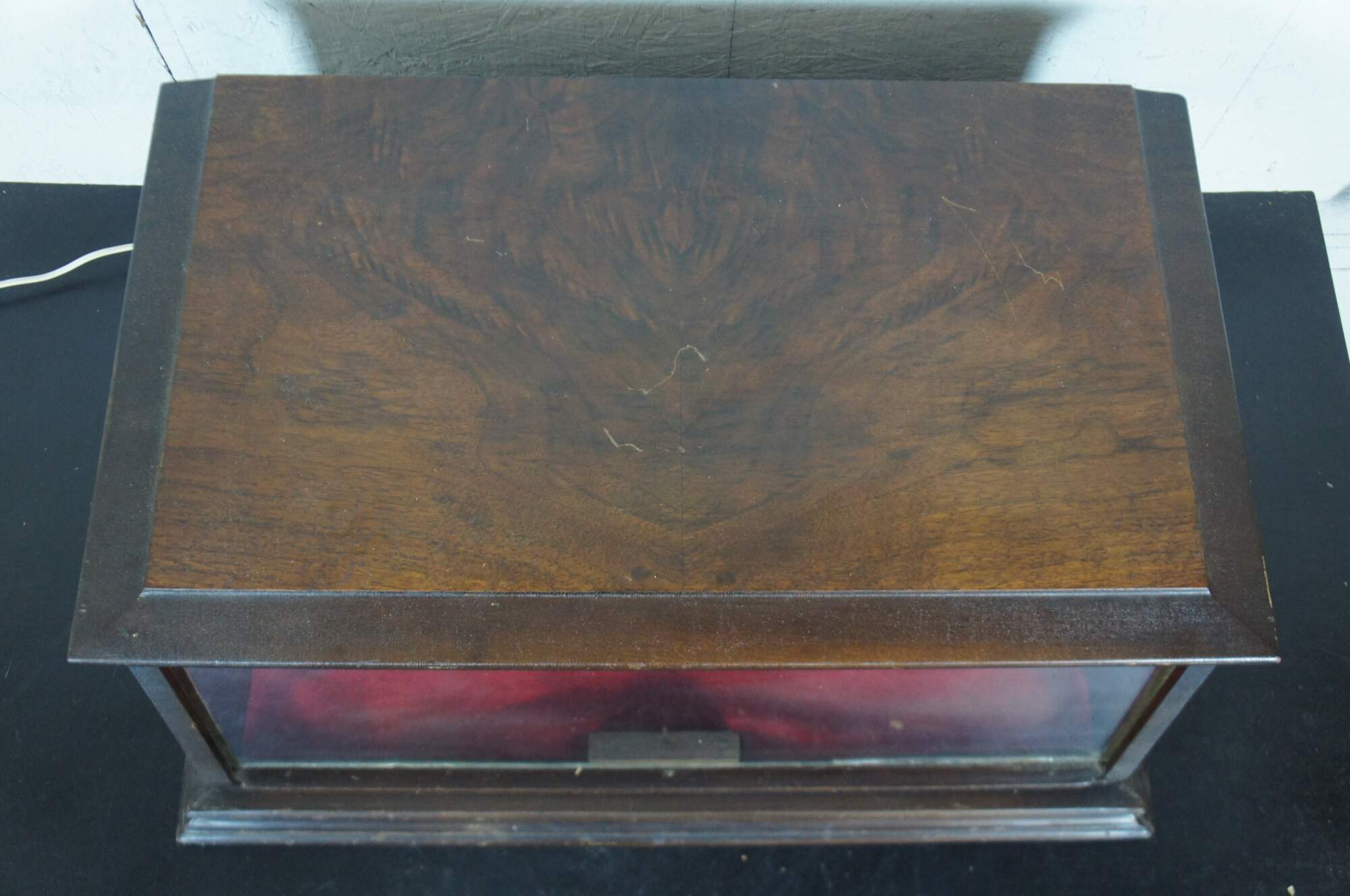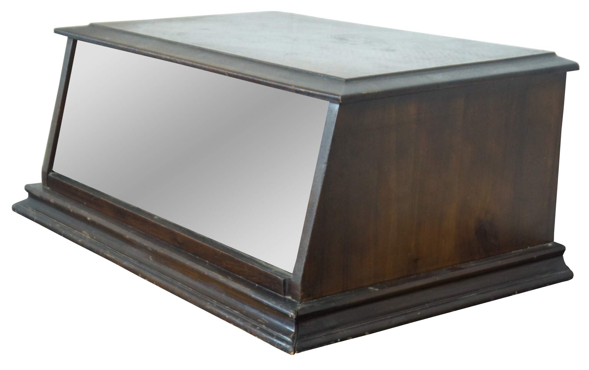 Antique early 20th century countertop display case with a solid walnut top and sides, angled glass front and non original interior lighting.