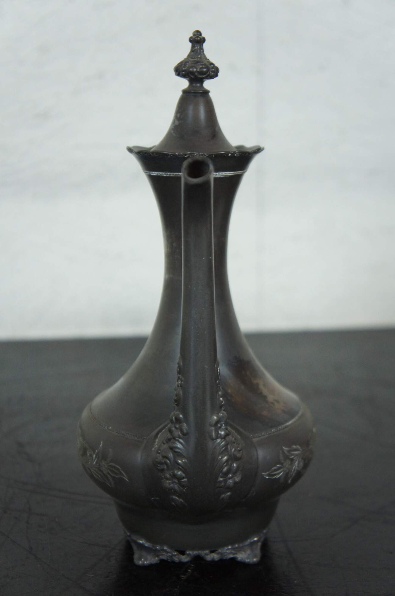 Antique Victorian goose neck silverplate coffe or tea pot by Homan Silverplate Co. “Homan Manufacturing Company was founded in Cincinnati in 1847 by Henry Homan and Asa F. Flagg as manufacturers of Britannia ware under the name Flagg & Homan. The Homan family managed the business as Homan & Co until 1887, gradually changing from the manufacture of pewter, Britannia metal and German silver to electroplated silverware. Around 1896 the name of the firm was Homan Silver Plate Company, which was succeeded (between 1904 and 1915) by Homan Manufacturing Company. The firm went out of business in 1941.”