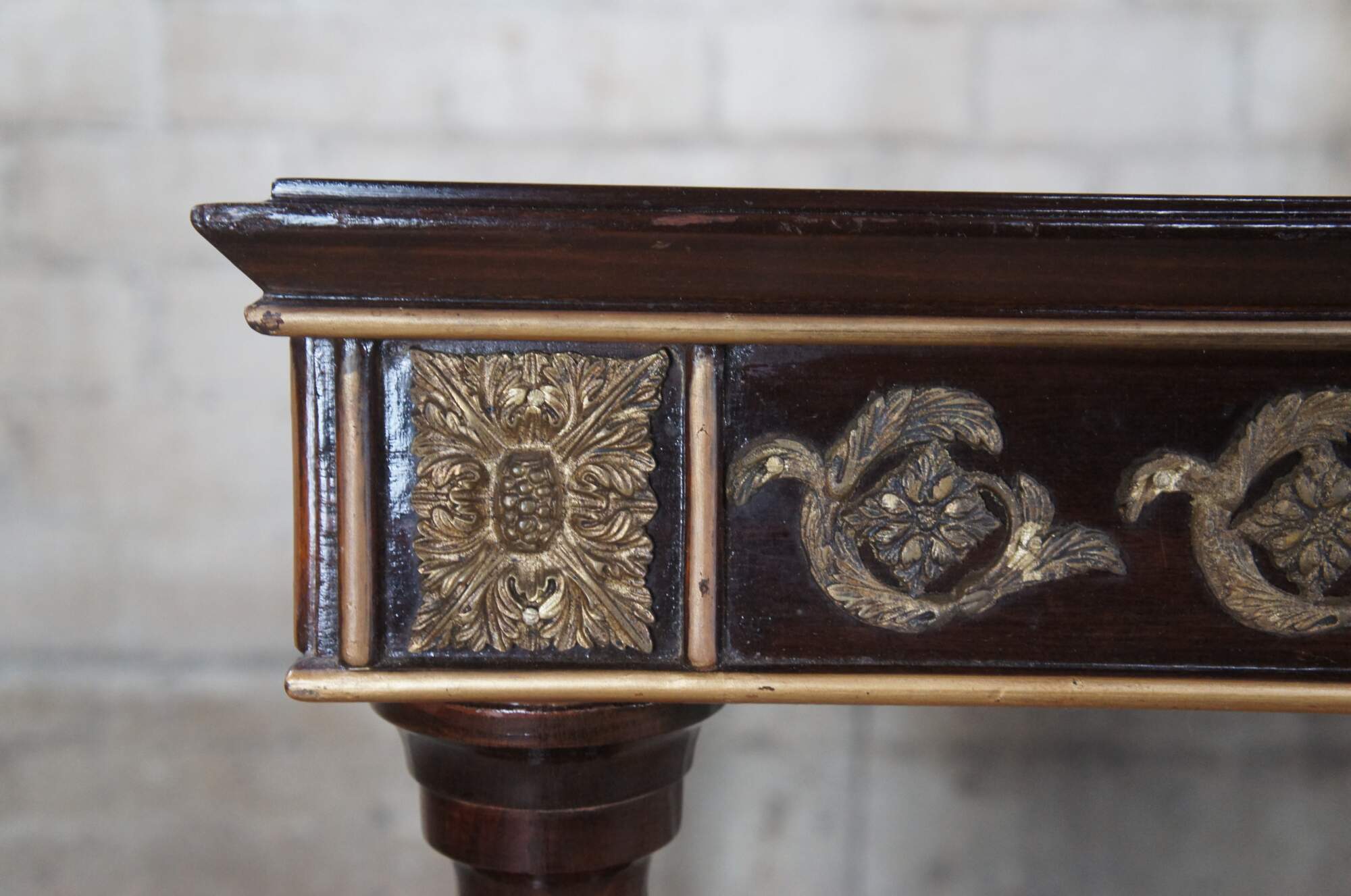 Vintage French Louis XVI inspired dining table or desk. Made in Cairo Egypt (Arabska Republika Egiptu) by Abbas, circa 1972. Made mahogany featuring an ornate frieze of brass ormolu medallions and gold trim over turned tapered legs.