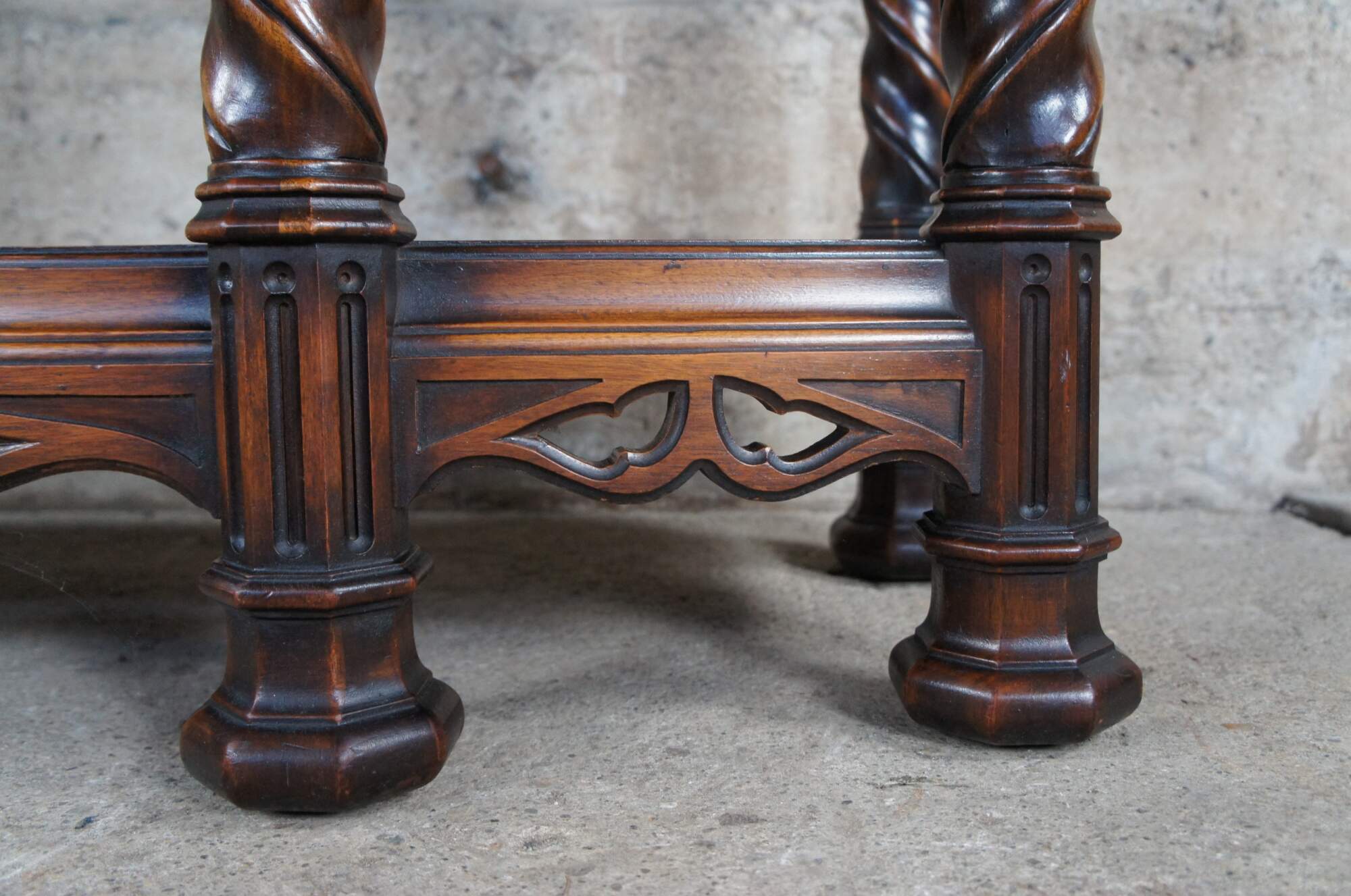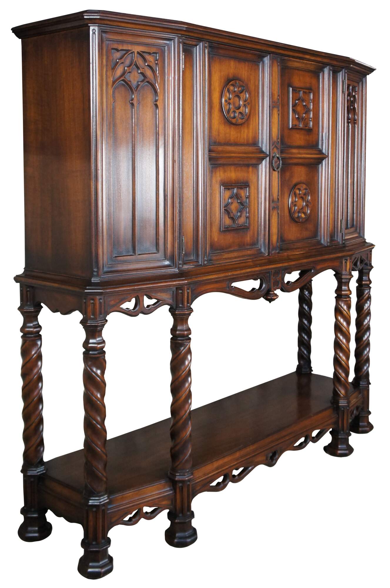 An exquisite early 20th century Rockford Furniture Co Gothic Revival livery cupboard, china hutch, buffet, console or drybar. Made of walnut featuring three long interior shelves with plate grooves concealed by carved doors, pierced aprons with drop finial, six barley twisted support legs and octagonal feet.