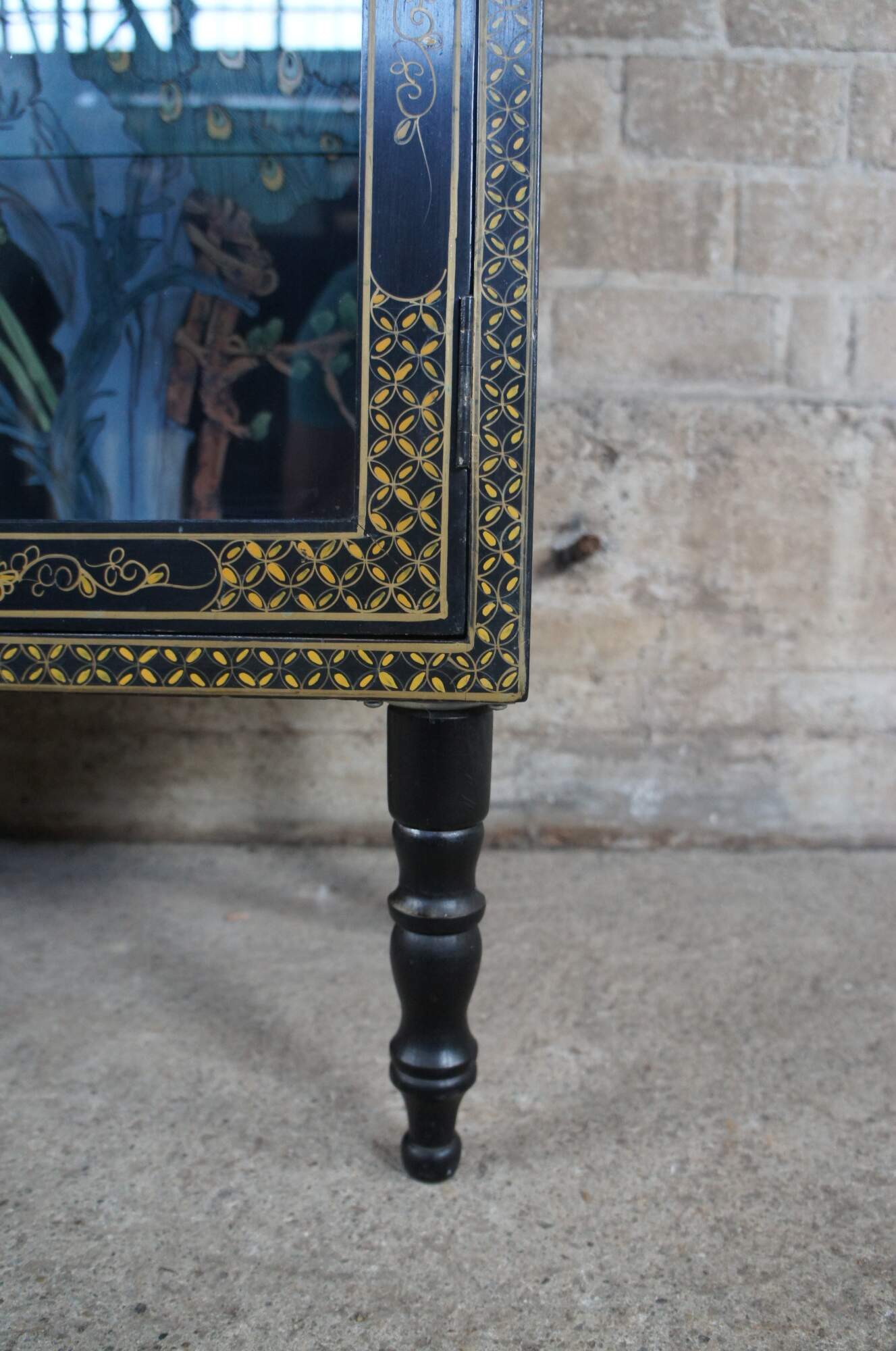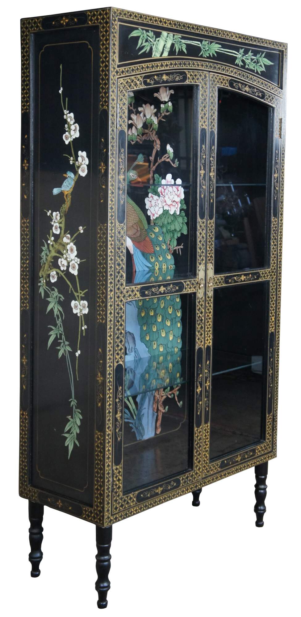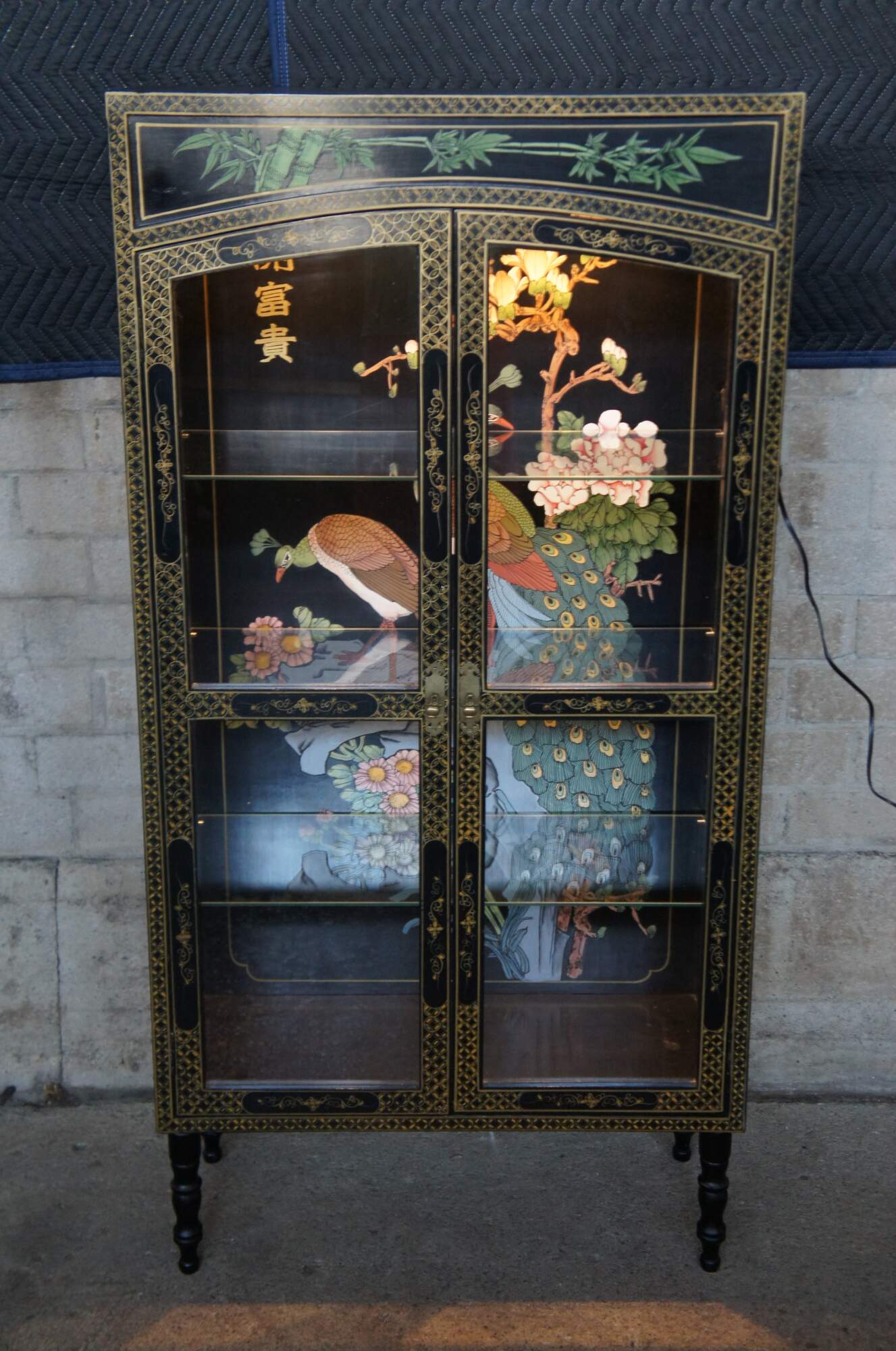 Mid century Oriental illuminating curio display cabinet featuring black lacquer finish with gold accents and two Peacocks nesting in a flowering tree with hummingbirds / birds.