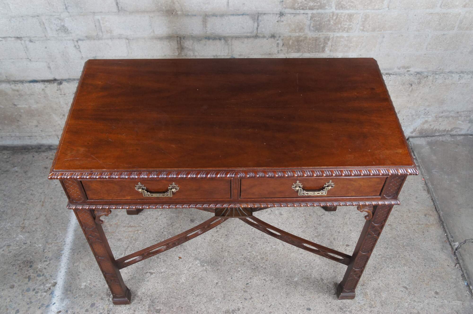 Mid 20th Century Chinese Chippendale Console table or server. A rectangular form made mahogany with two dovetailed drawers and pagoda form hardware. Features gadrooned aprons, ornate spandrals and lattice carved stiles and legs. The table is supported by marlborough legs leading to block feet. The legs are connected by ornate pierced and arched fretwork stretchers that are centered by a pagoda form finial. An outstanding design that will add grandeur to any space. Marked along the back 20041-535-715 Console