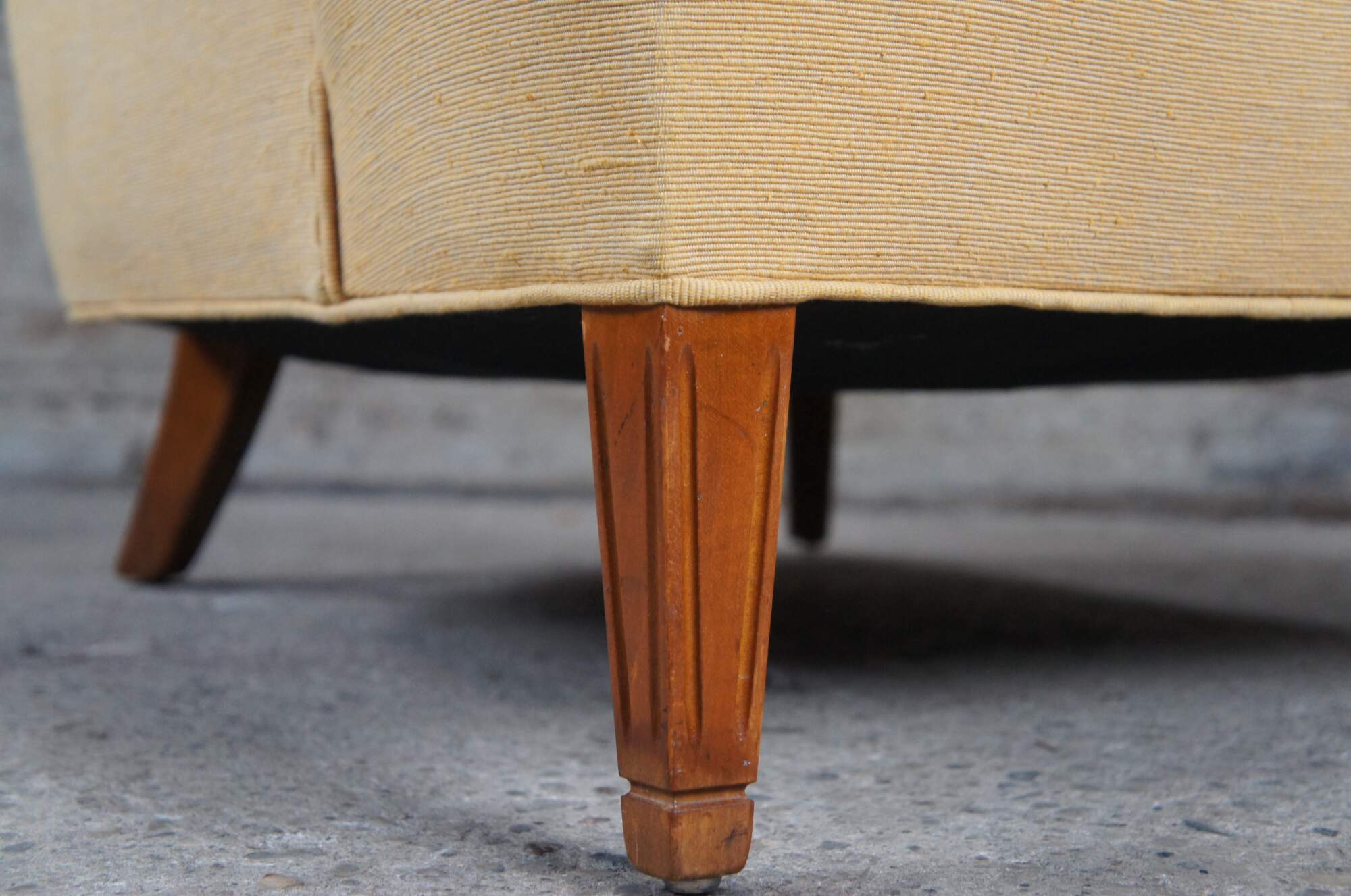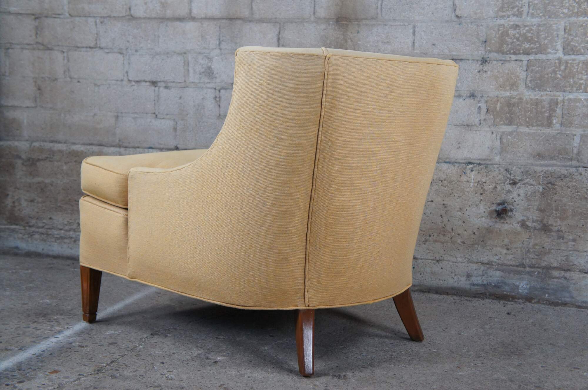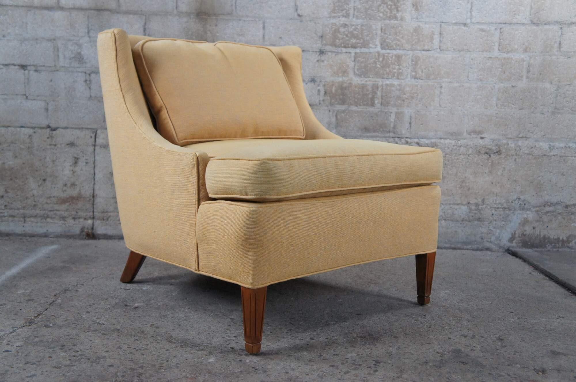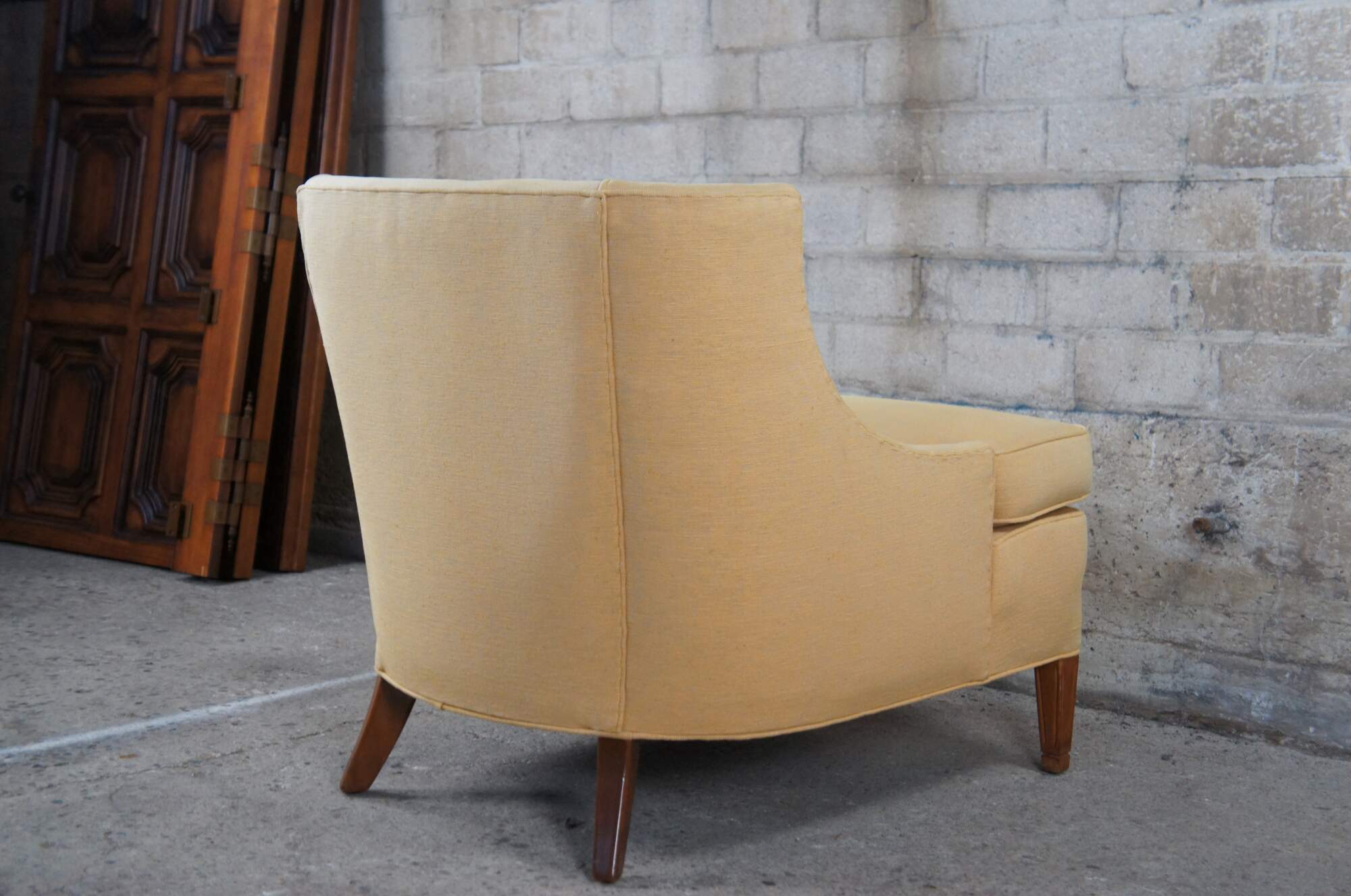 Pair of Mid Century Slipper Wingback Chairs by Baker Furniture. A sleek design with light yellow cotton upholstery and walnut finished square tapered legs.