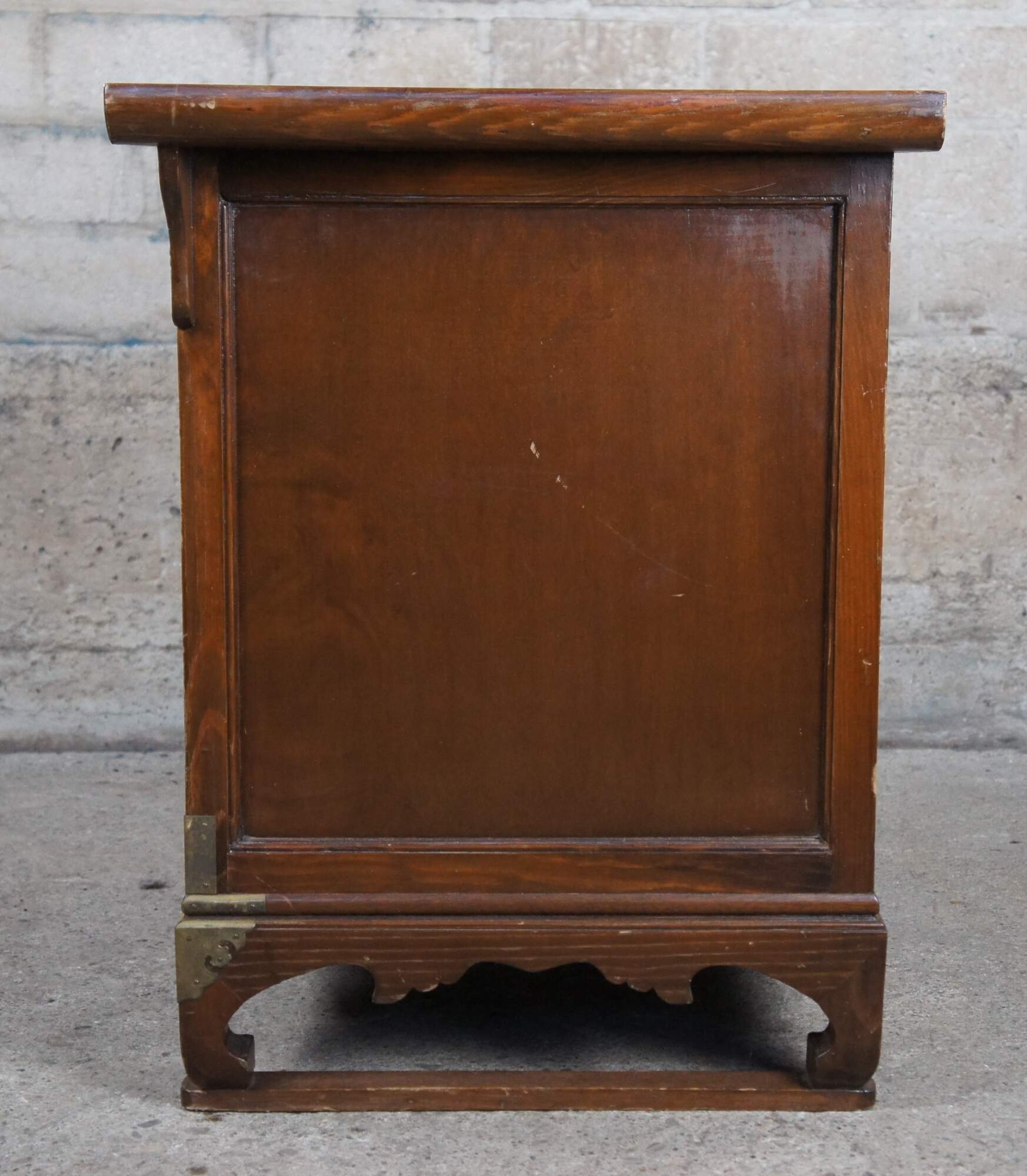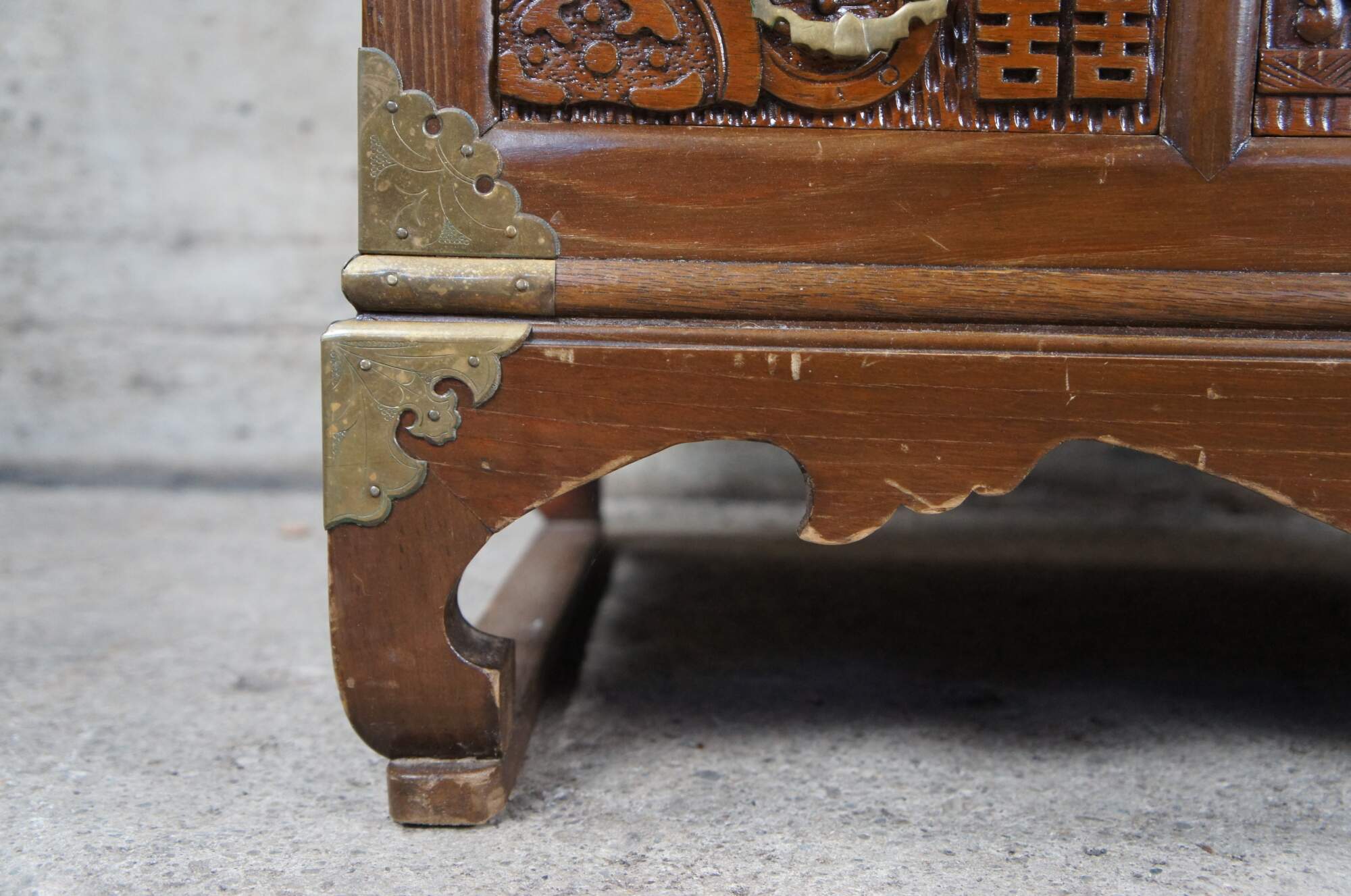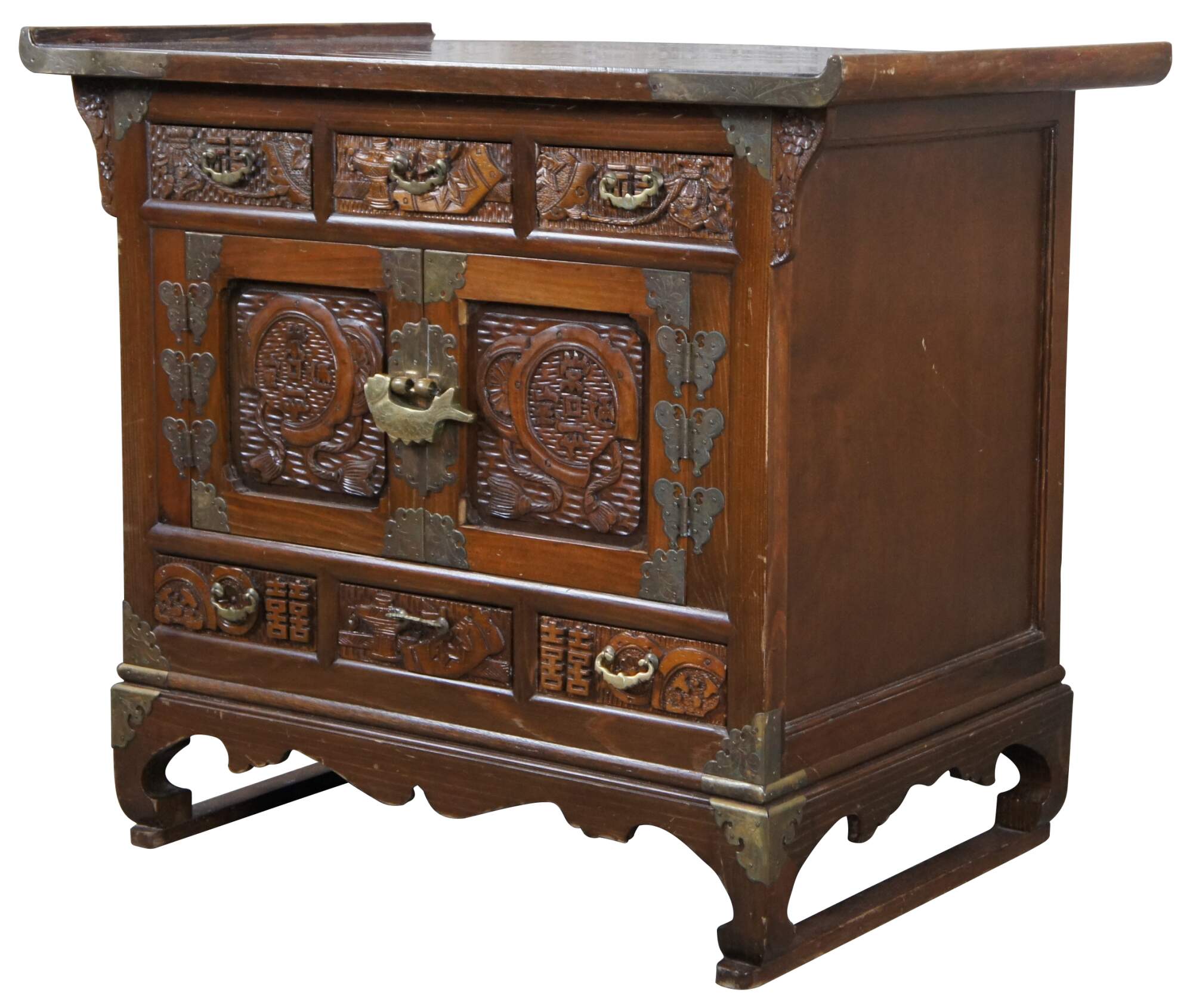 Antique Chinese Chinoiserie Tansu chest, nightstand or side table. Made of pine with a rosewood top featuring traditional form with six high relief carved drawers that feature brass hardware, flanked by central cabinet, and flared surface with inset coins.