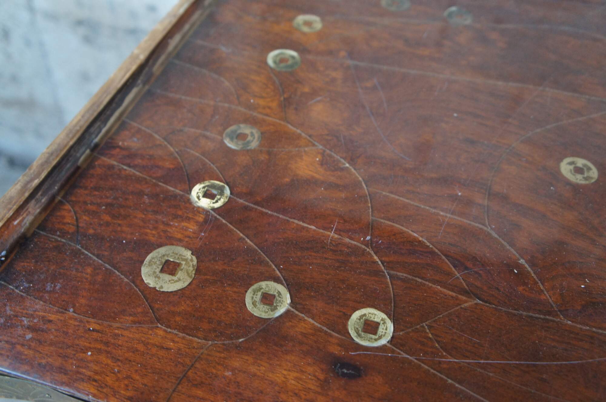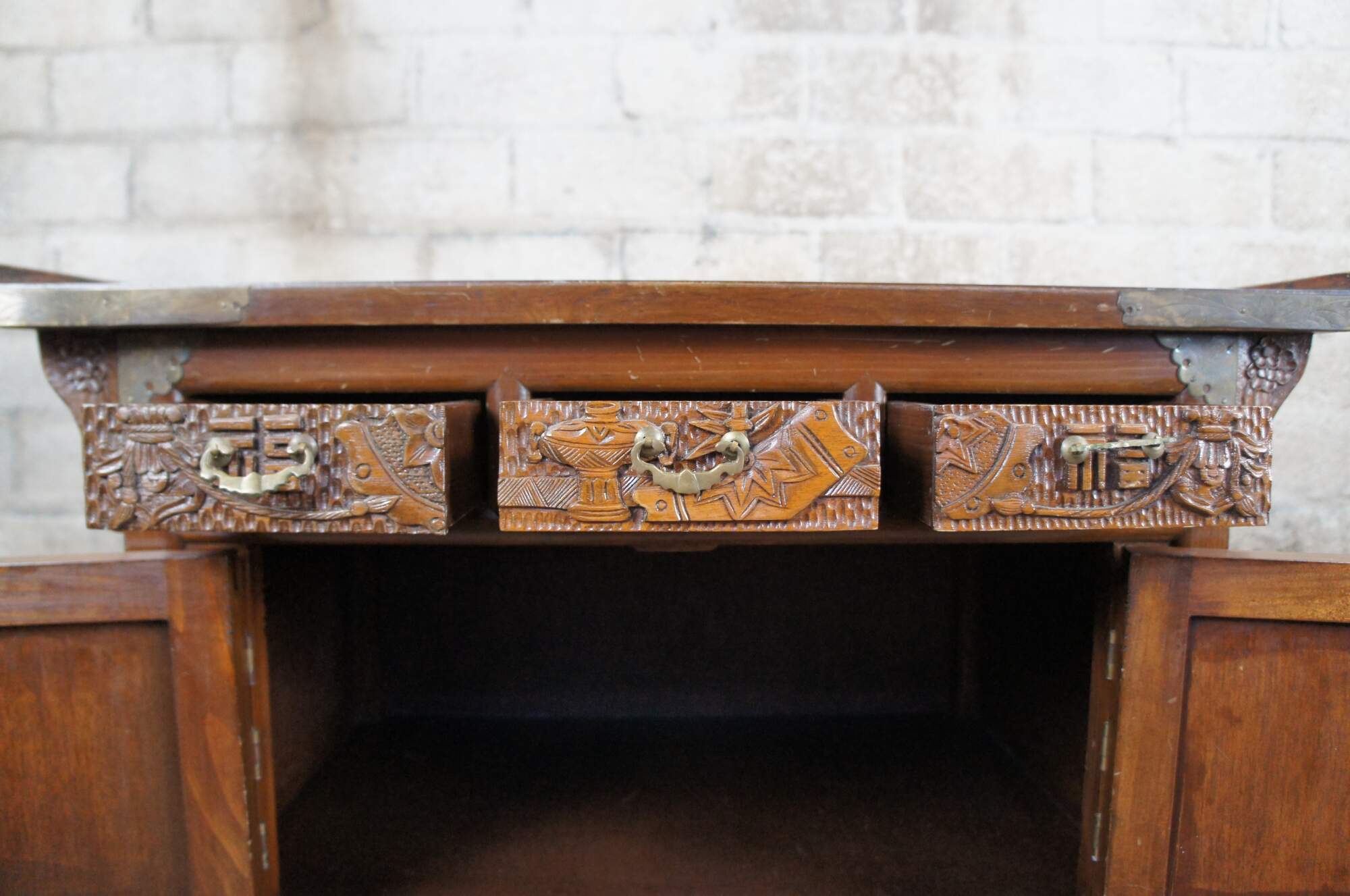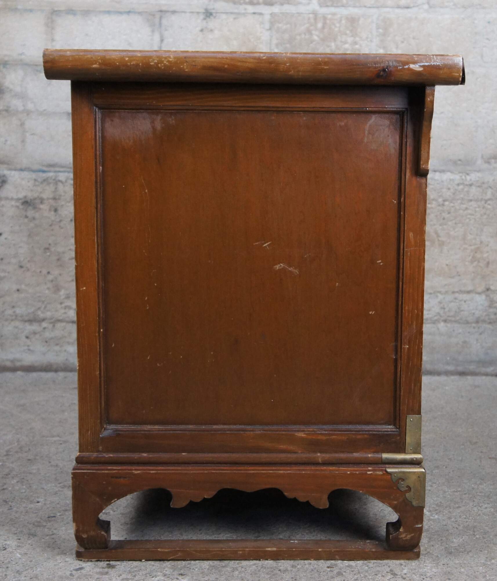 Antique Chinese Chinoiserie Tansu chest, nightstand or side table. Made of pine with a rosewood top featuring traditional form with six high relief carved drawers that feature brass hardware, flanked by central cabinet, and flared surface with inset coins.