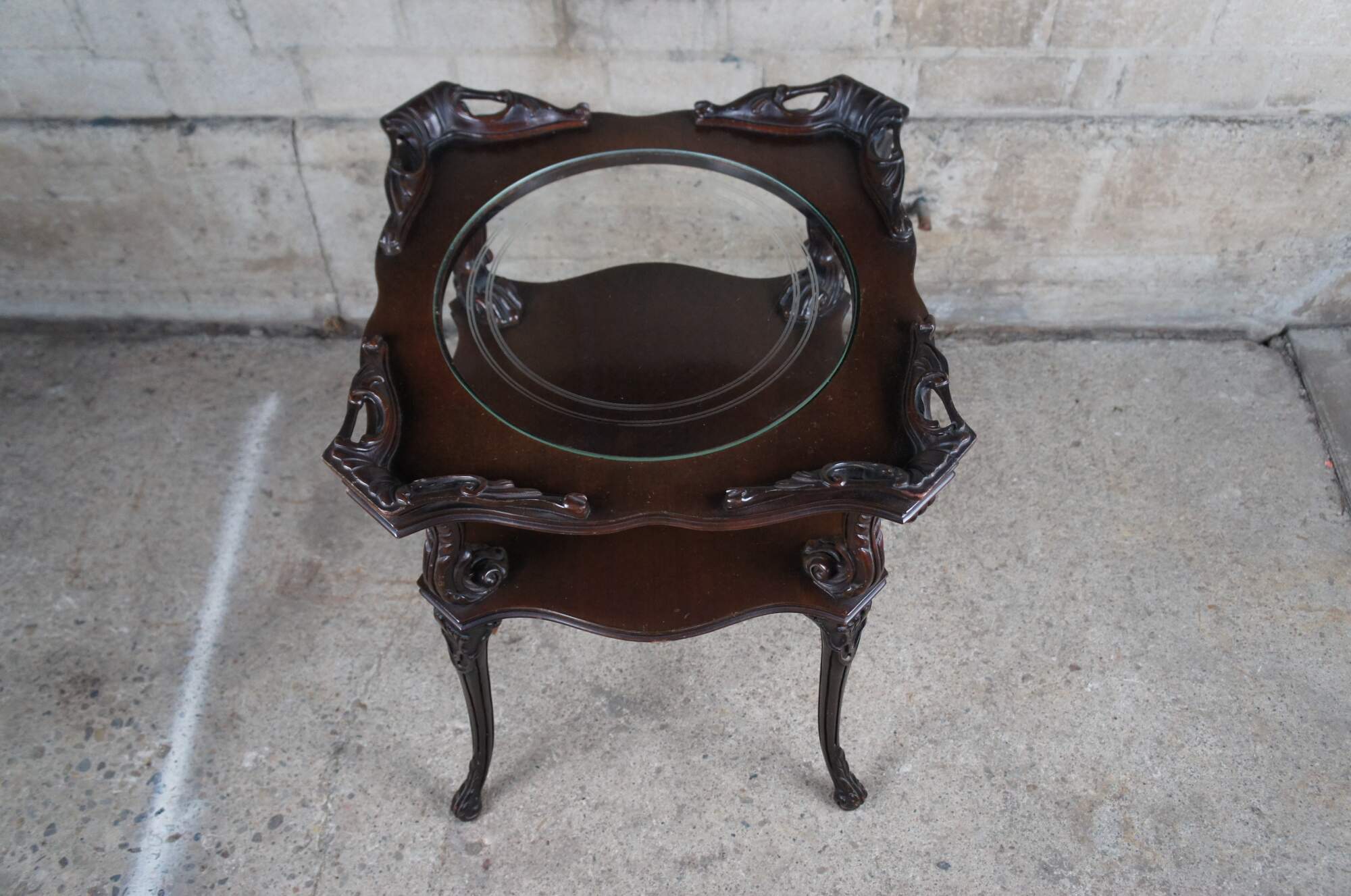 Adams Always Fine Furniture Louis XV style tiered end tables, circa 1930-40s. Beautifully designed with acanthus and scalloped details. Features an inset round glass top resting on a raised wooden top supported by ""s"" scrolls with raised and carved details along each corner. The circular glass inserts have a round frosted detail along the underside. Supported by long cabriole legs terminating into ""c"" scrolled feet. Made in America