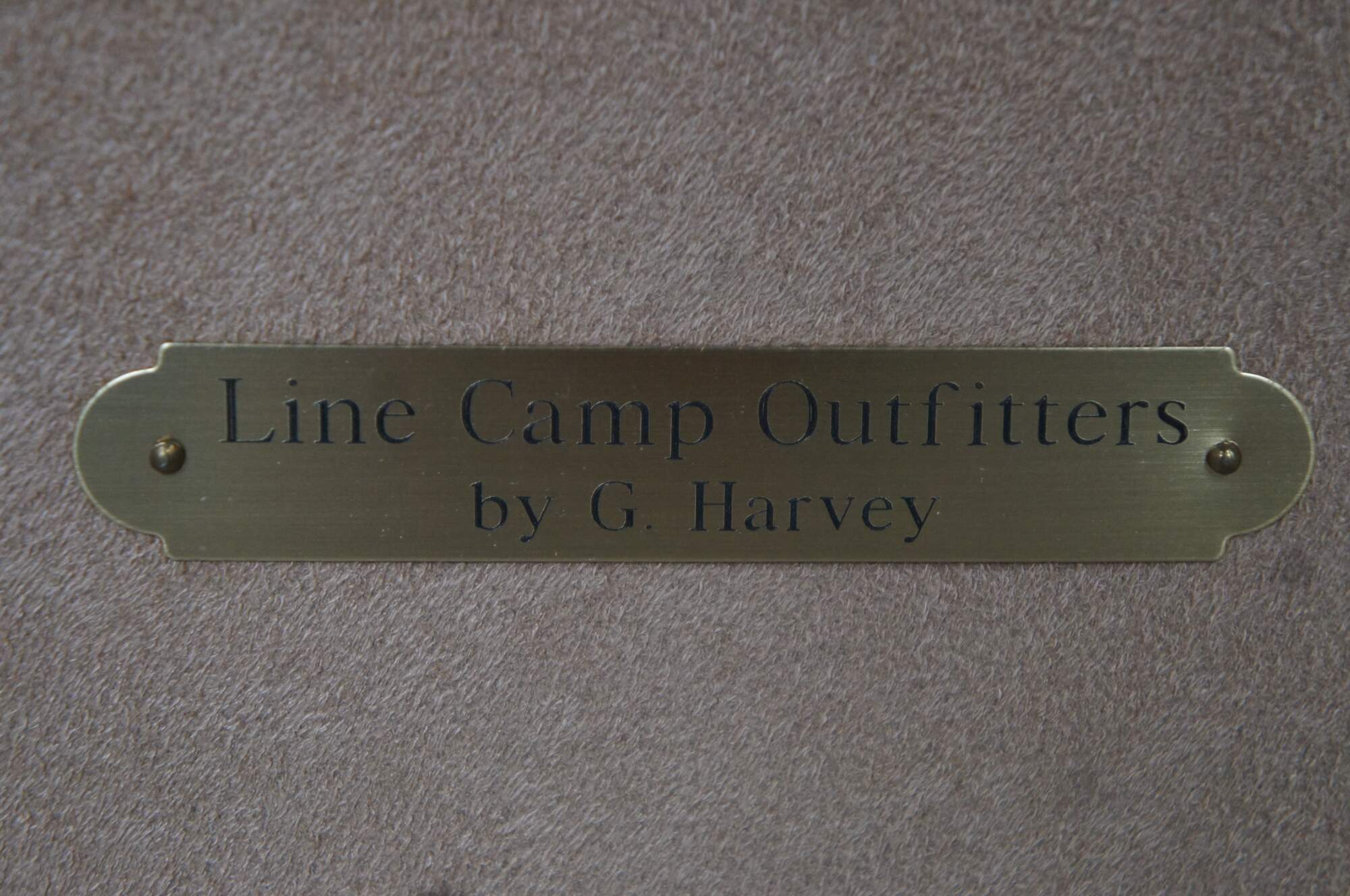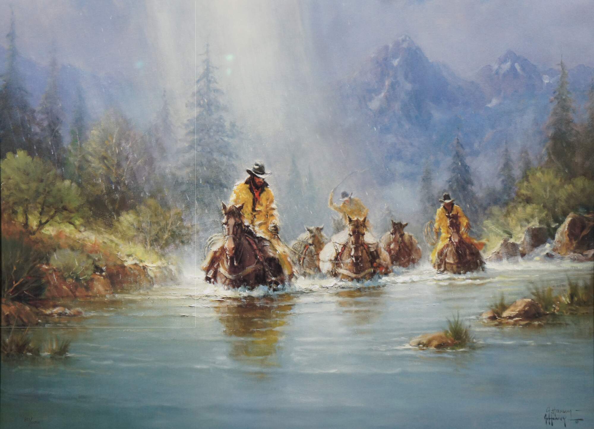 Vintage signed and framed limited edition print showing an equestrian scene with Western American cowboys riding horses through a river in a mountain landscape. Titled “Line Camp Outfitters” by G. Harvey, issued in 1999 by Somerset House Publishing, number 811/1500. Includes COA.