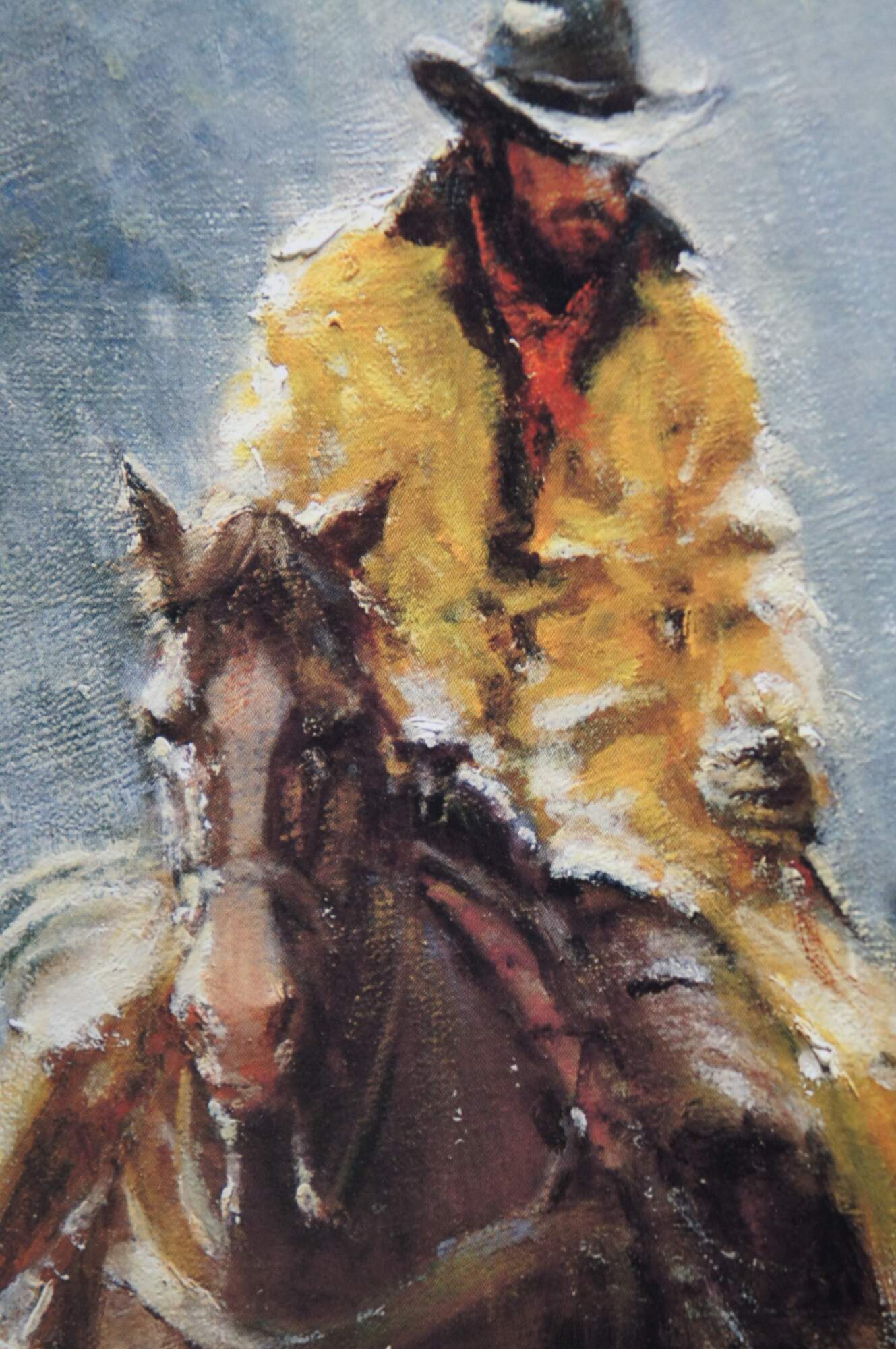 “Gerald Harvey Jones was born in San Antonio, Texas, in 1933. His grandfather was a cowboy during the trail-driving era when legends grew up along the dusty trails north from Texas. Family stories of wild cattle and tough men were absorbed by a wide-eyed boy and became the genesis of G. Harvey's art. A graduate in fine arts at North Texas State University, Harvey taught full-time and painted nights and weekends for several years. It was through painting that he found his greatest satisfaction, and his native central Texas hill country provided the inspiration for most of his earliest work.