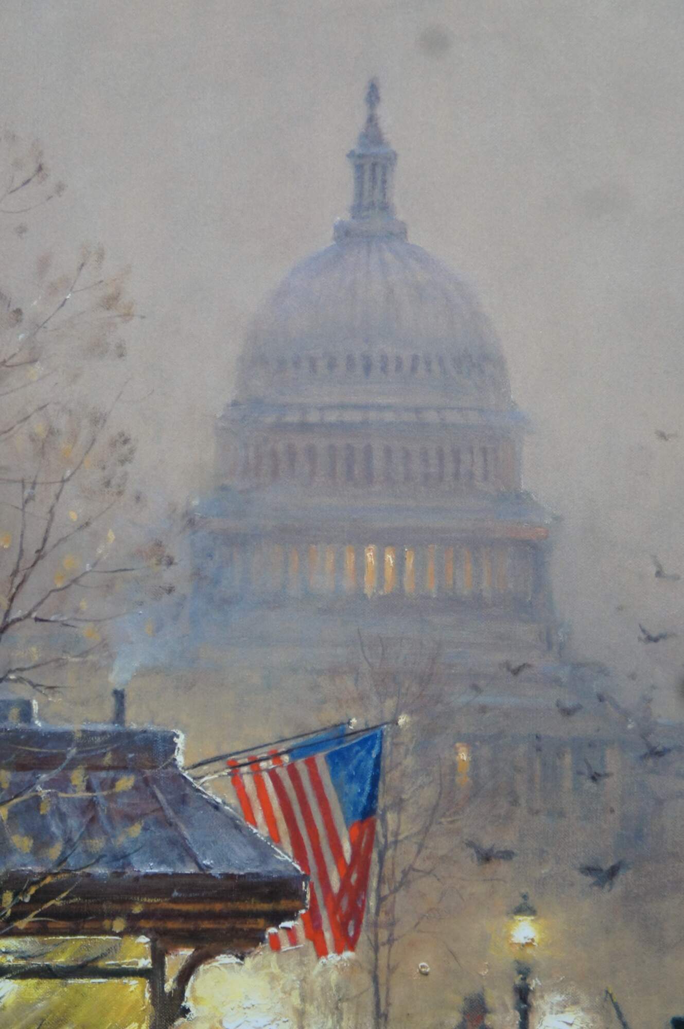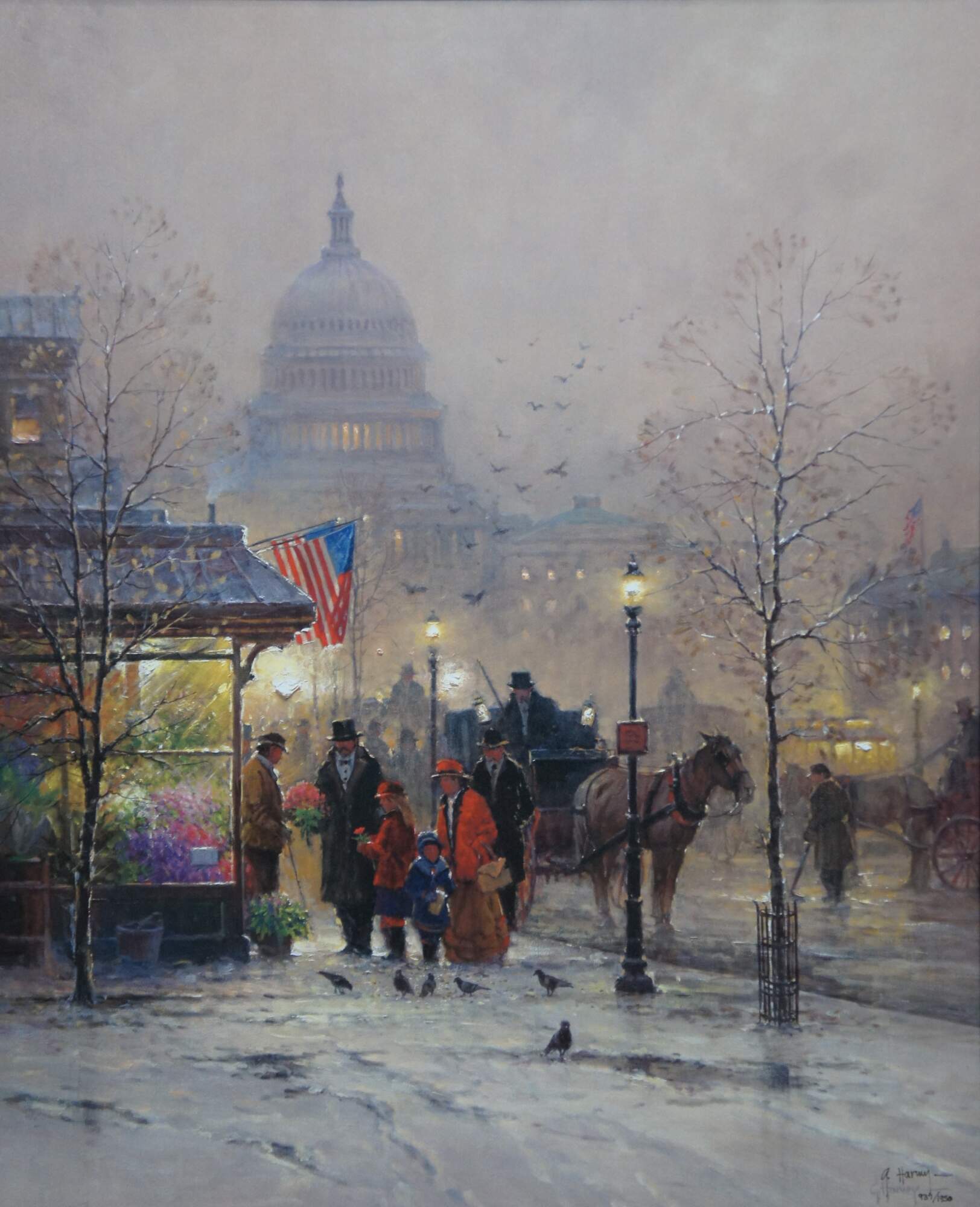 Vintage limited edition print showing Victorian era figures at a flower shop with horse and carriage in the street below the Capitol building, titled “A Nation Blessed” by G. Harvey. Issued in 1997 by Somerset House Publishing, signed and numbered 937/1950.
