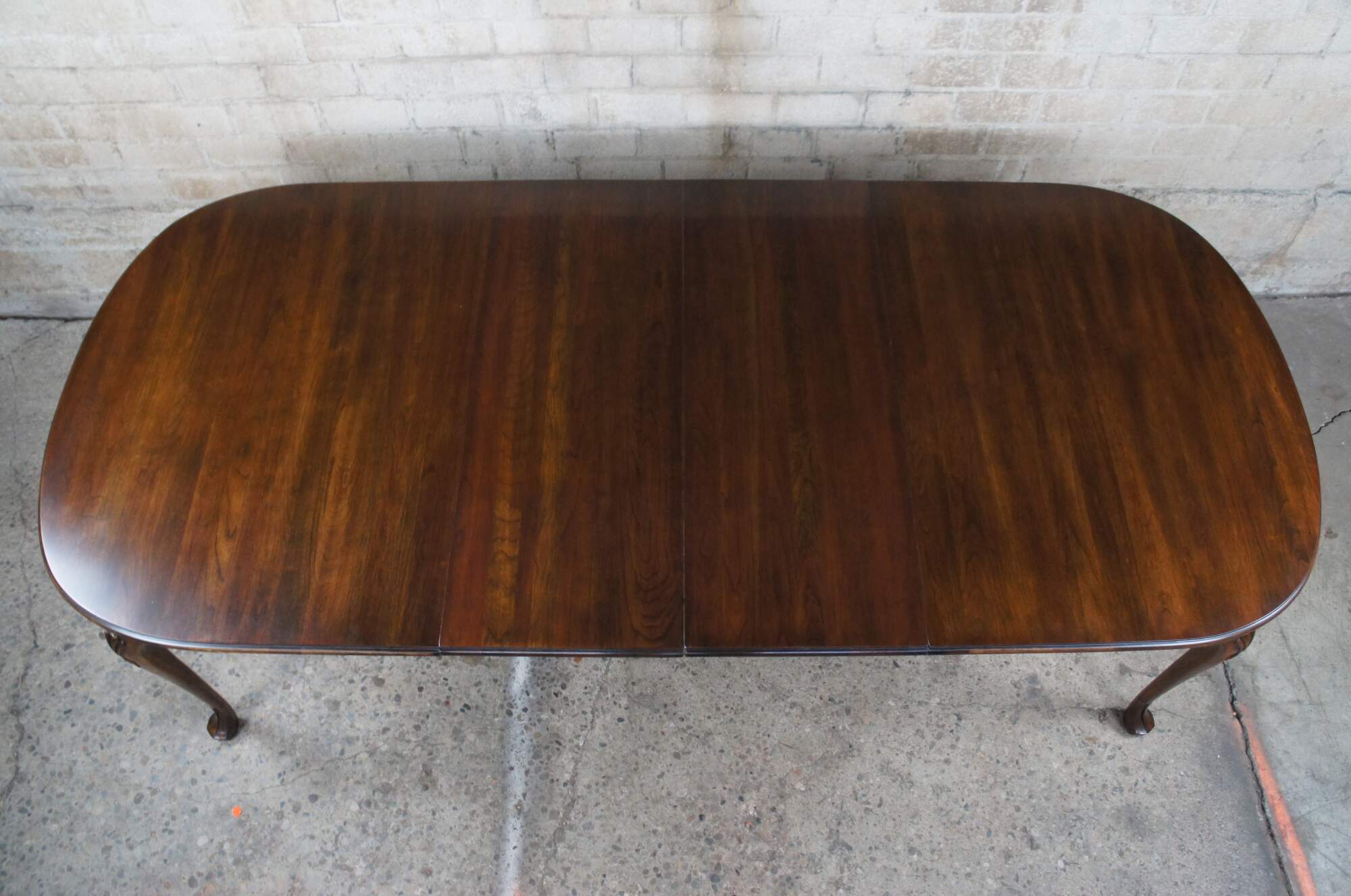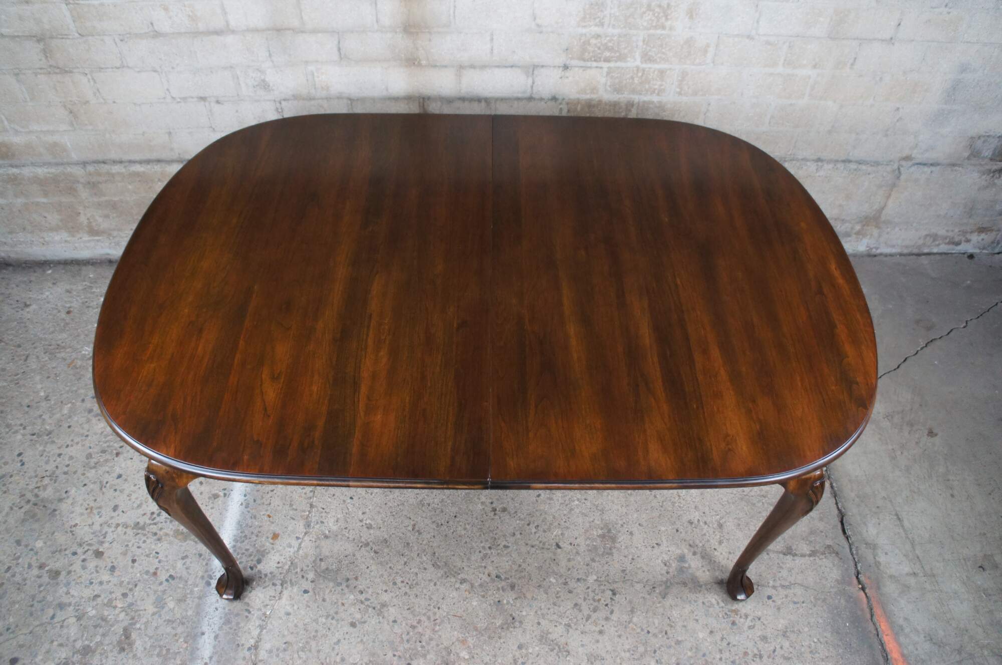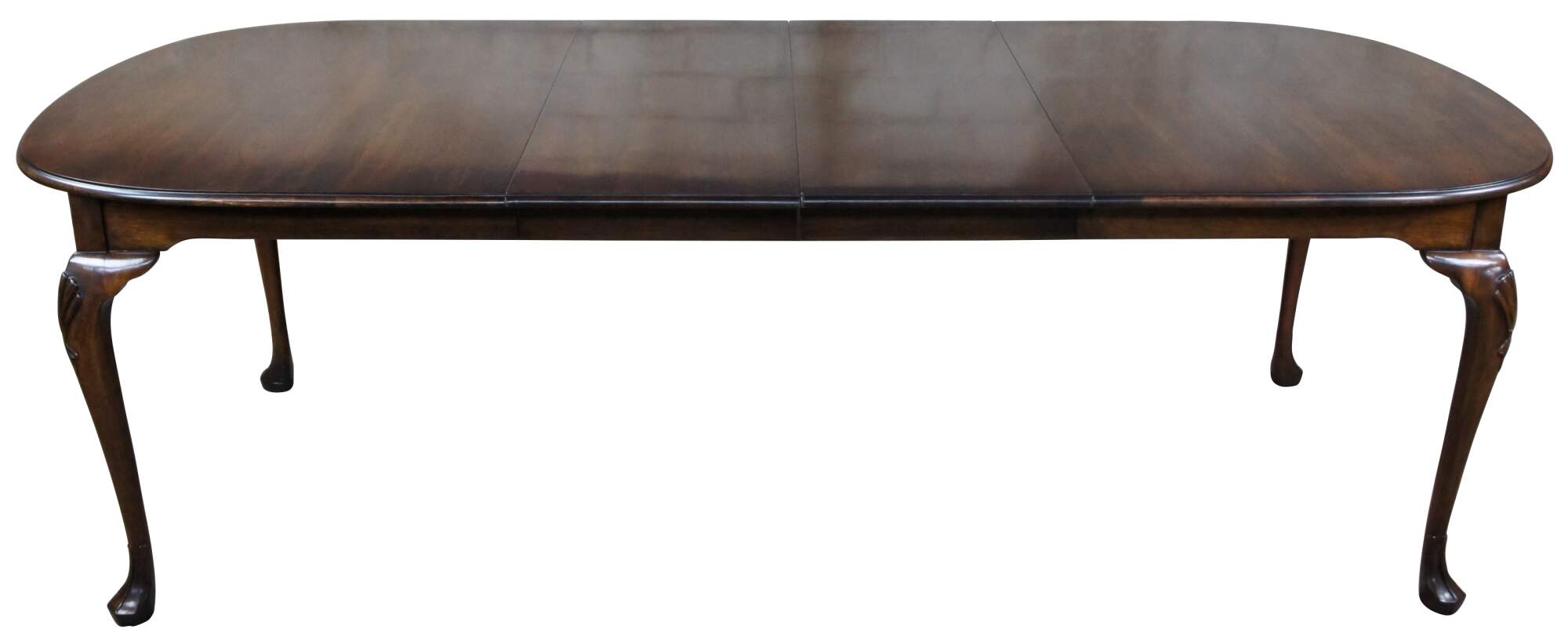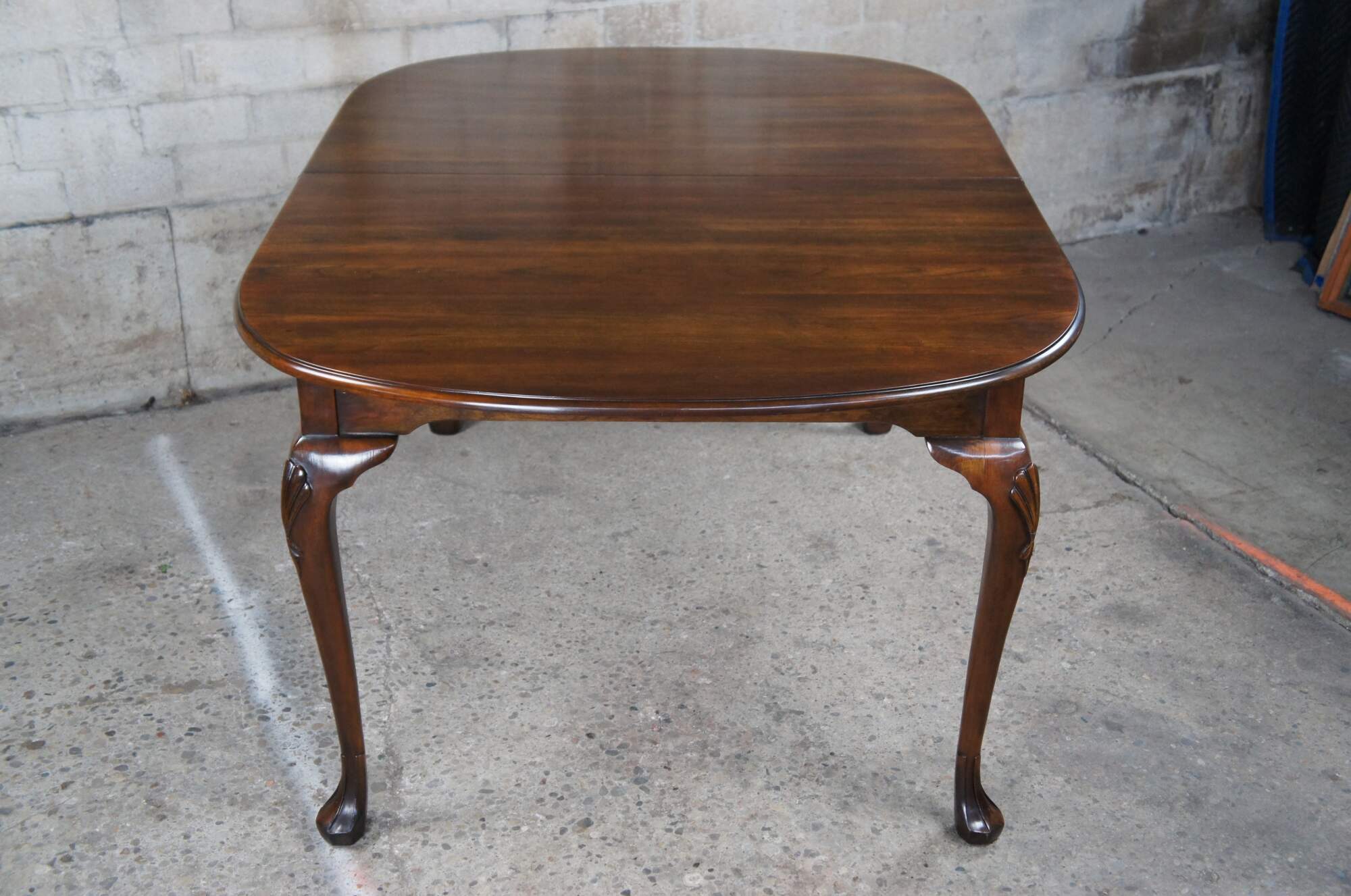 A beautiful Harden Furniture Queen Anne extendable dining table, circa 1958. An oval form made from solid cherry with cabriole legs, carved and scalloped knees and trifid feet.
