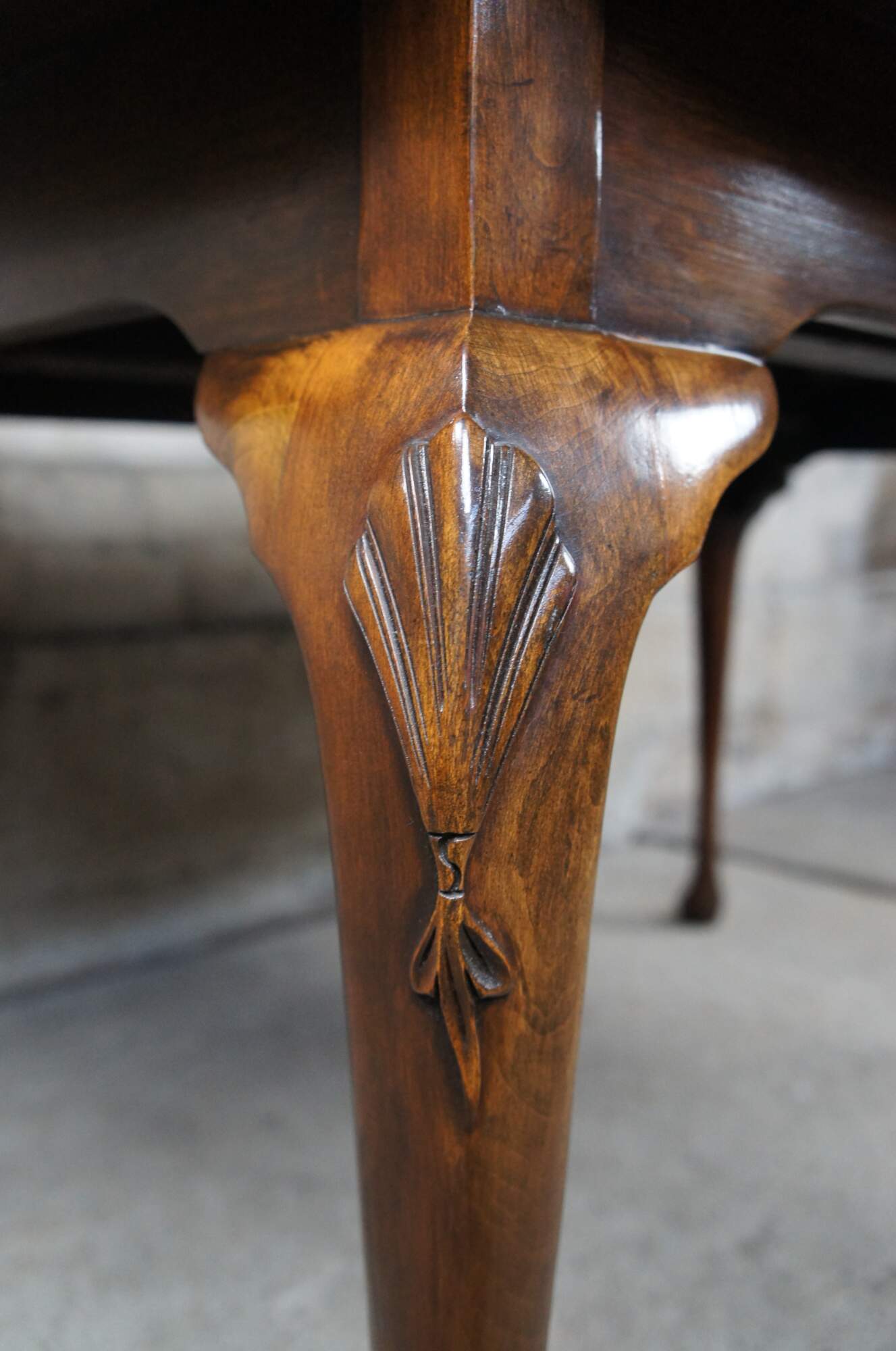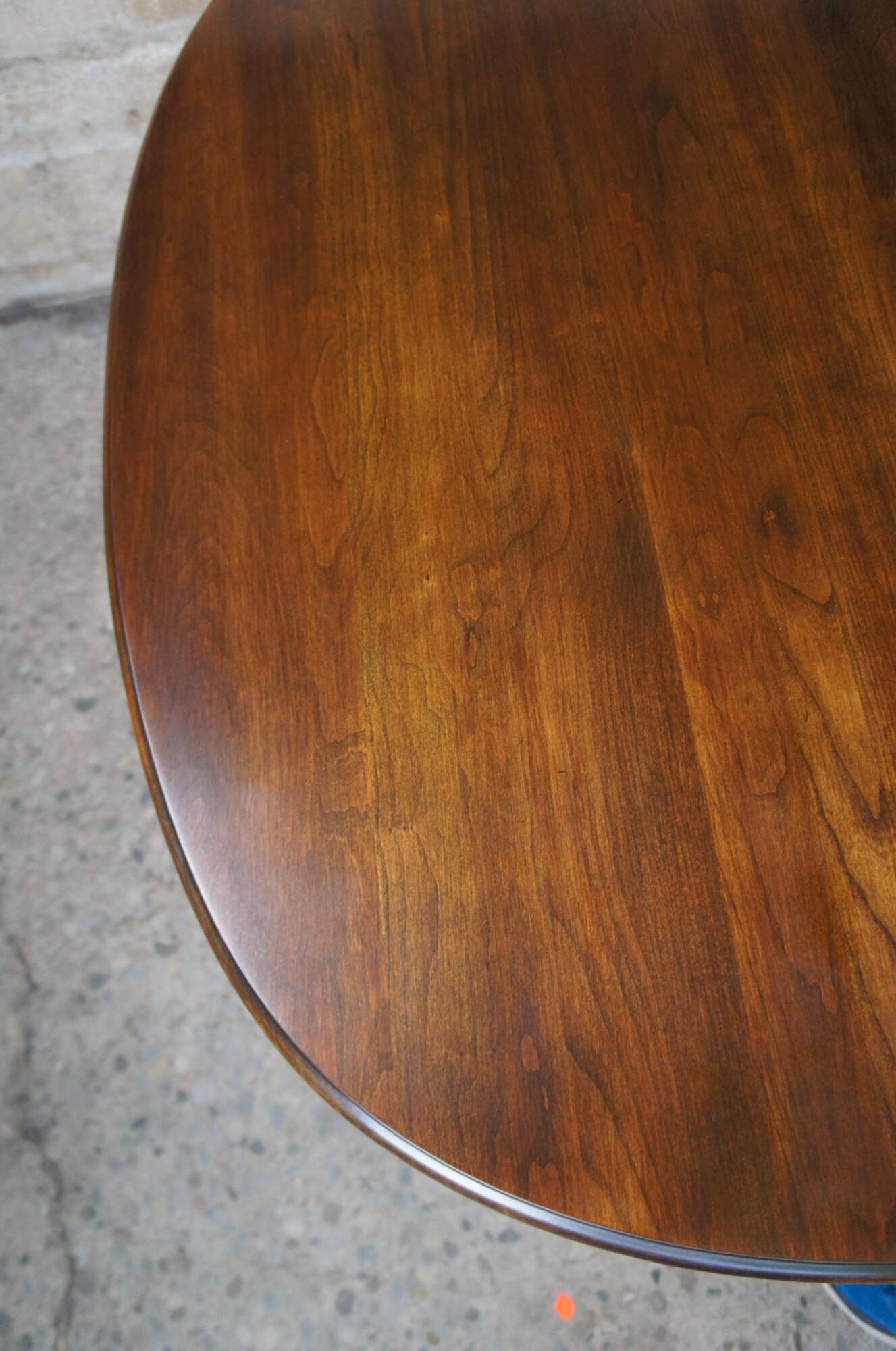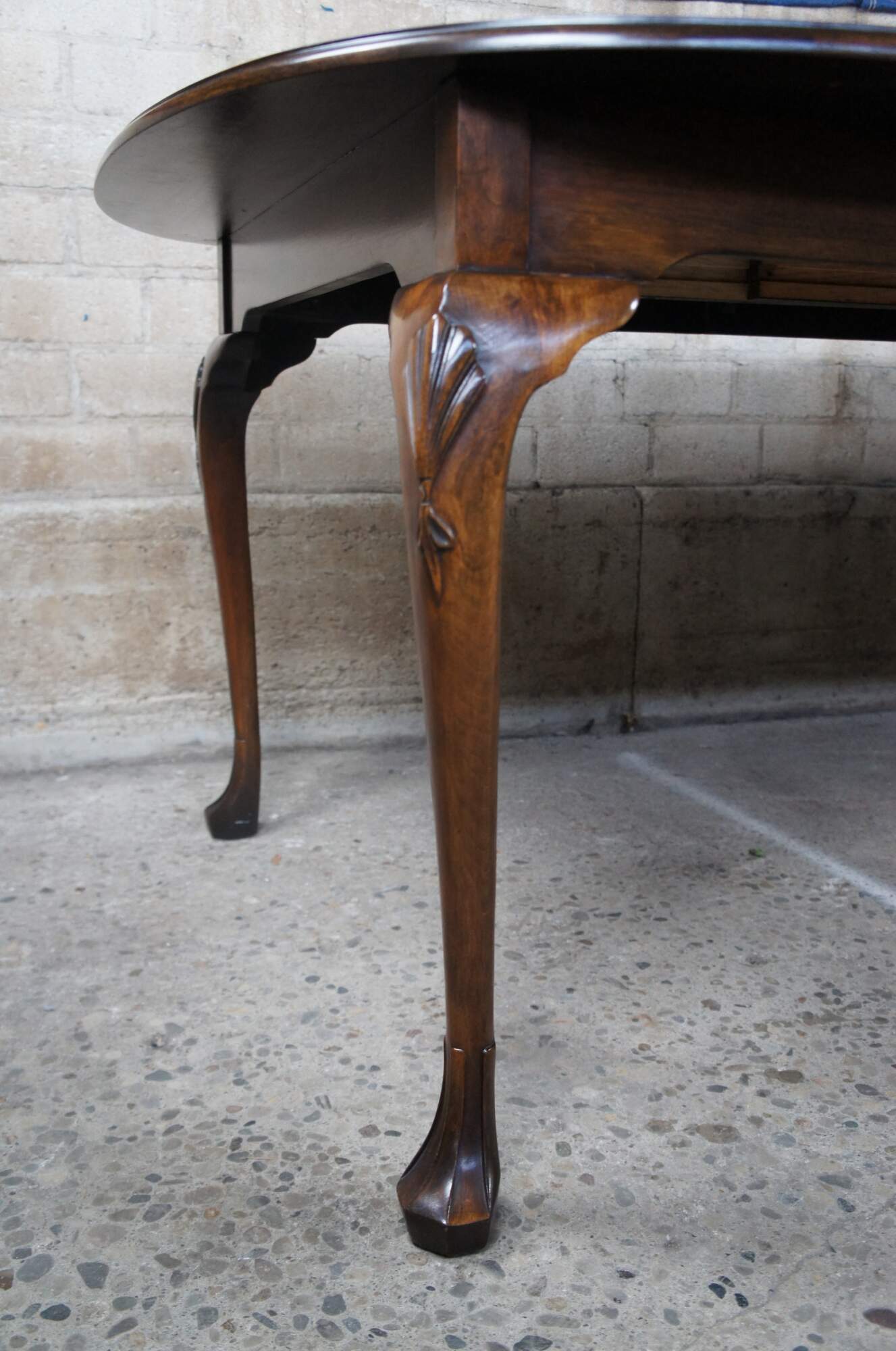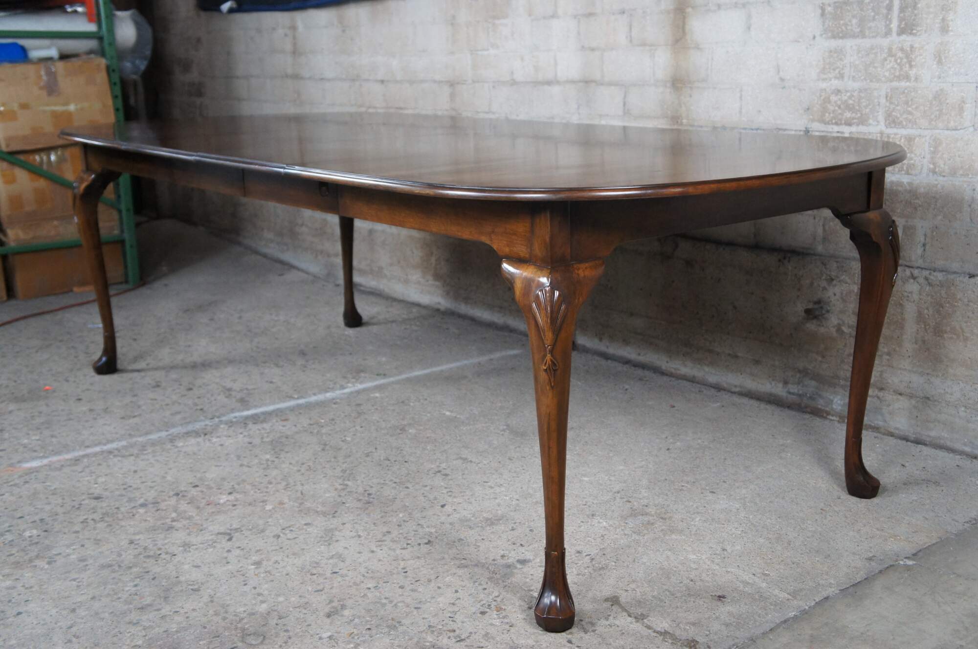 A beautiful Harden Furniture Queen Anne extendable dining table, circa 1958. An oval form made from solid cherry with cabriole legs, carved and scalloped knees and trifid feet.